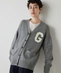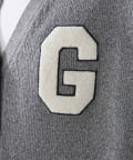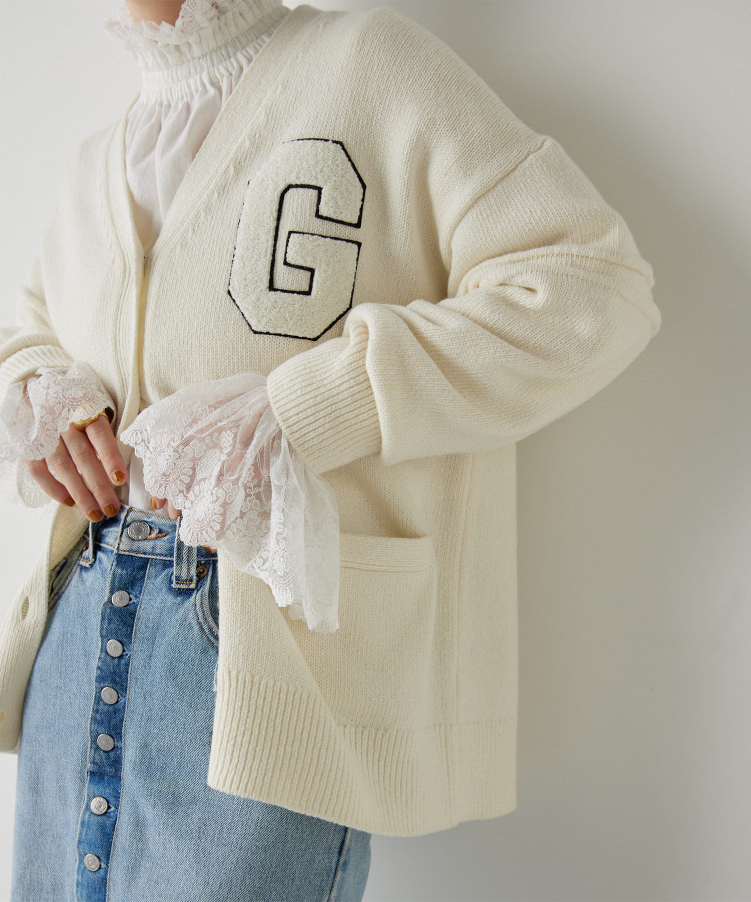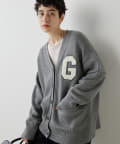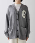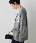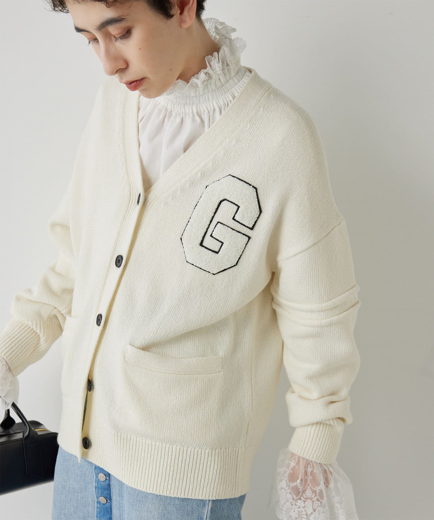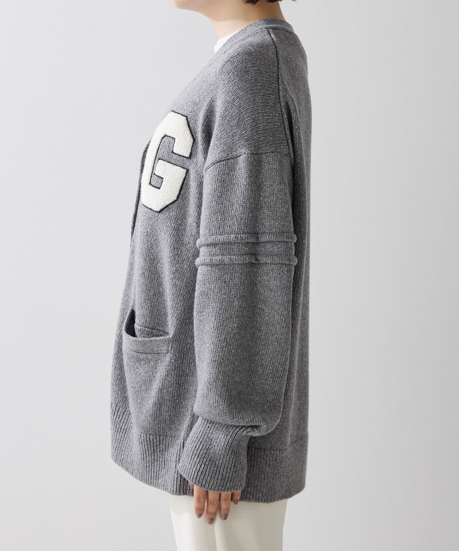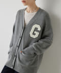 『G』のキャッチーなカーディガン。胸元のロゴがスタイリングのアクセントに。サイズ感も大きめでスウェットやデニムシャツも着込める大きさ。腰周り、ヒップも隠れるのでボトムスのバランスを選ばないです○。