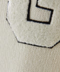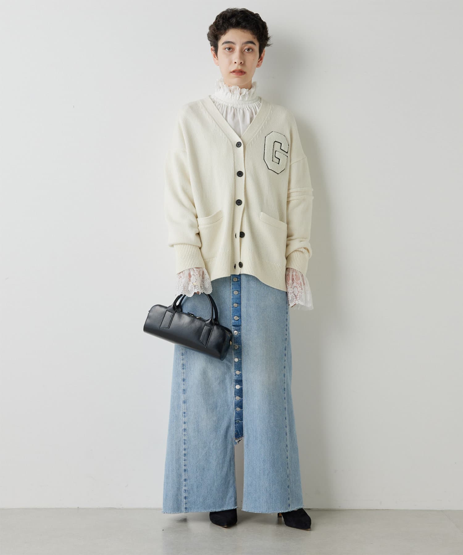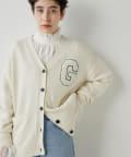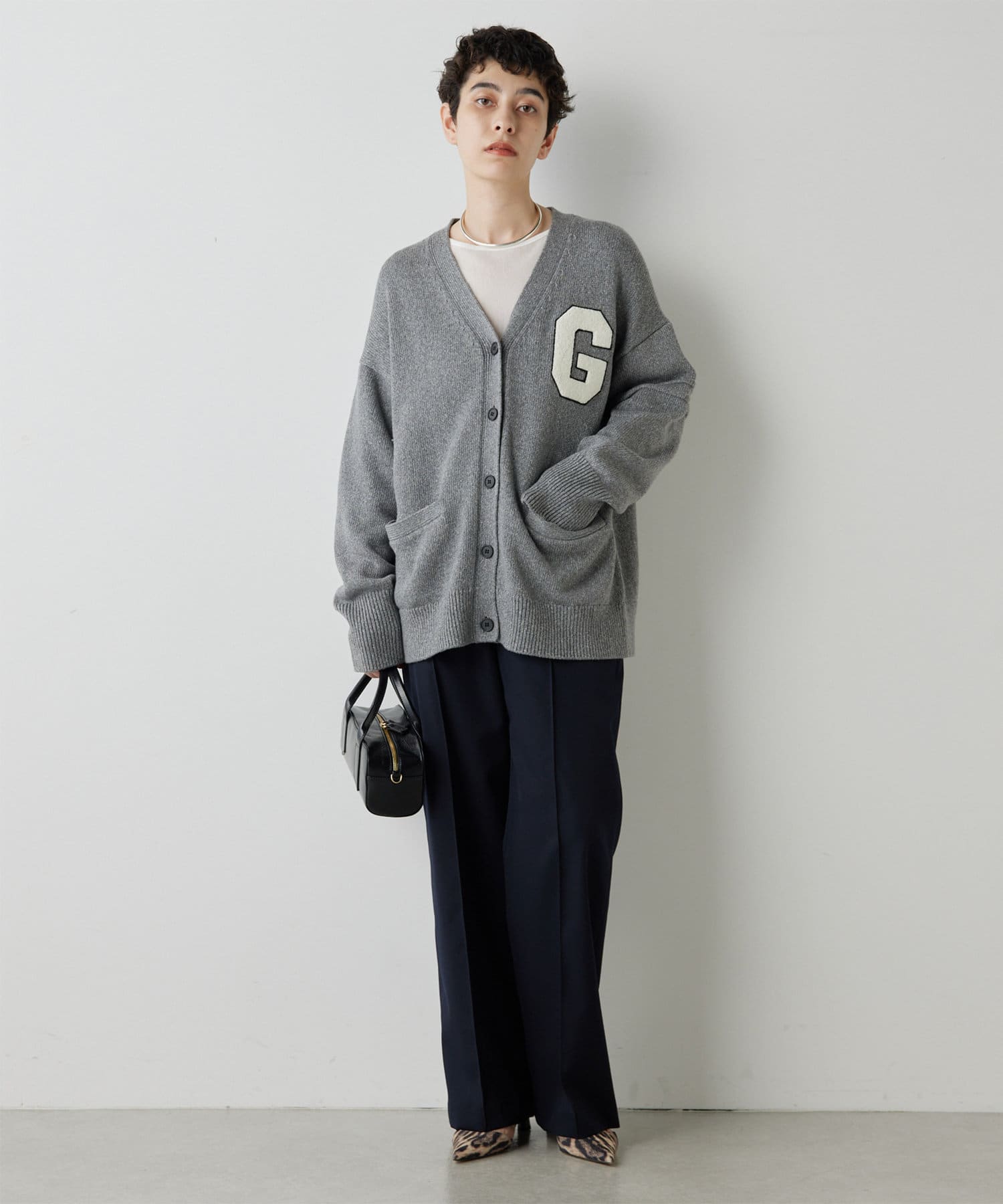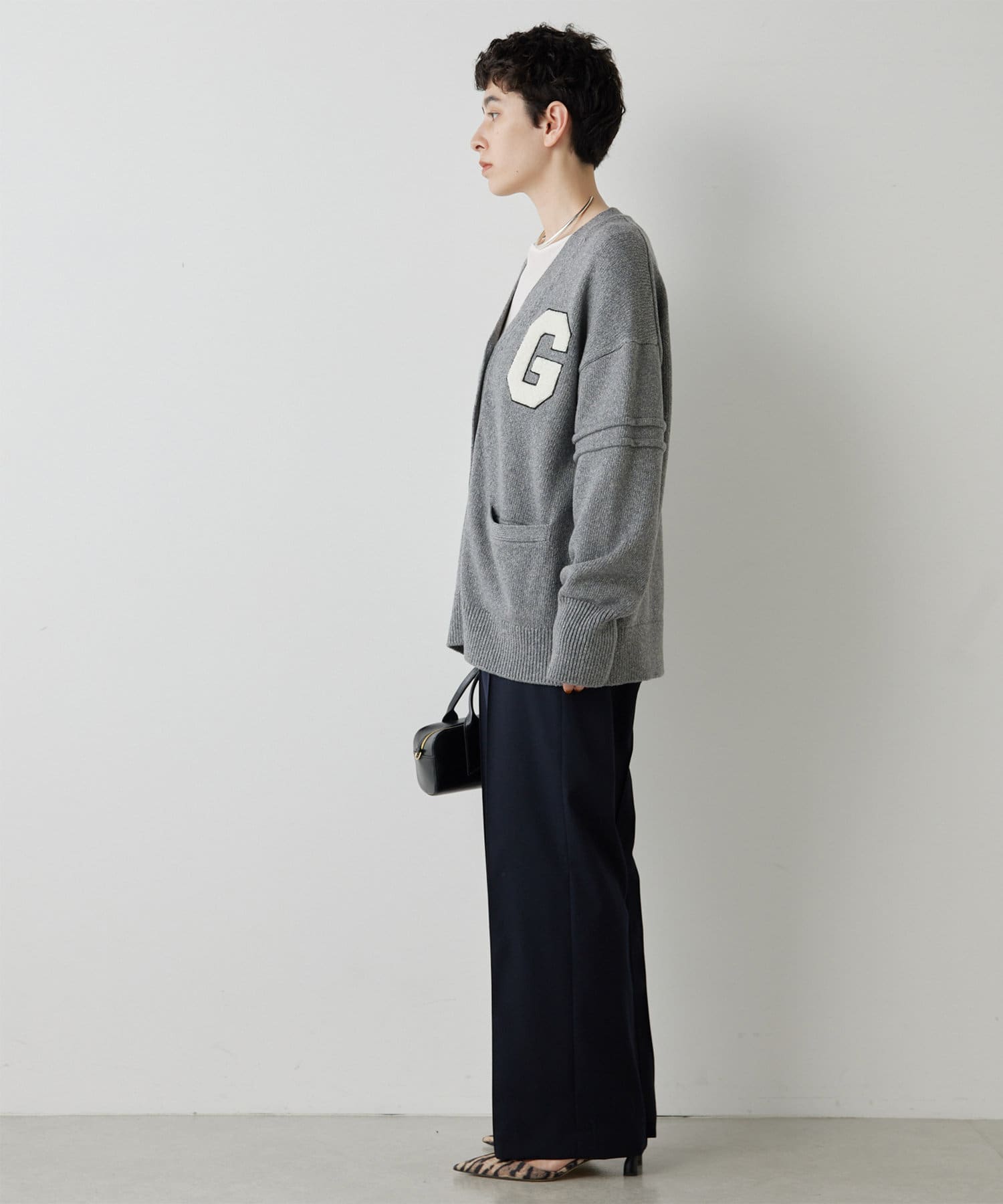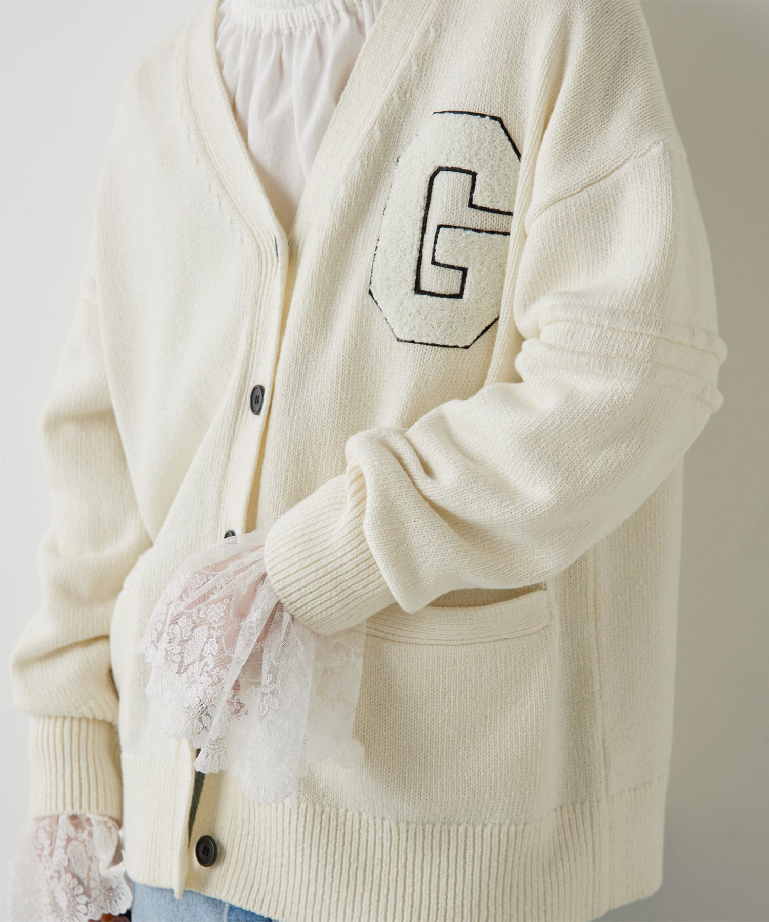 『G』のキャッチーなカーディガン。胸元のロゴがスタイリングのアクセントに。サイズ感も大きめでスウェットやデニムシャツも着込める大きさ。腰周り、ヒップも隠れるのでボトムスのバランスを選ばないです○。