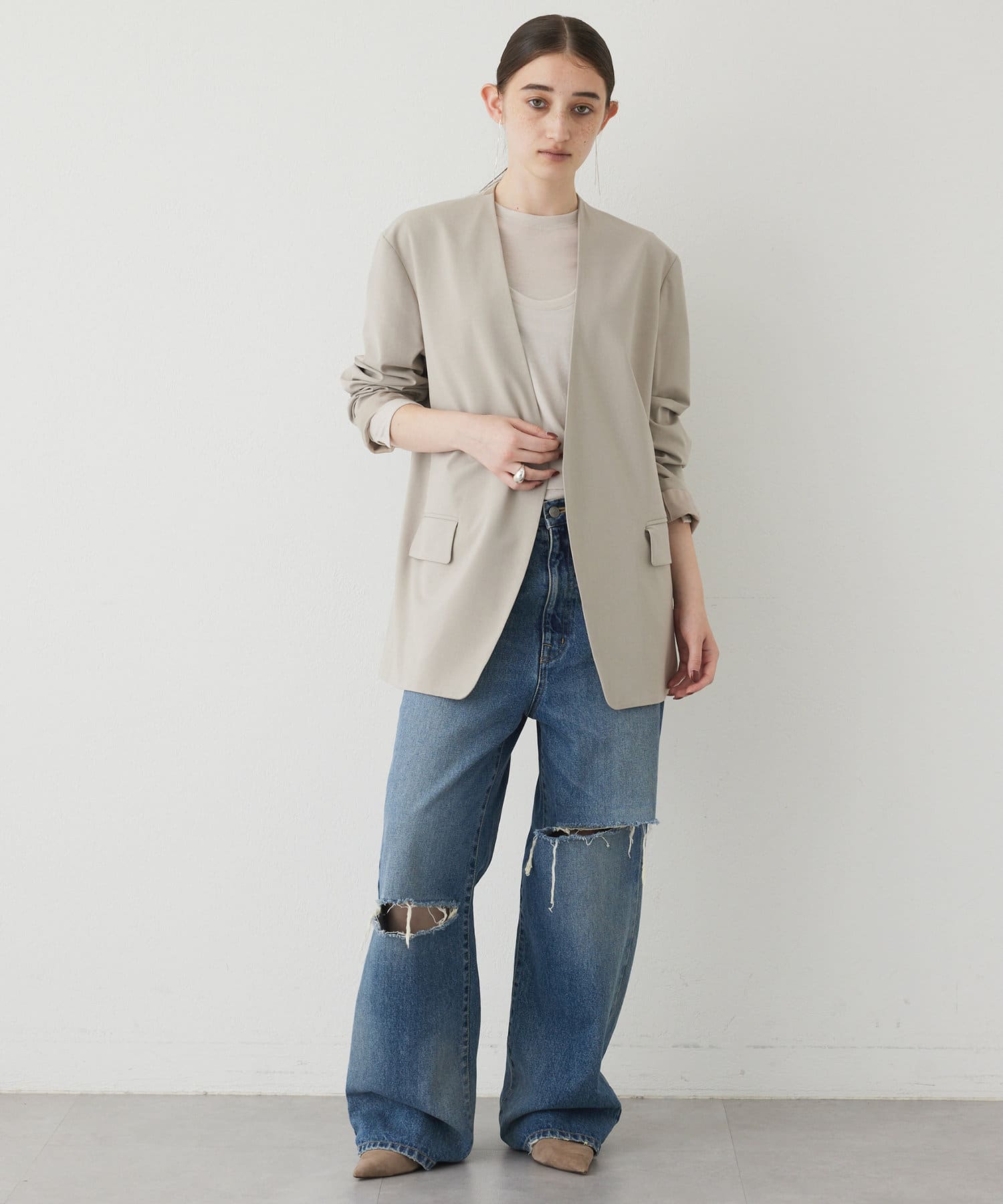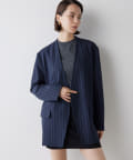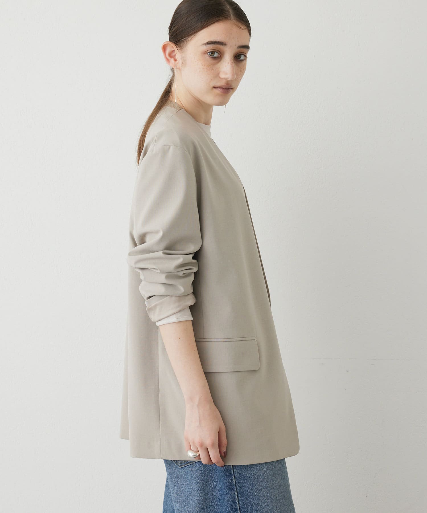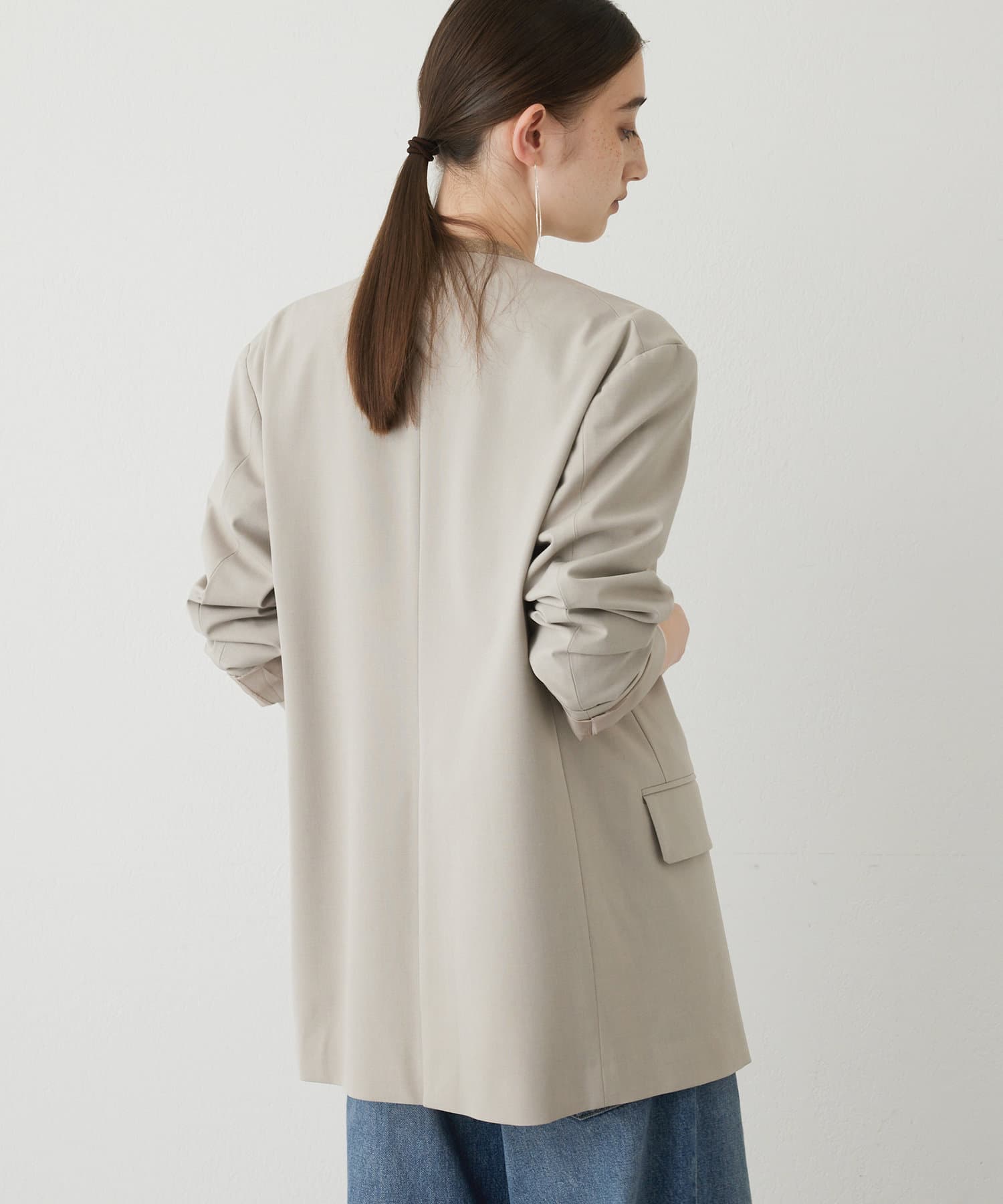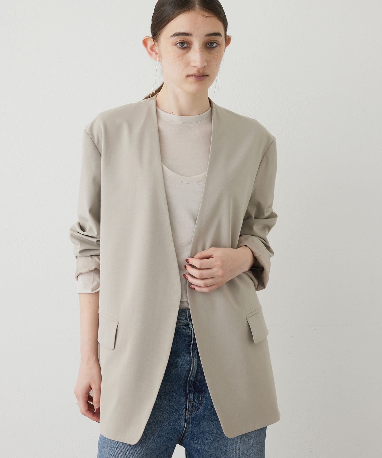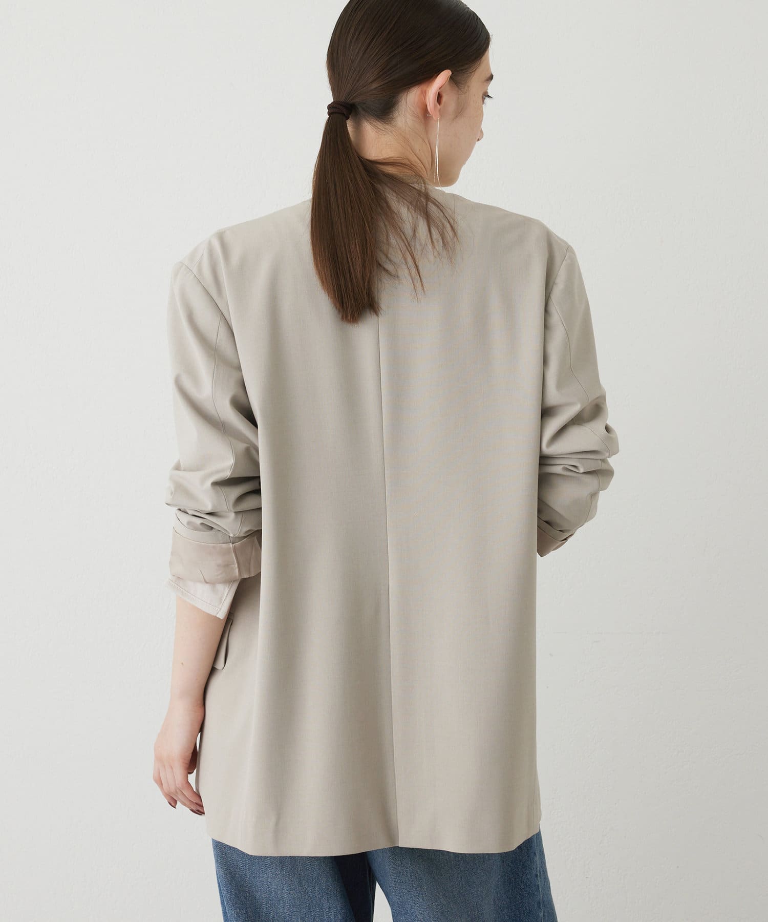■肩の落ちた抜けのあるシルエットと素材感を生かしたノーカラージャケット。
