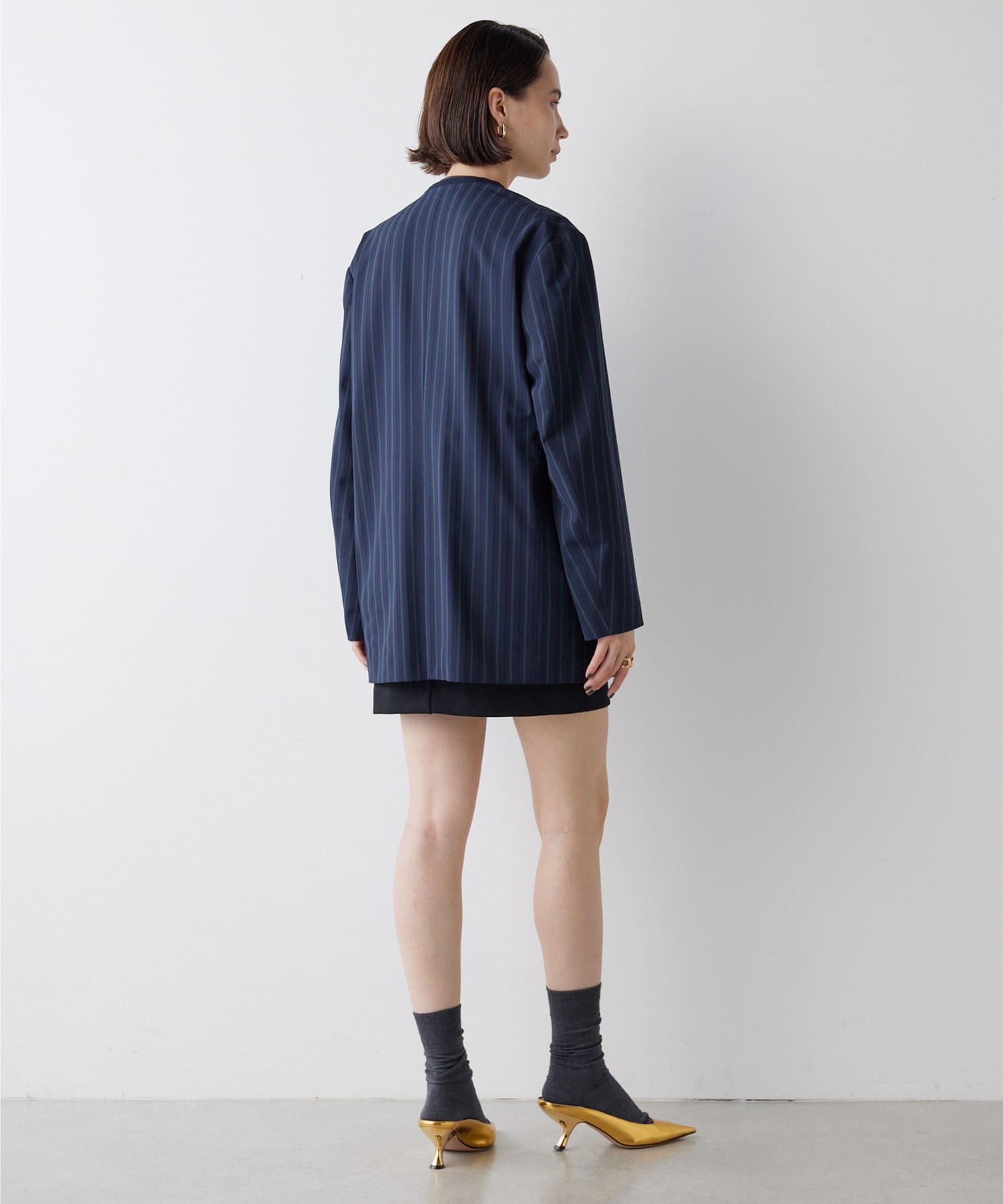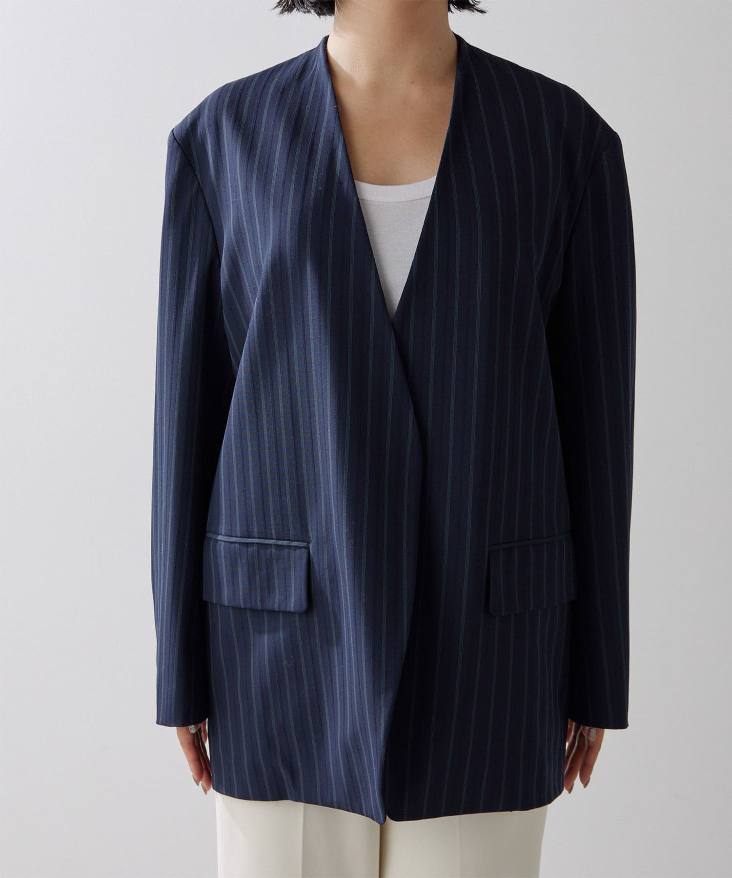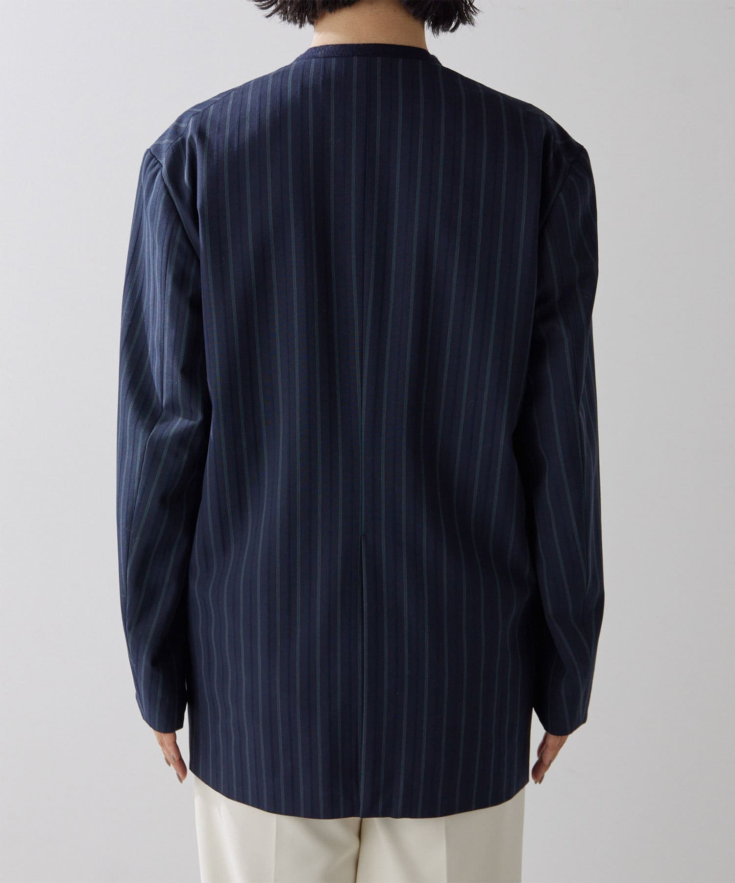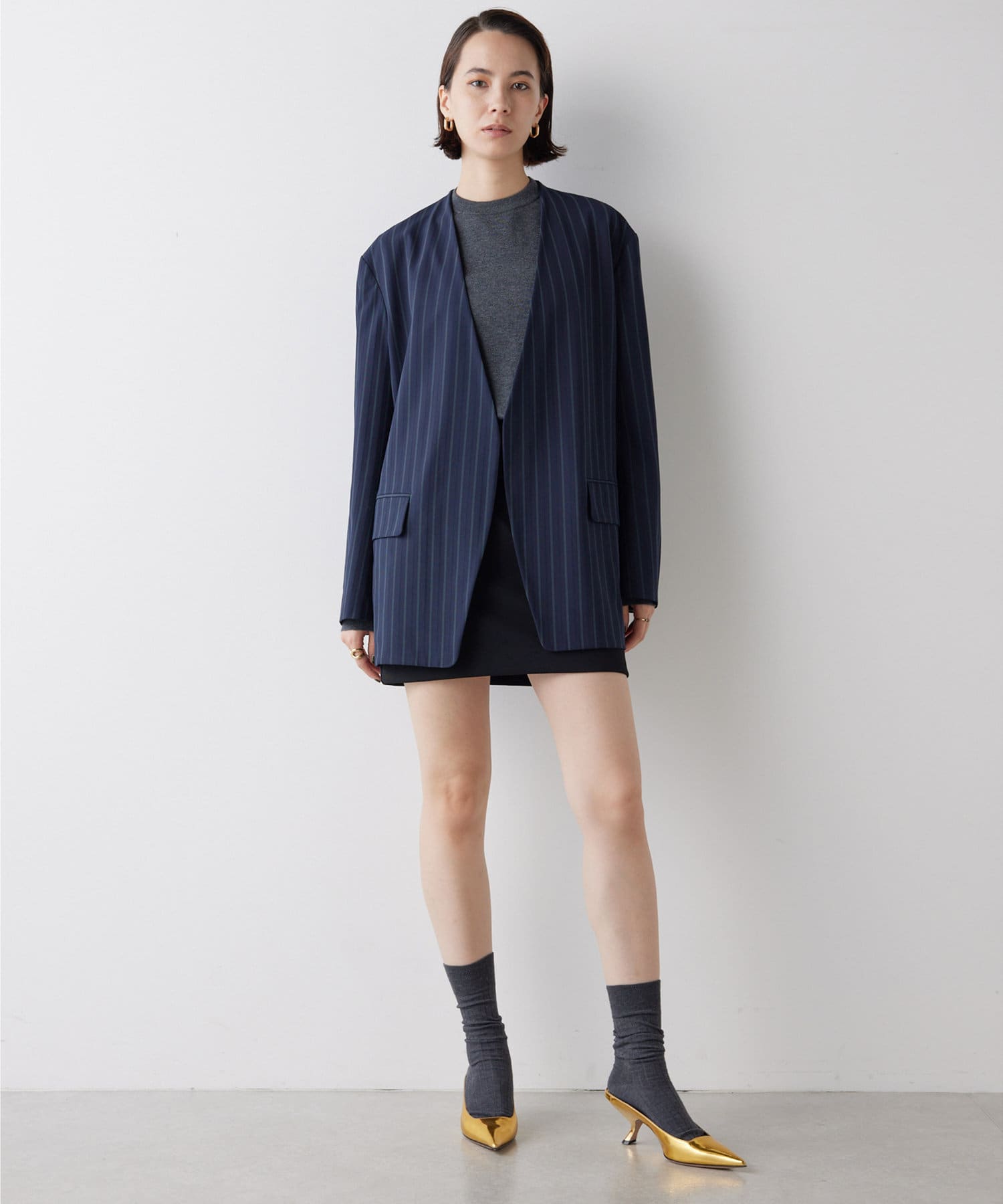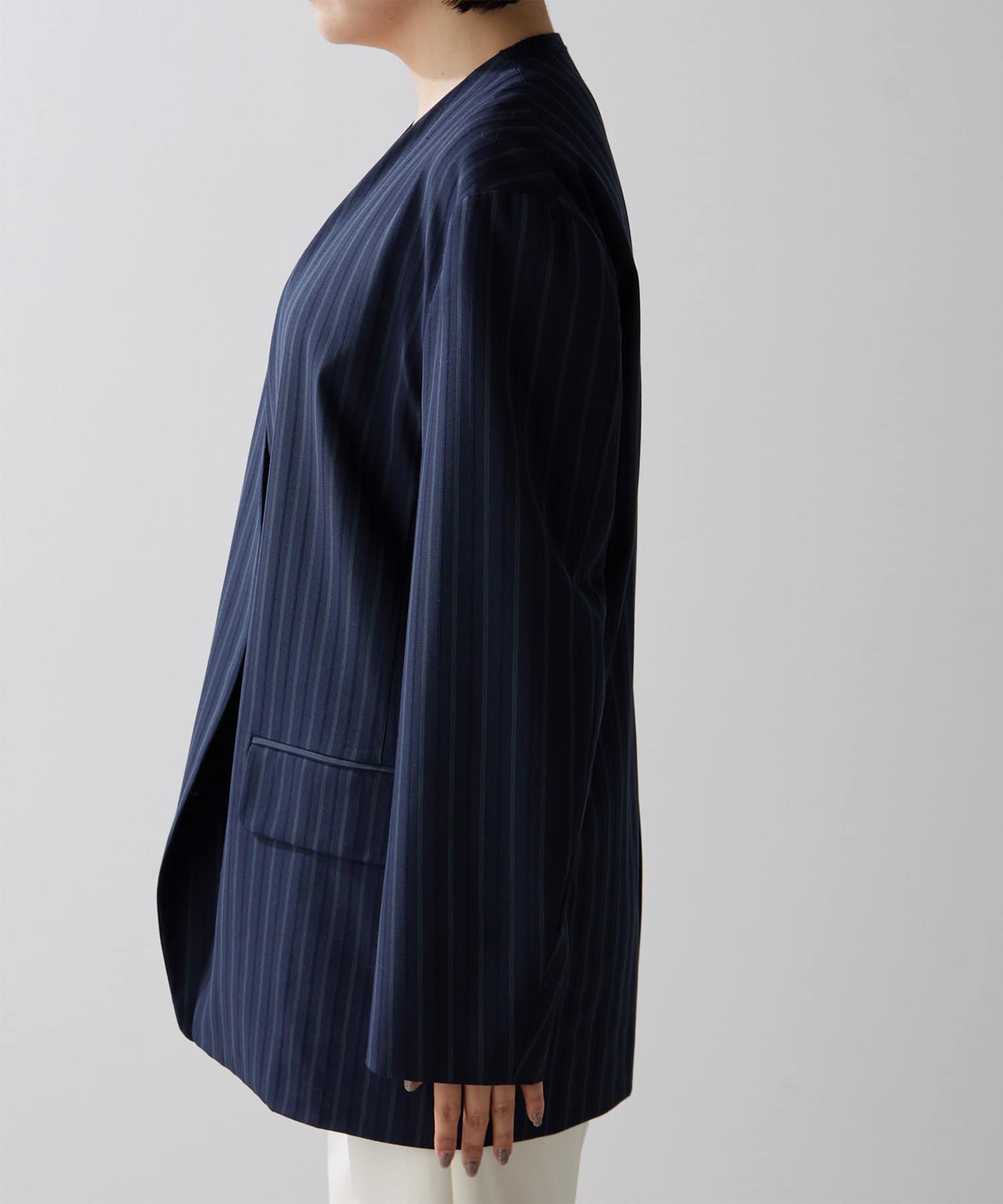 ■肩の落ちた抜けのあるシルエットと素材感を生かしたノーカラージャケット。