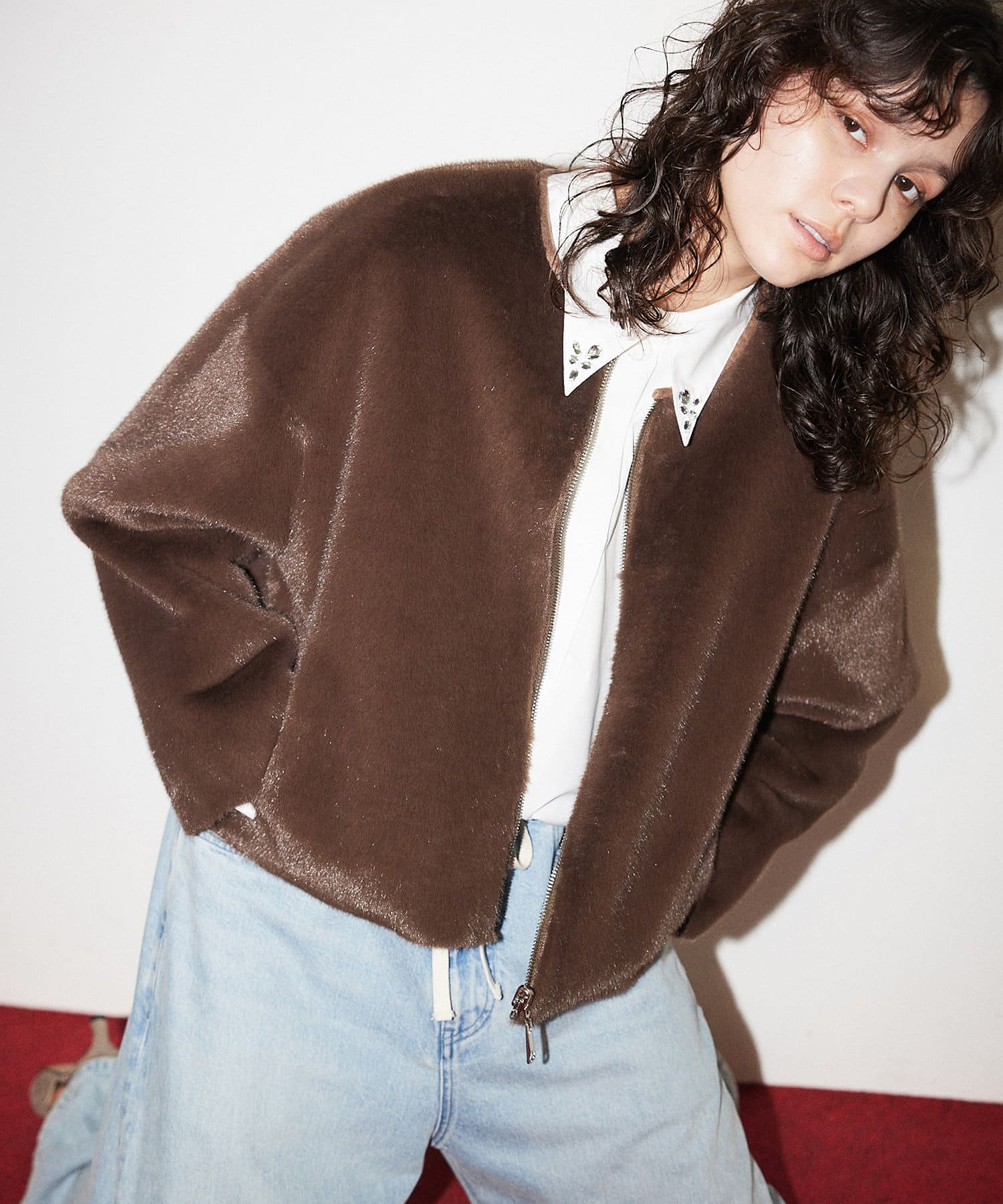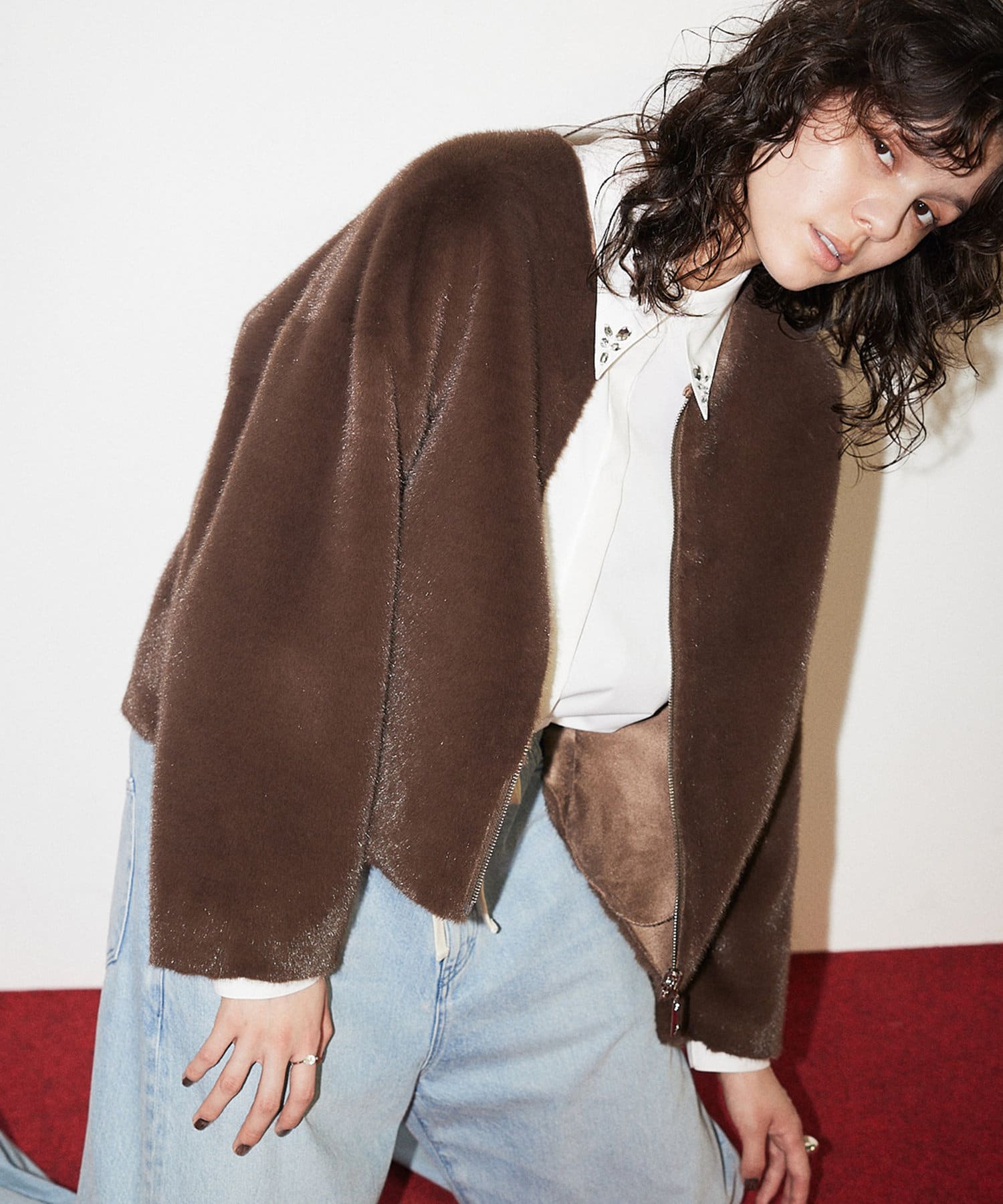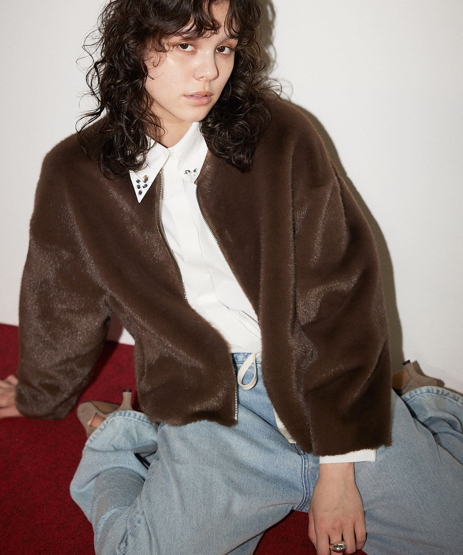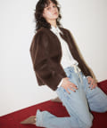 ■ミンクファーを模したフェイク素材を使用したショートコート。