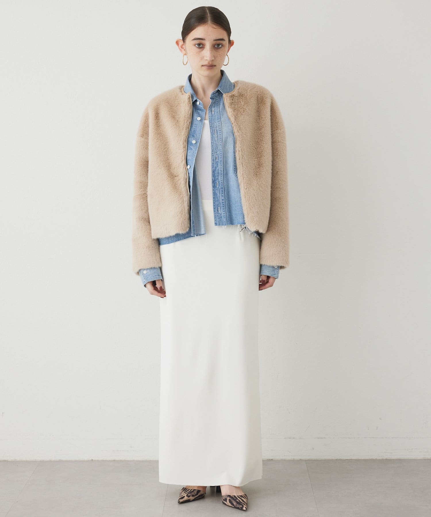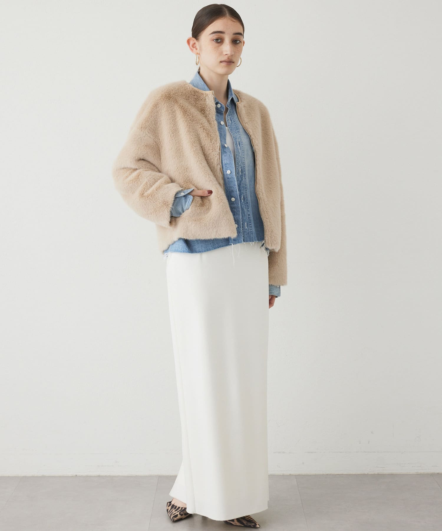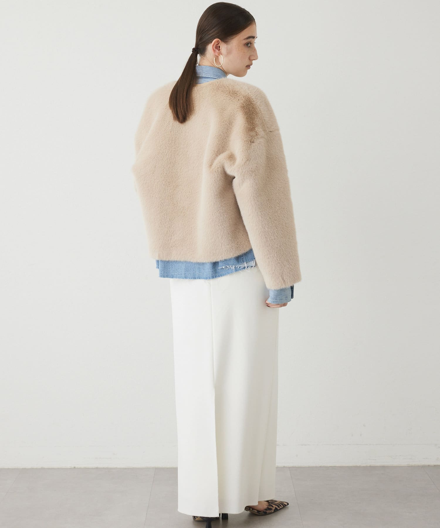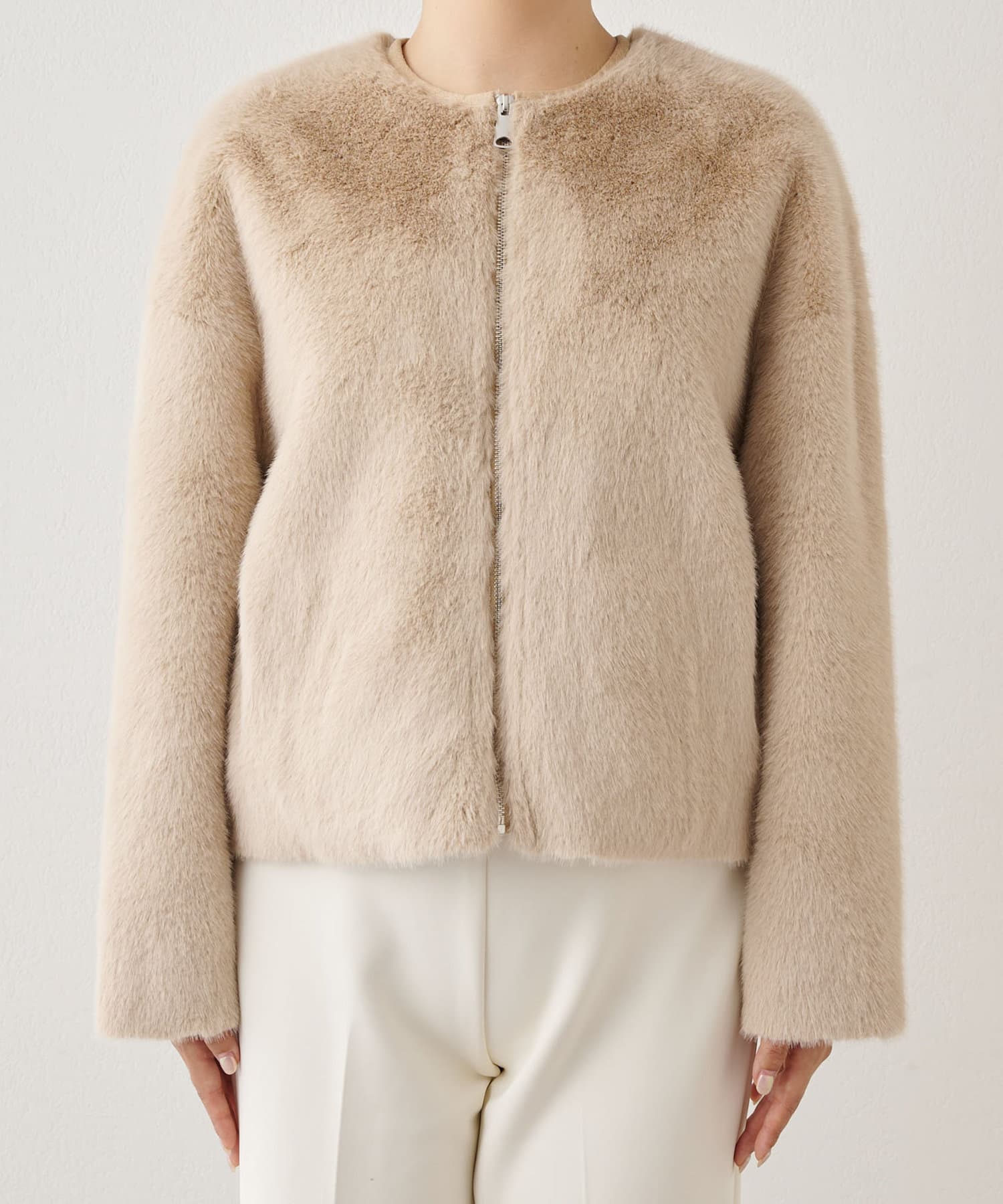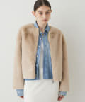 ■ゴージャスになりがちなファーアウターを、ショート丈にする事で少しカジュアルさをプラスし、柔らかなカラーが着こなしやすい一着。