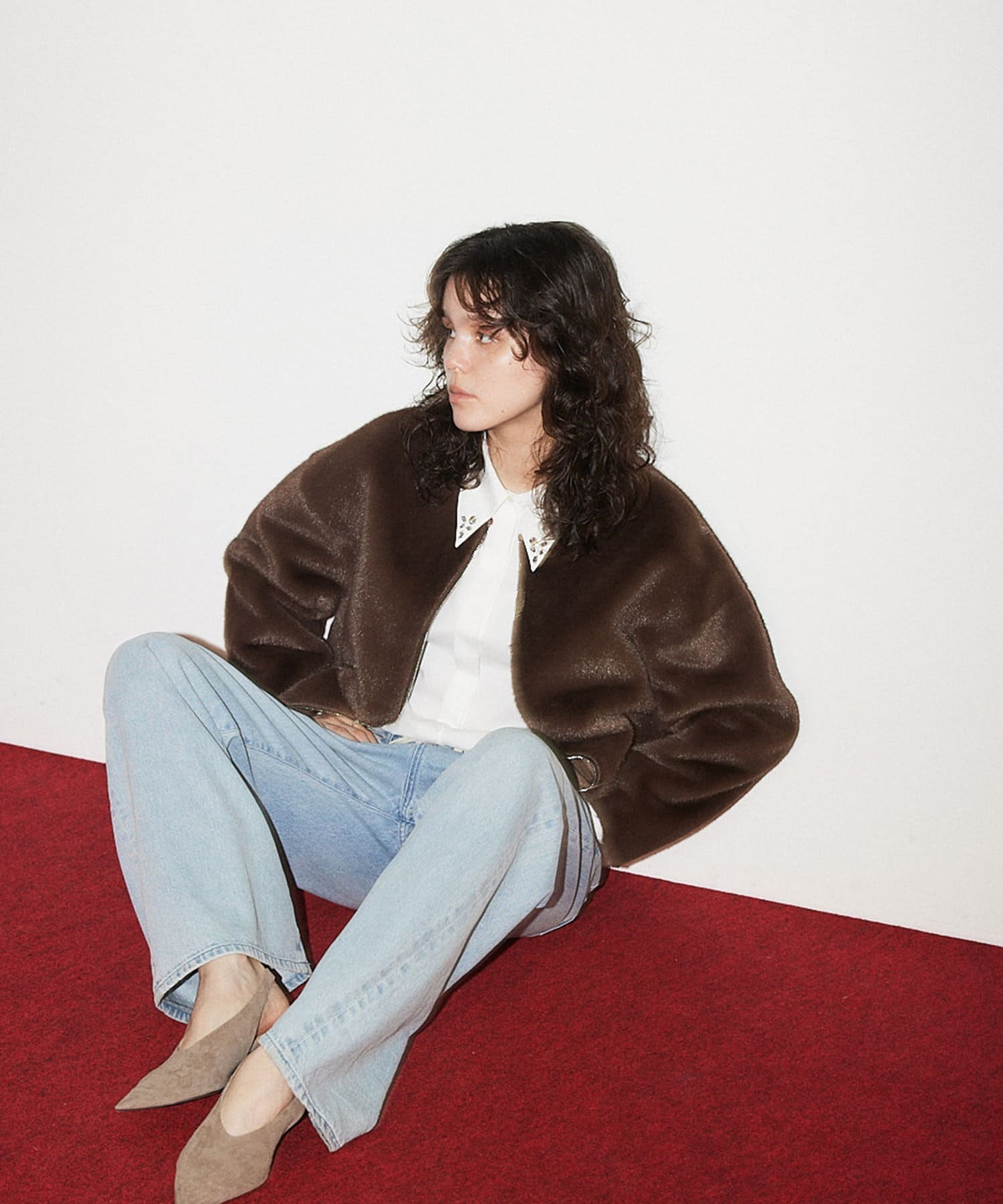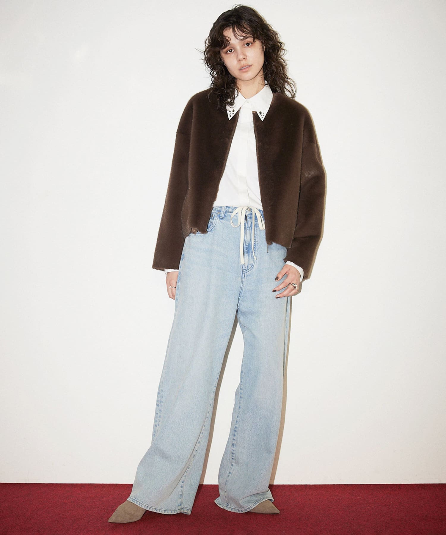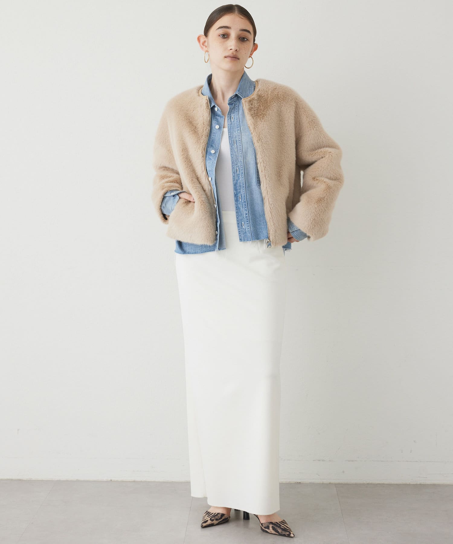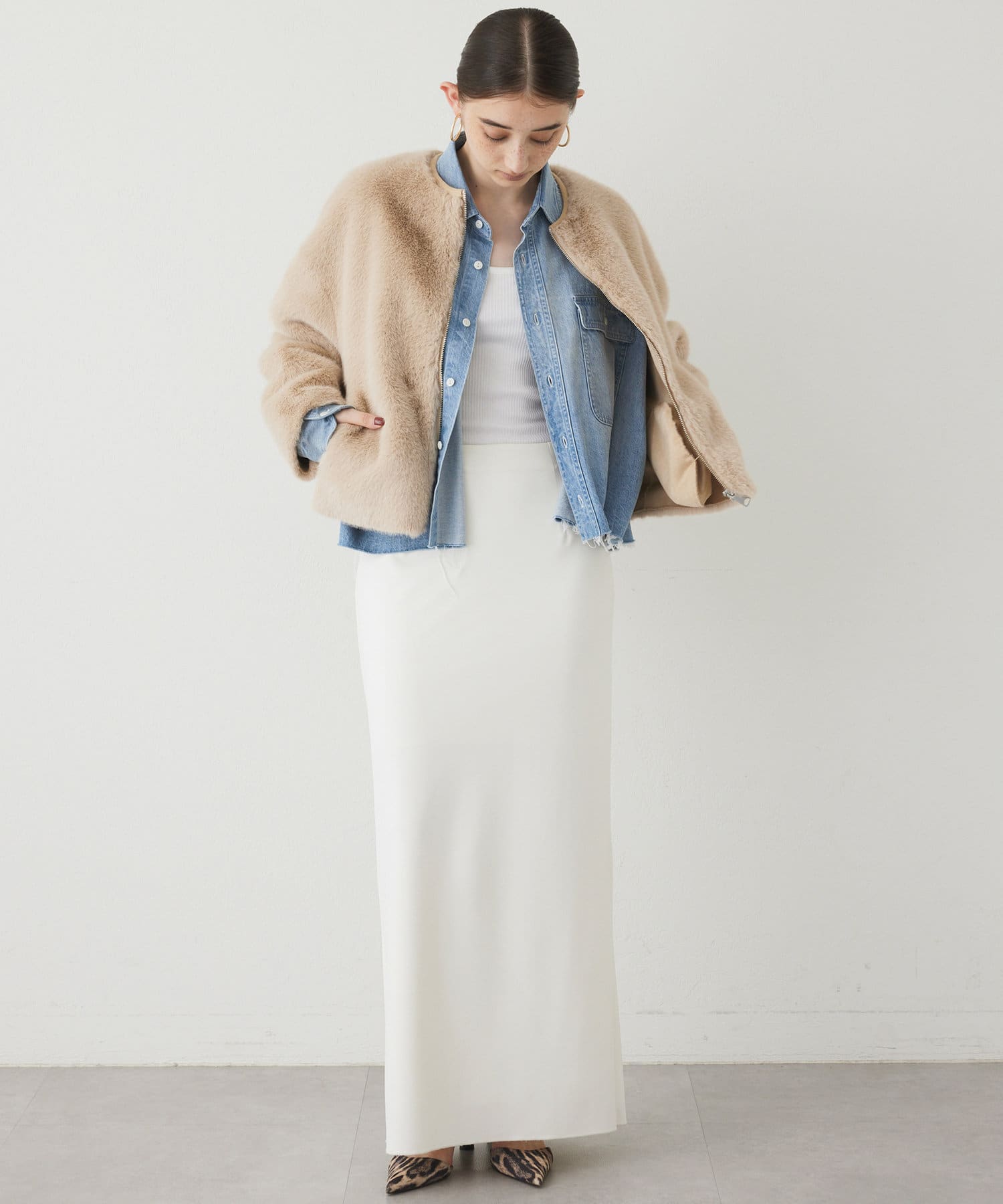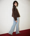 ■ゴージャスになりがちなファーアウターを、ショート丈にする事で少しカジュアルさをプラスし、柔らかなカラーが着こなしやすい一着。