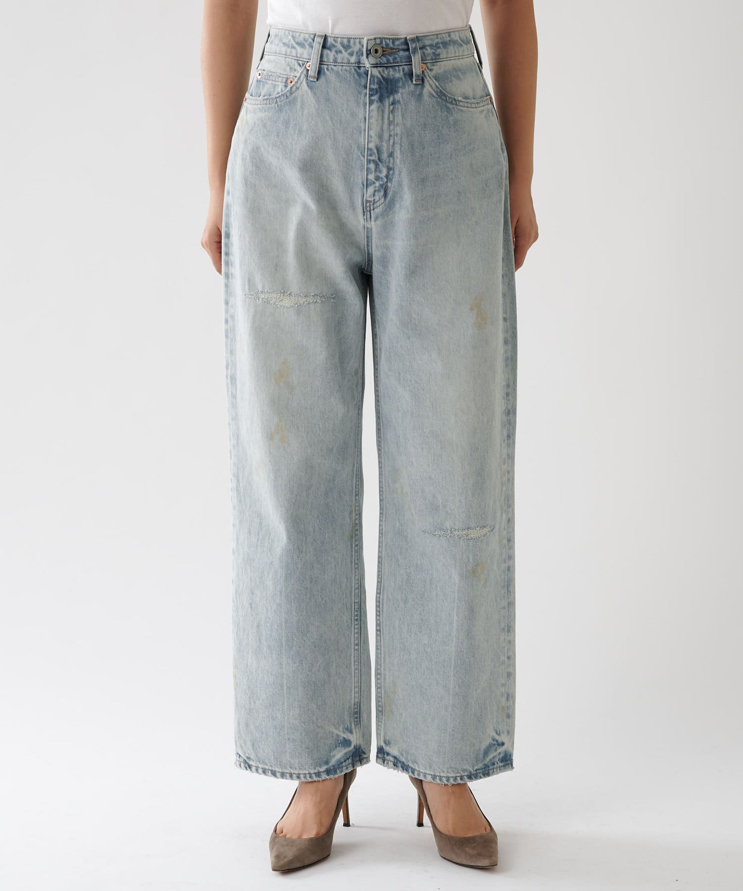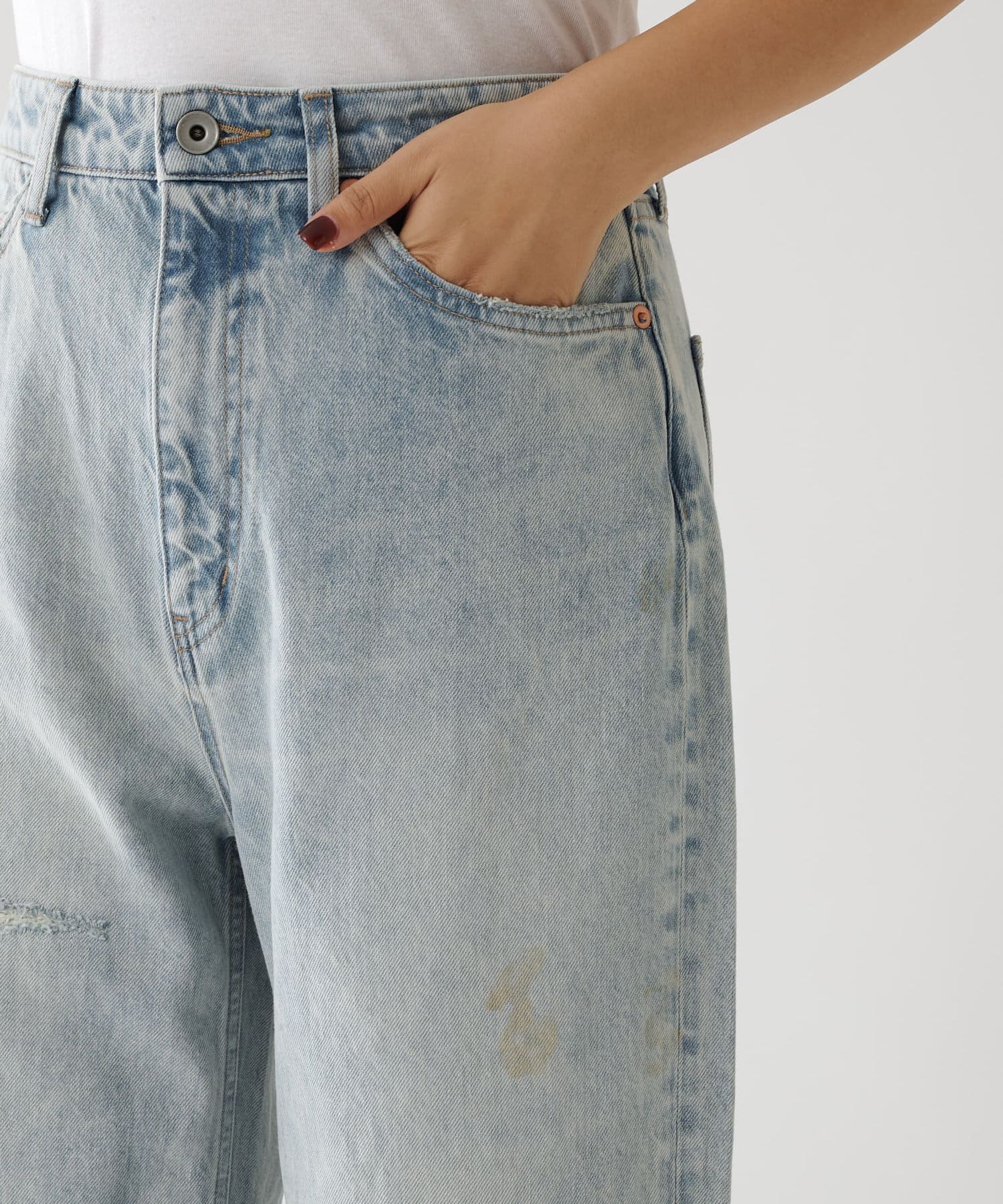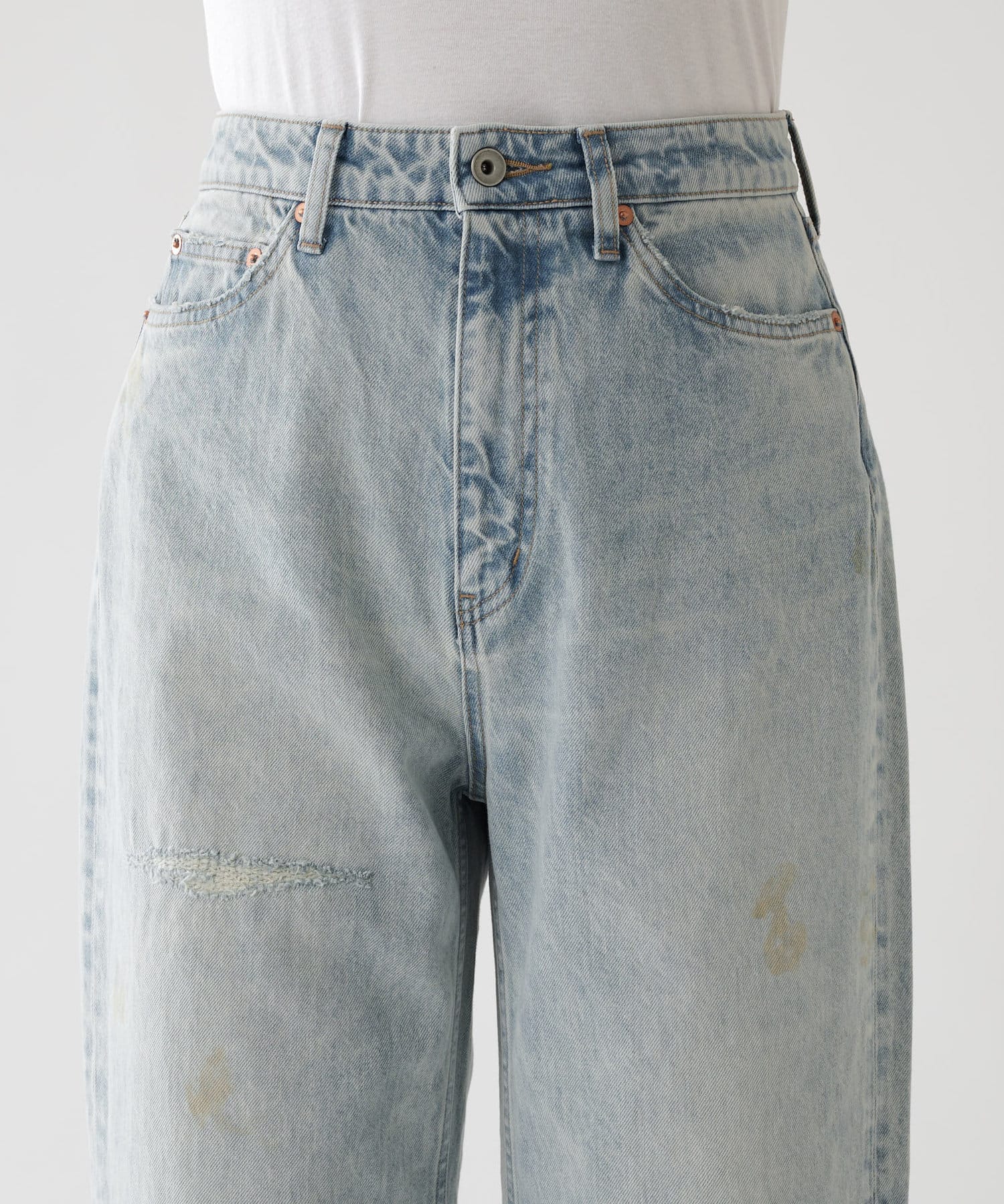 ■全体にヴィンテージのような汚れ加工を施したデニムパンツ。