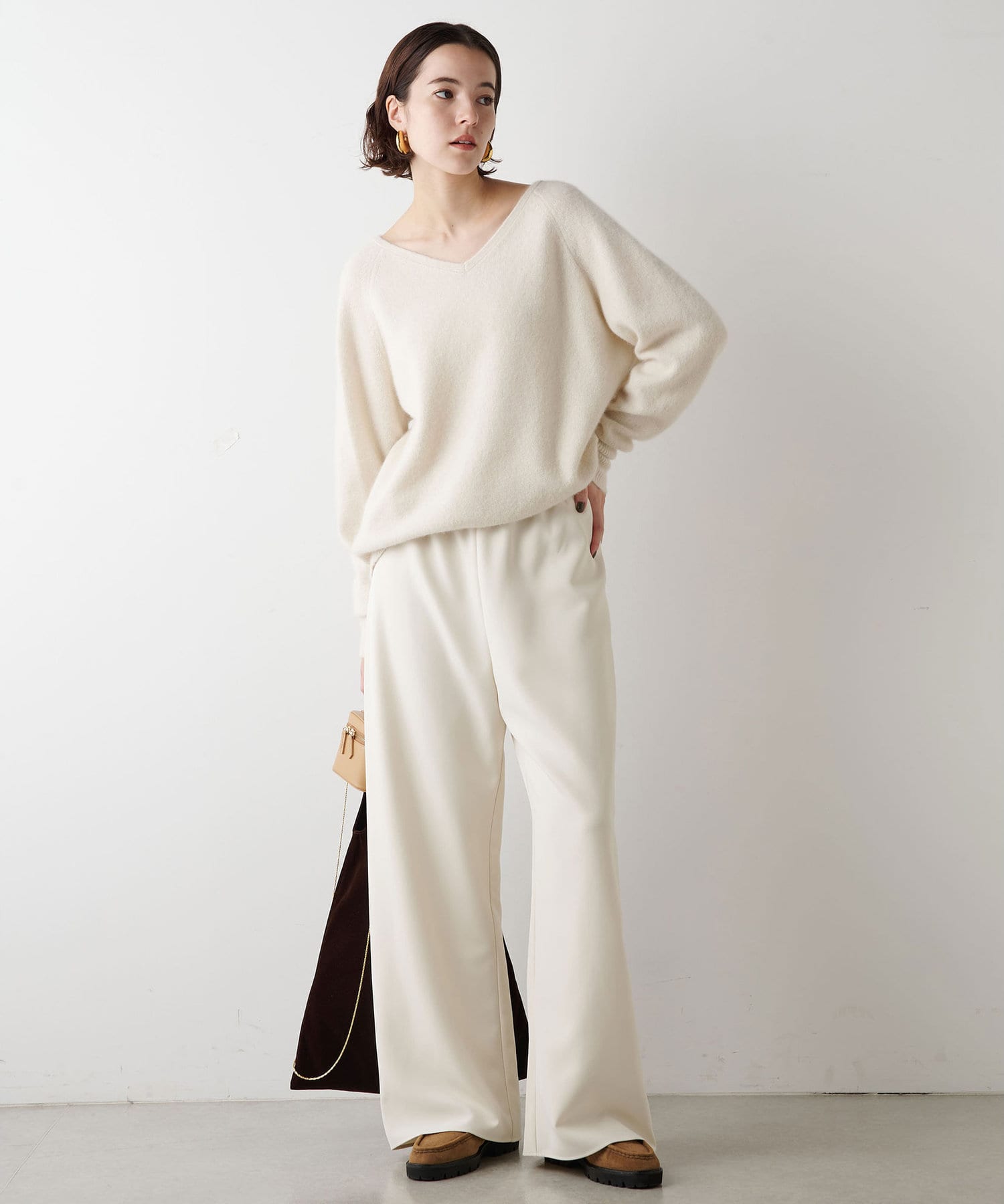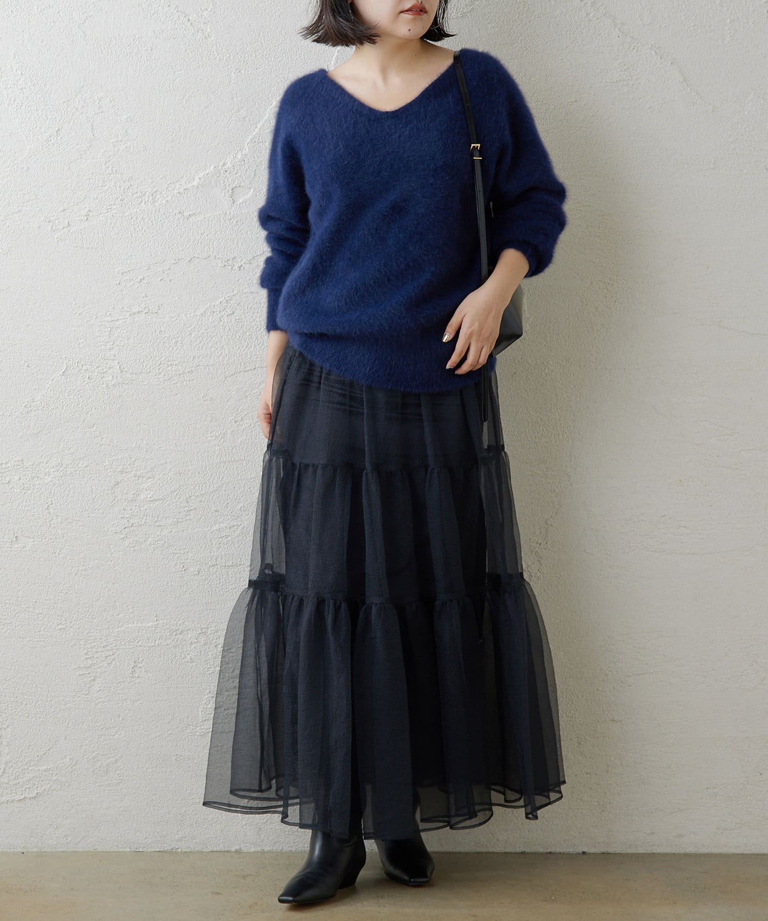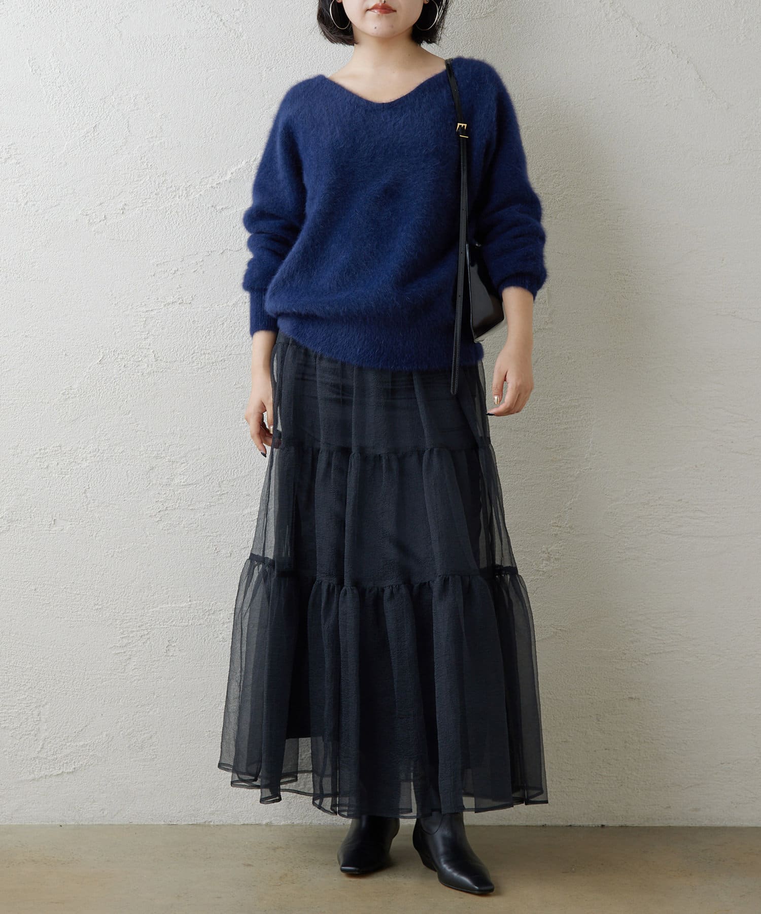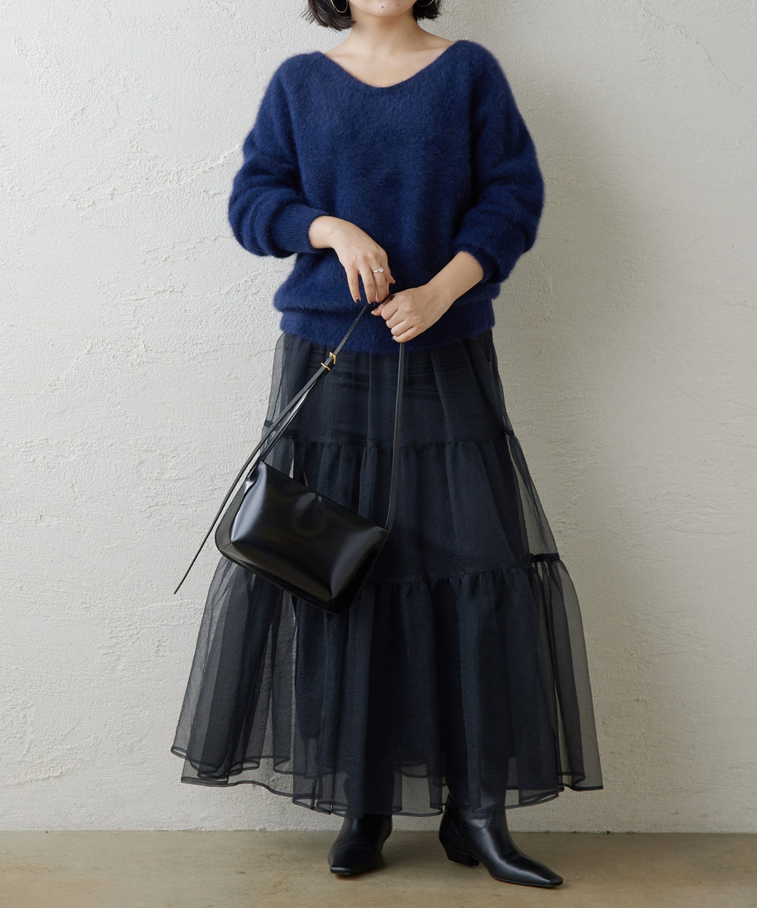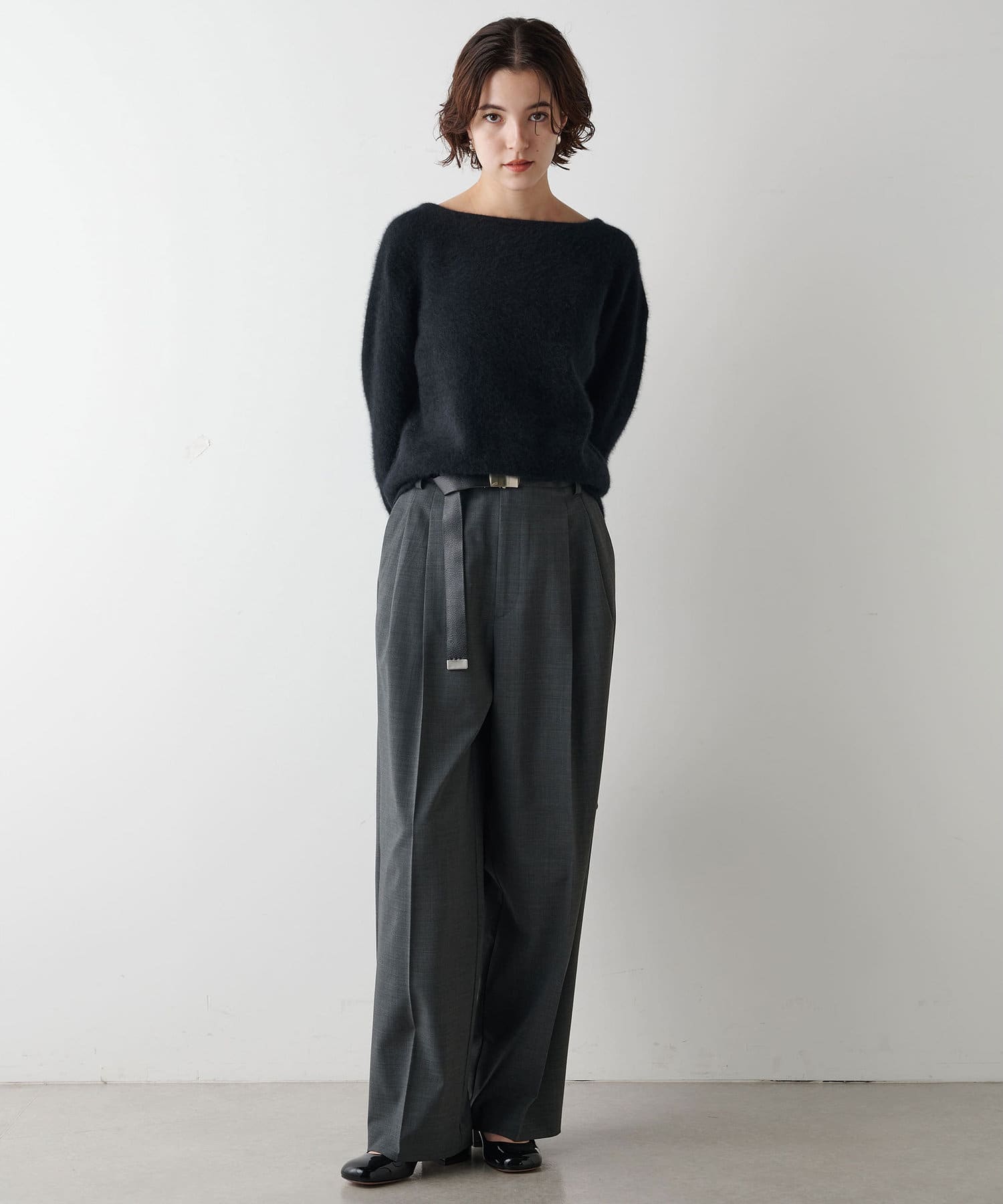 ※本品には毛足のある素材を使用しております。糸の特性上、毛羽が他のものに付着することがあります。着用中の摩擦はできるだけ避け、毛羽が付着した場合は、衣類用ブラシなどで取り除いてください。濃色は特に毛羽の付着が目立ちますので、できるだけ同系色のものとの組み合わせをおすすめいたします。