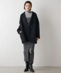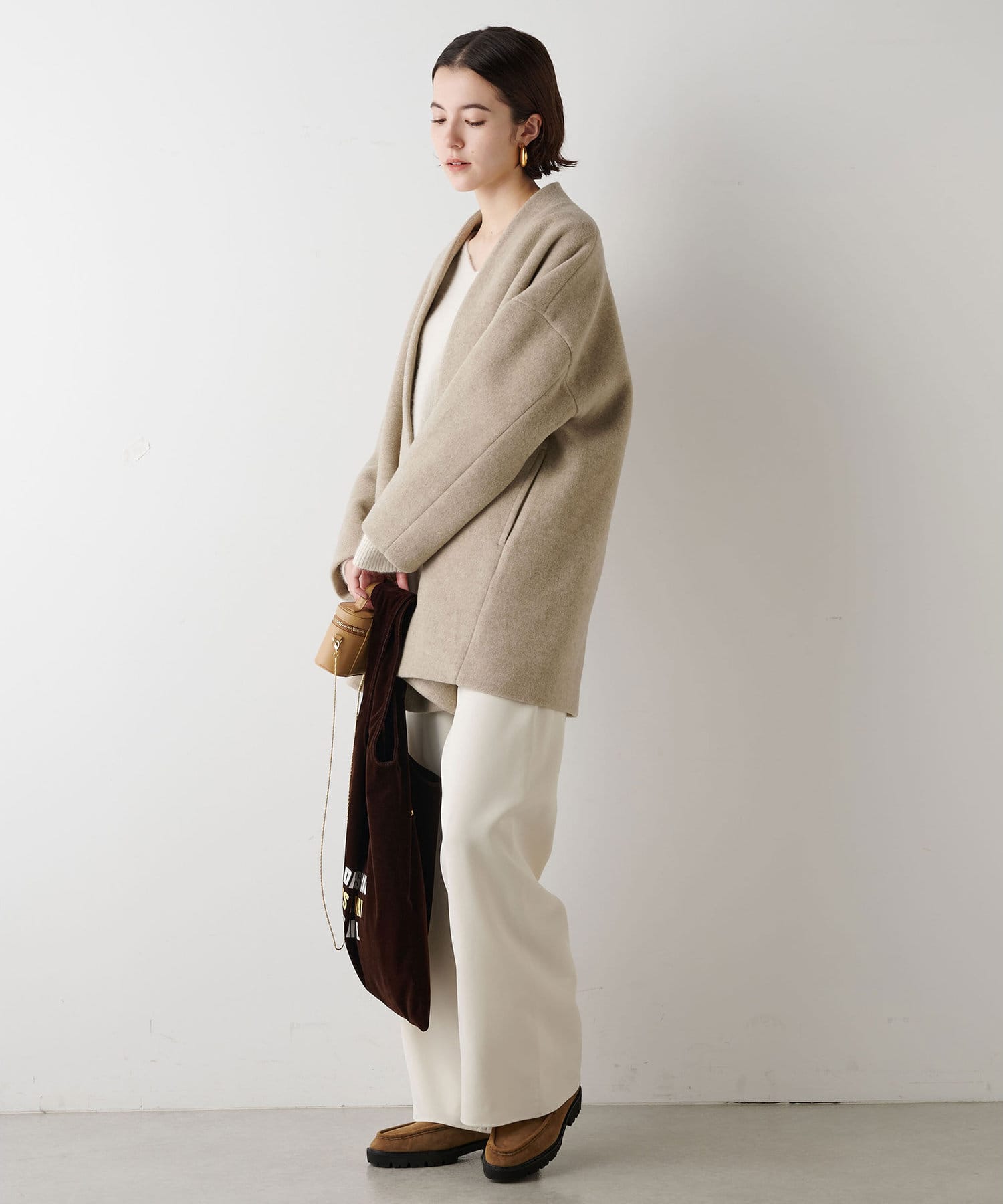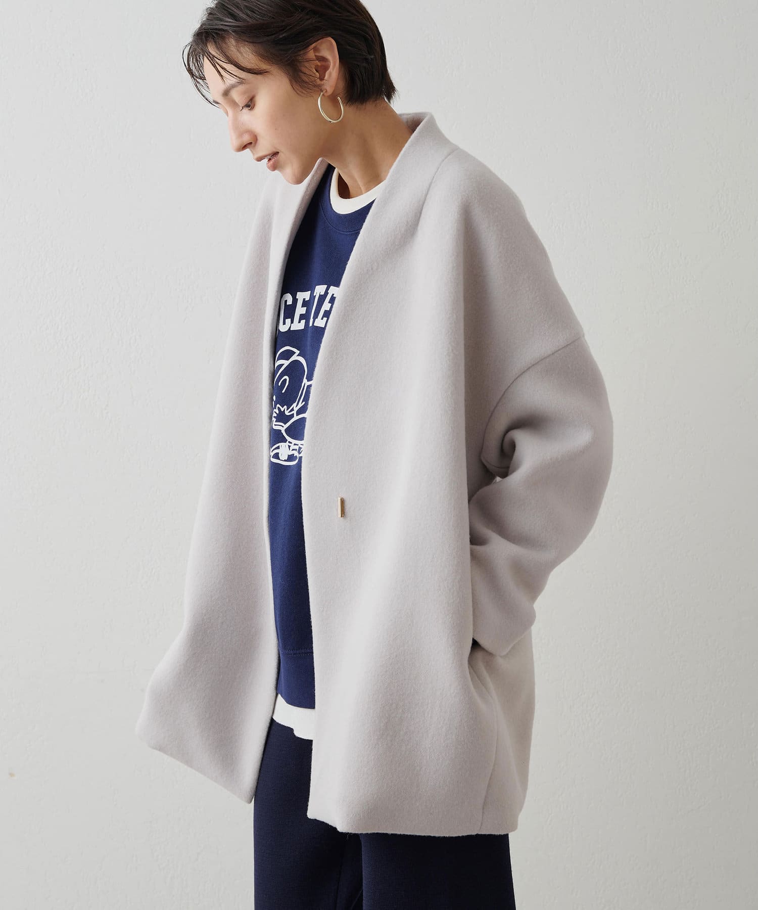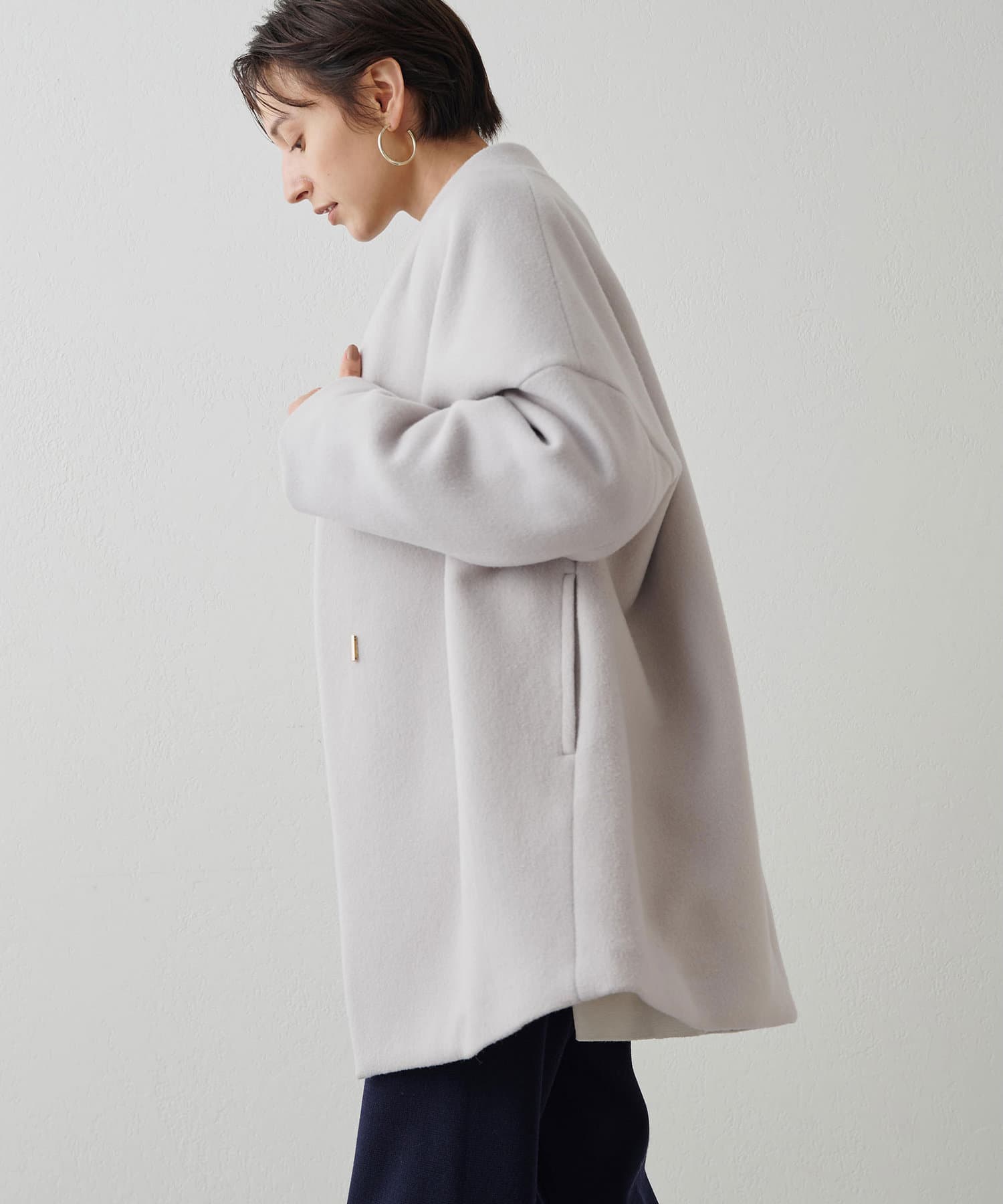 ■リラックス感のあるドロップショルダーに、着ぶくれせずにすっきりと見えるシルエットが美しく、短めの着丈がライトな印象。
