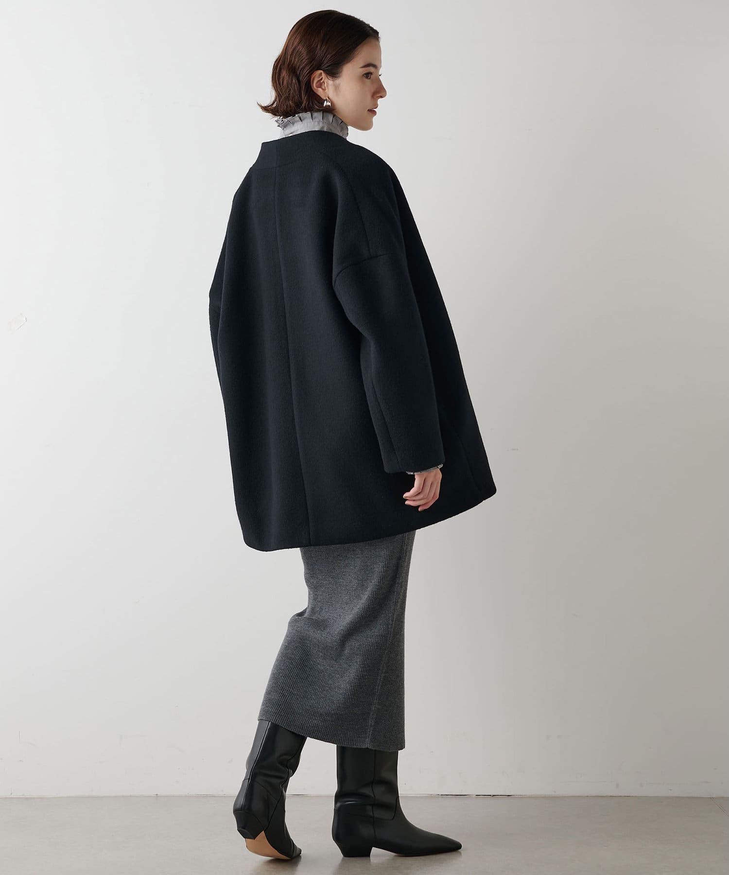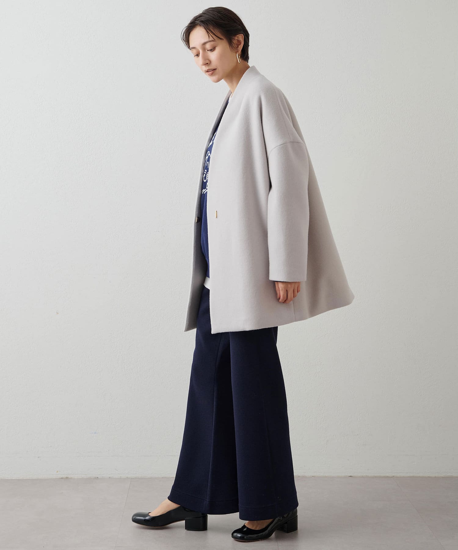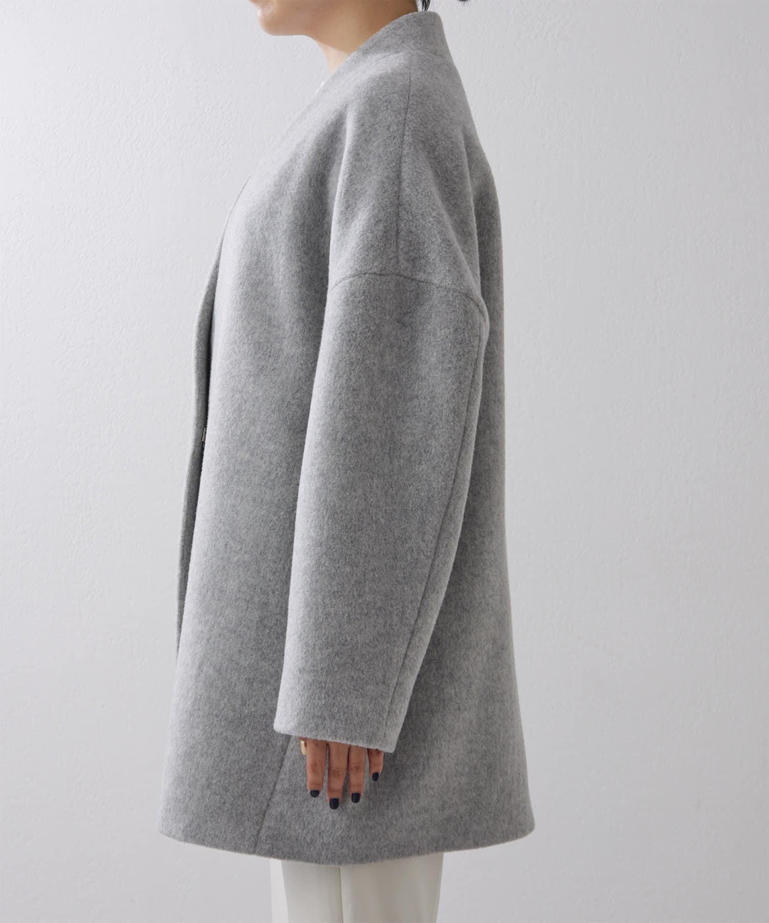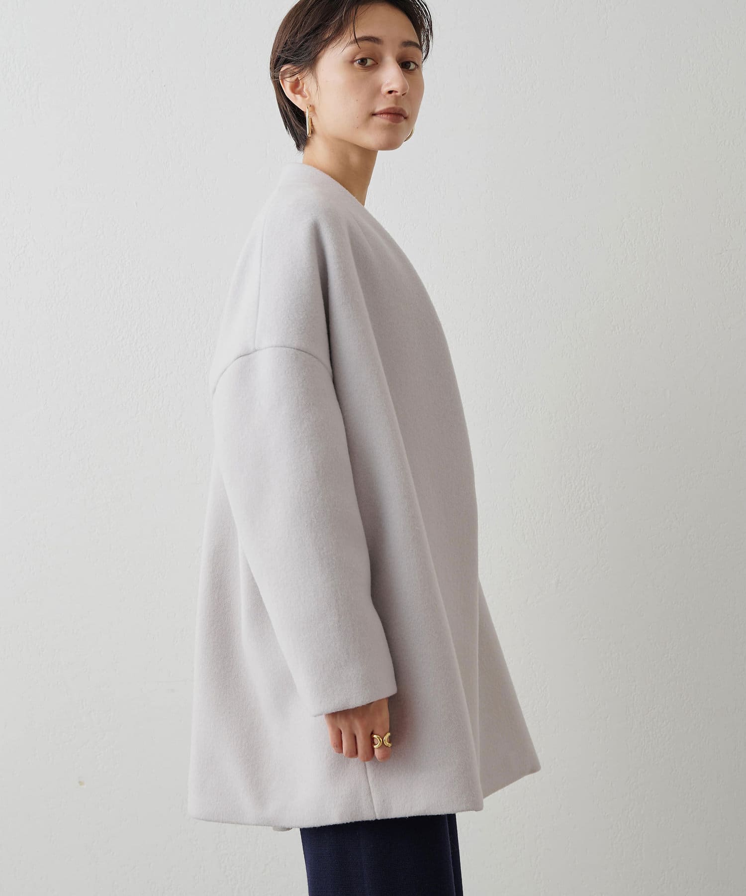 ■リラックス感のあるドロップショルダーに、着ぶくれせずにすっきりと見えるシルエットが美しく、短めの着丈がライトな印象。