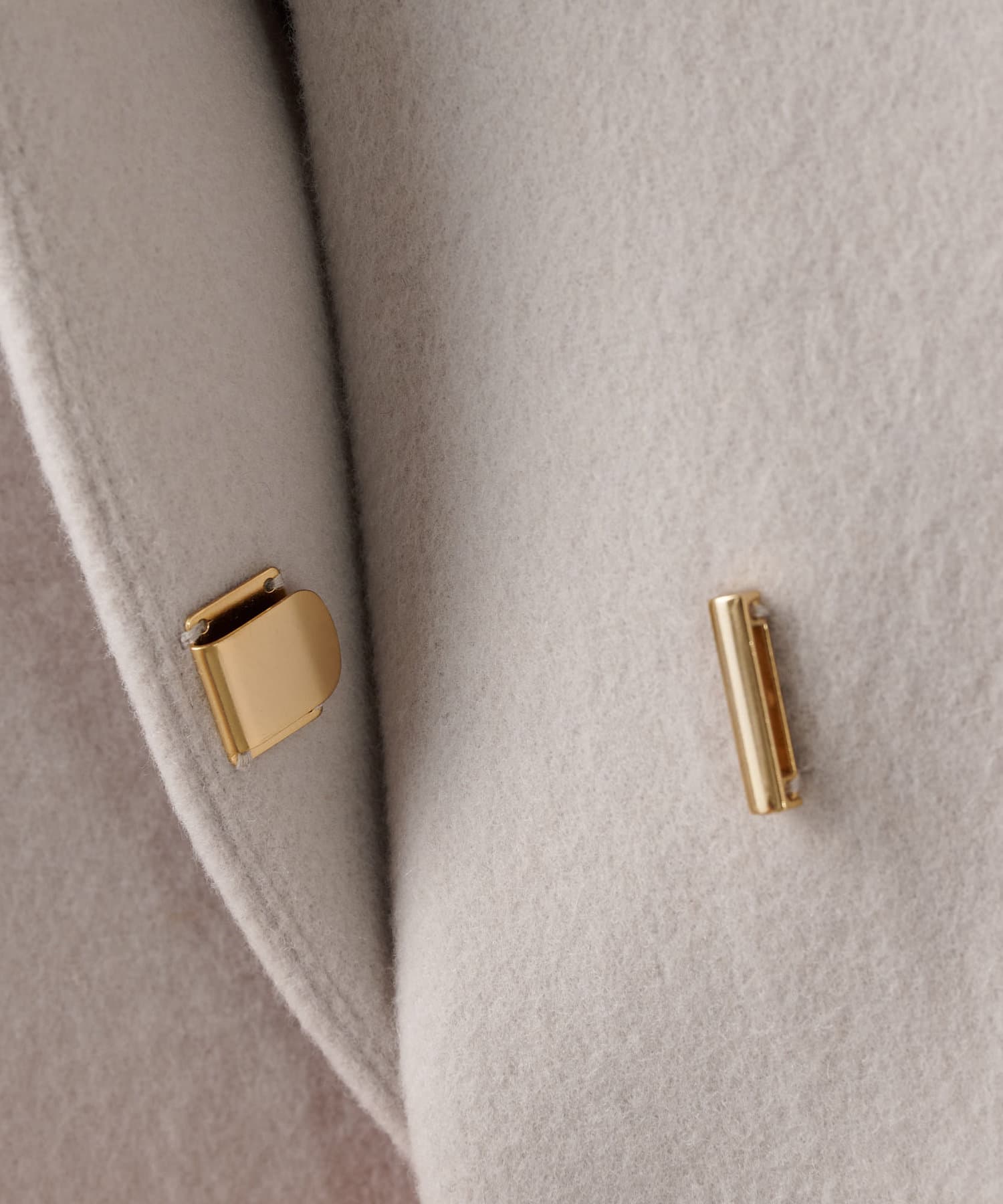■フロントはホックのディテールでシンプルなシルエットを損なわないようにこだわったデザイン。