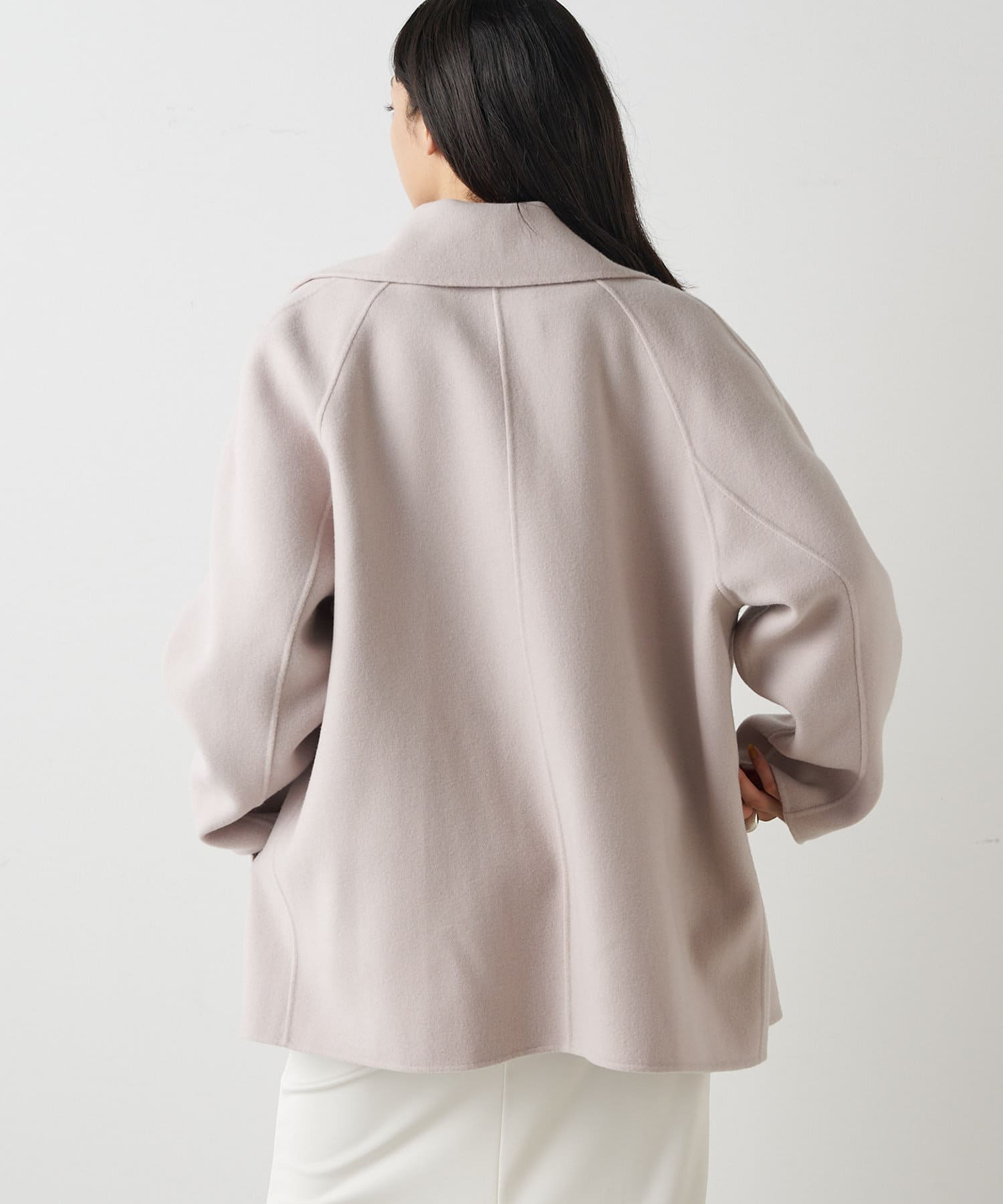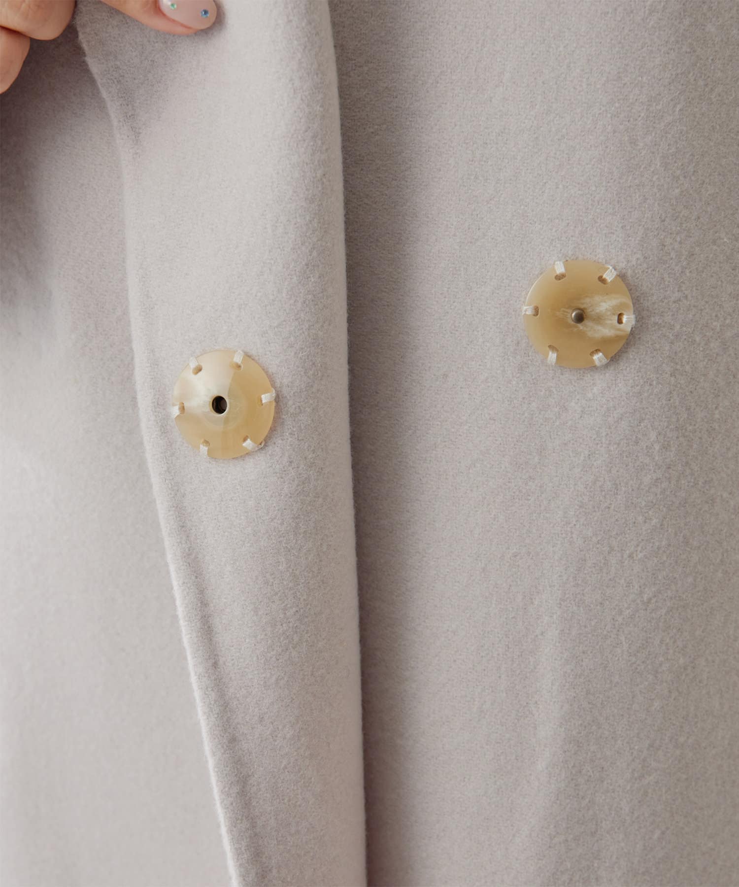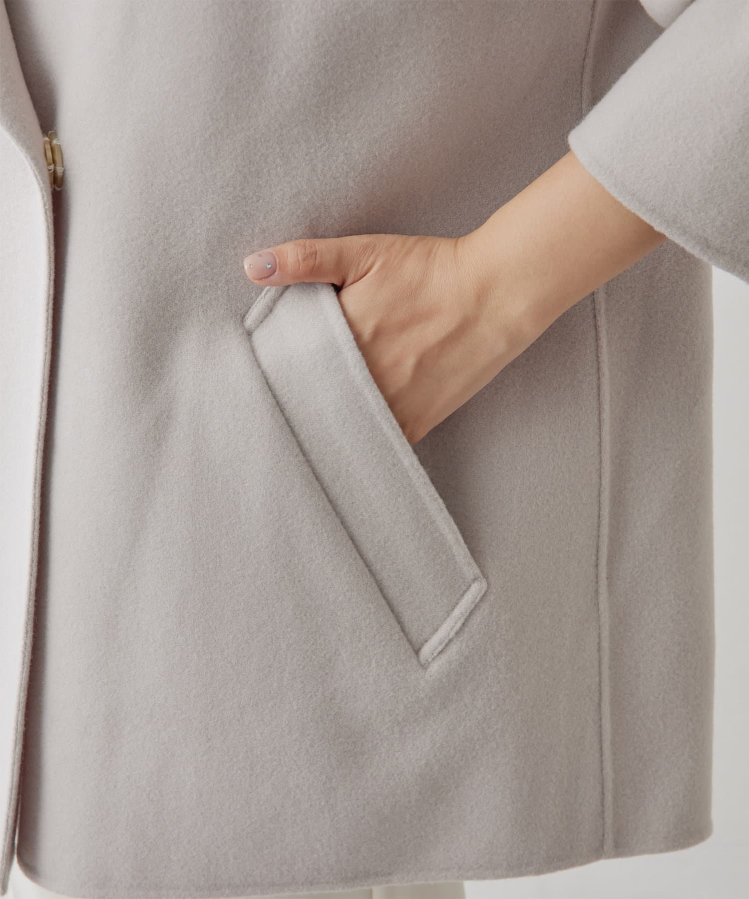 サッと羽織れて上品な一枚仕立てのPコート。厚手のニットも着ることができます。リバーコートは真冬はインナーダウンを着たり、春先も羽織りとして使えるので長い季節、愛用いただけます。