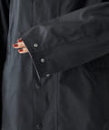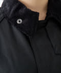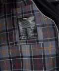 ■襟もとのコーデュロイ、フロントの大振りのリング型ジッパーや、オリジナルタータンの総裏地がアクセントに。