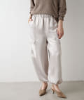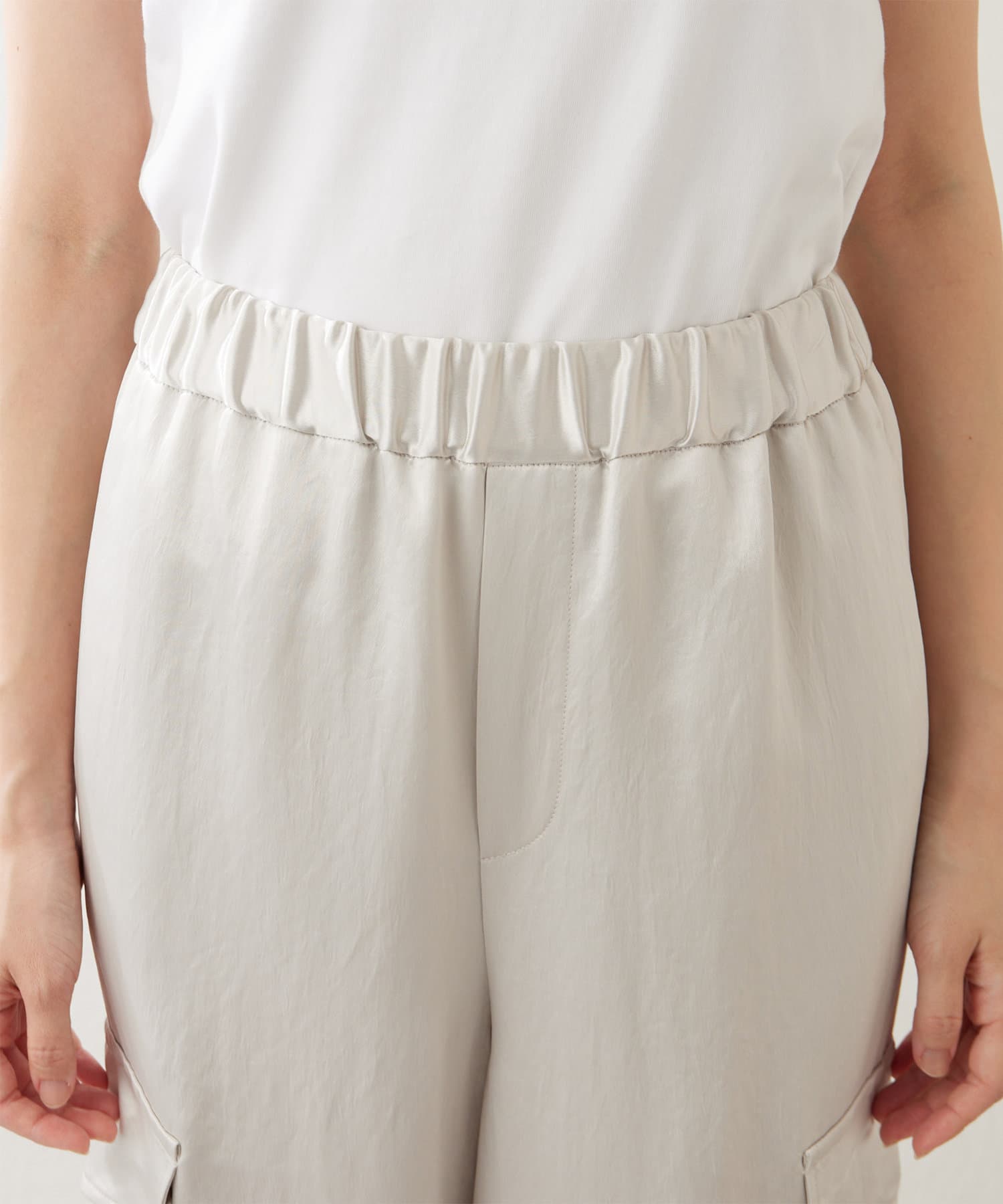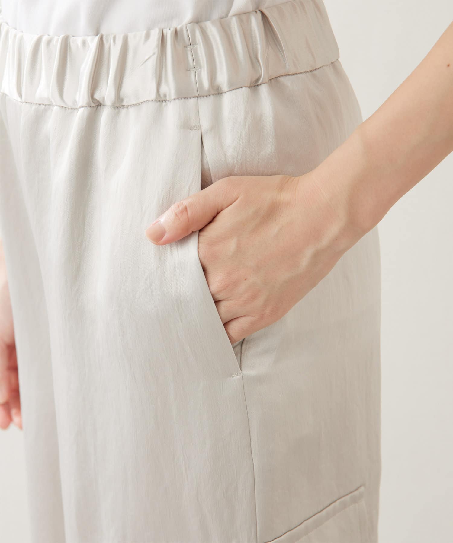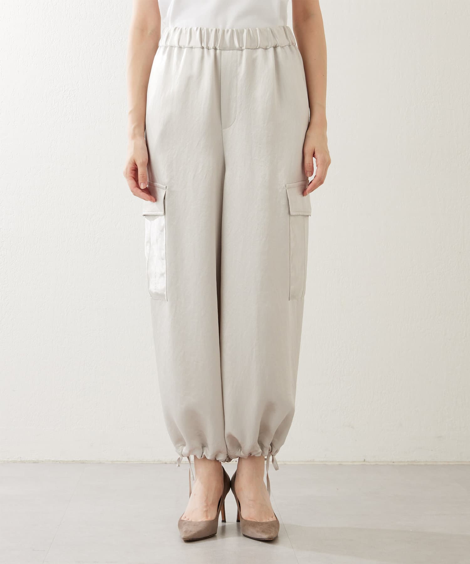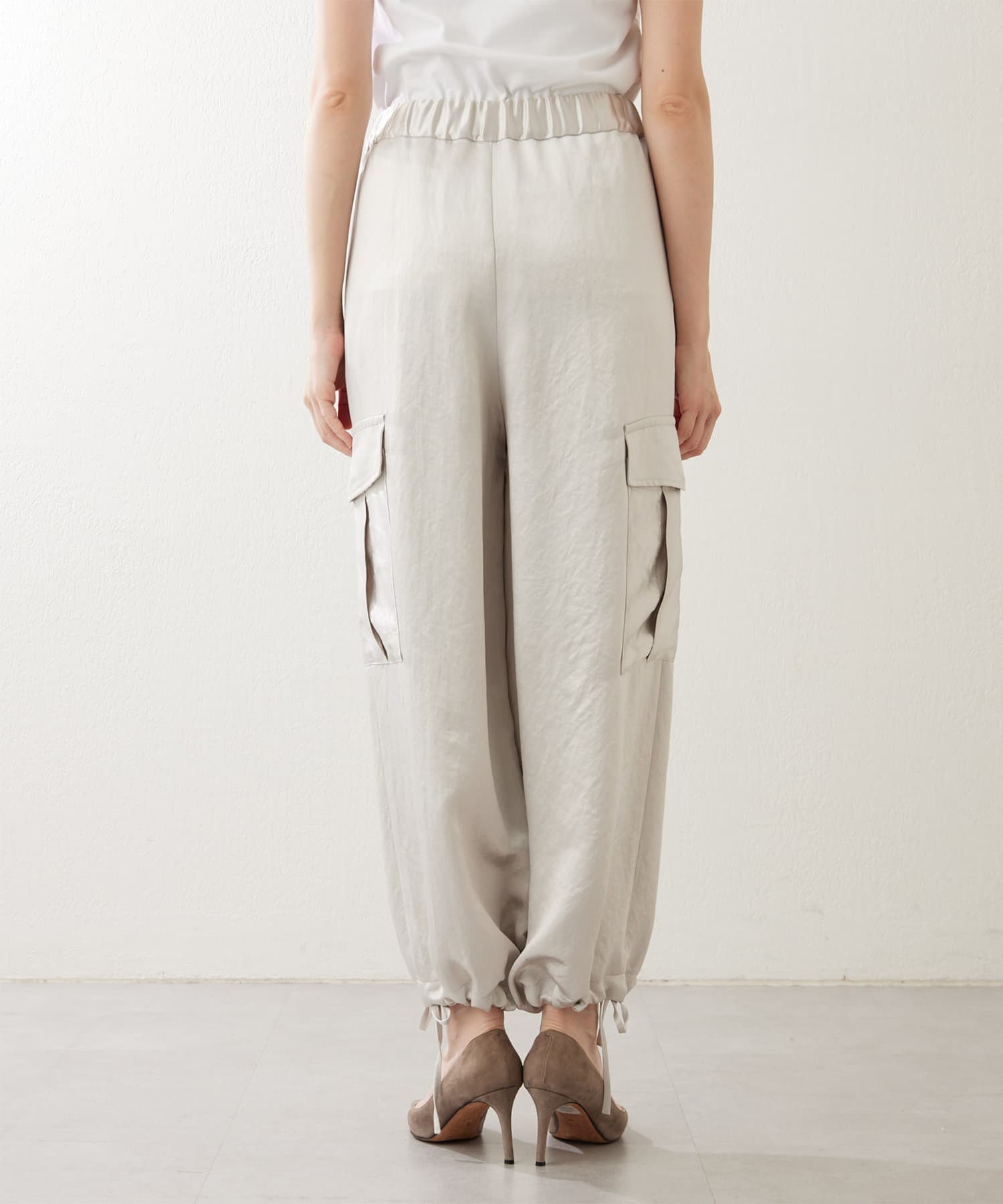 ■光沢感のあるサテン素材で仕立てたドロストパンツ。