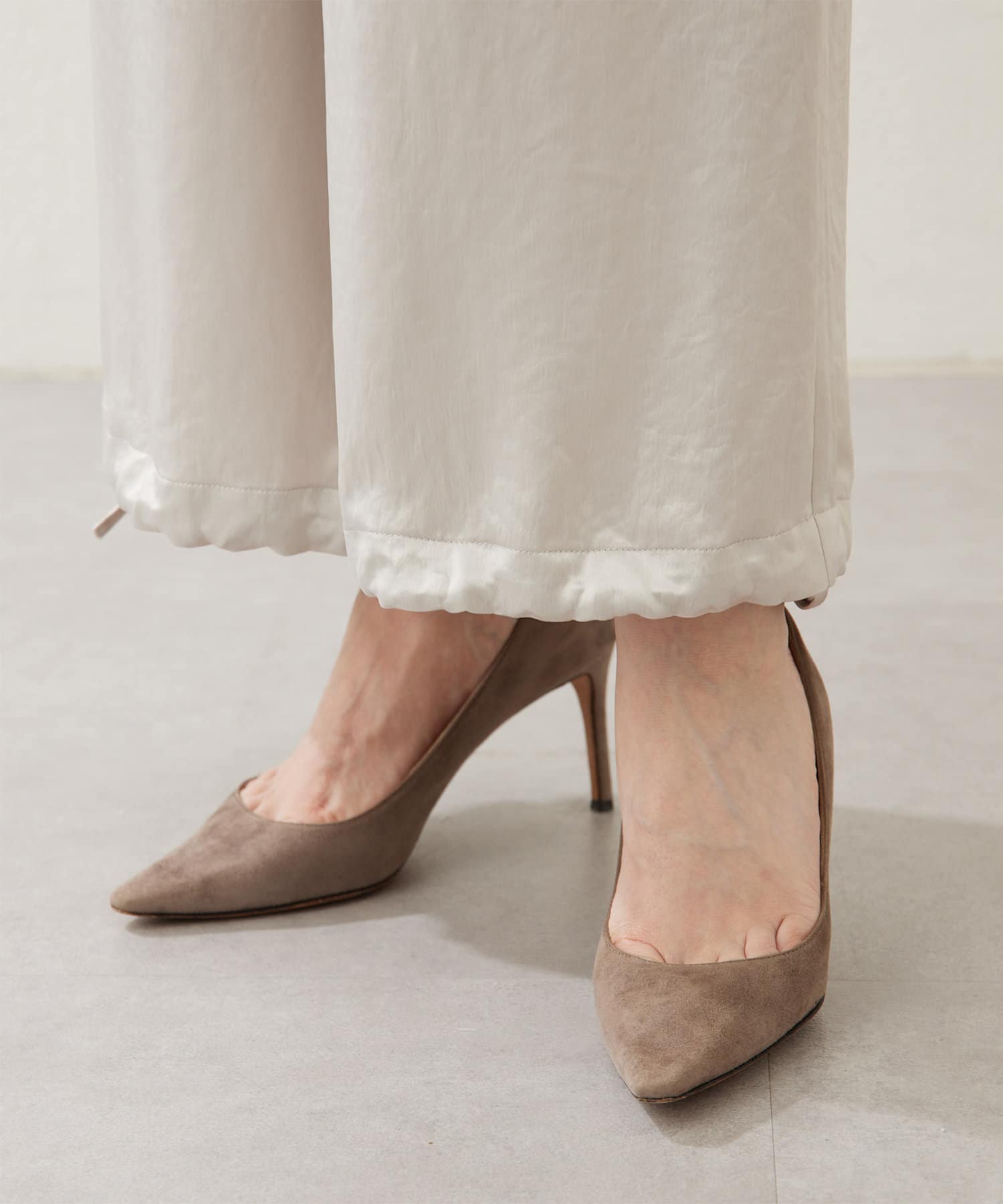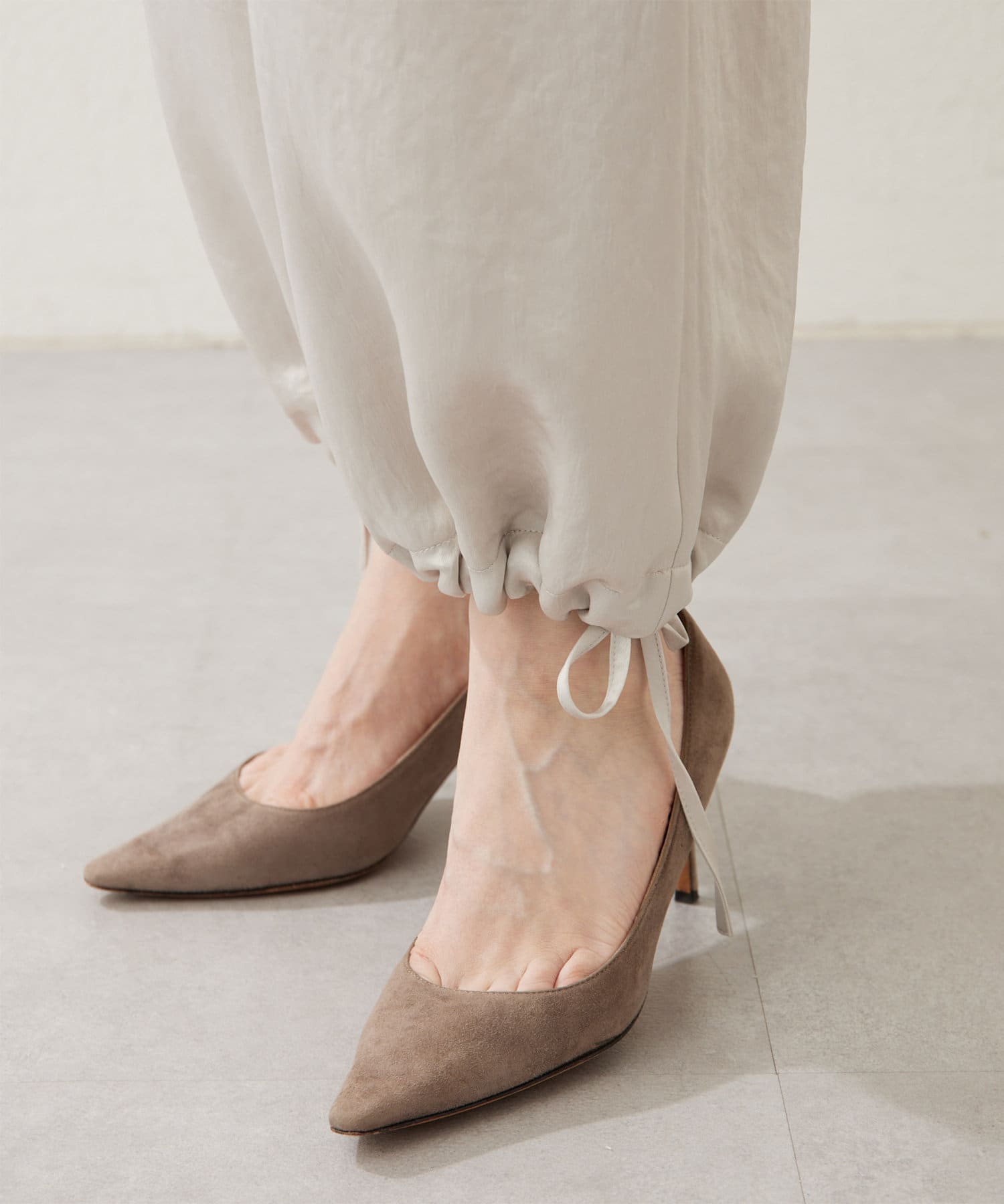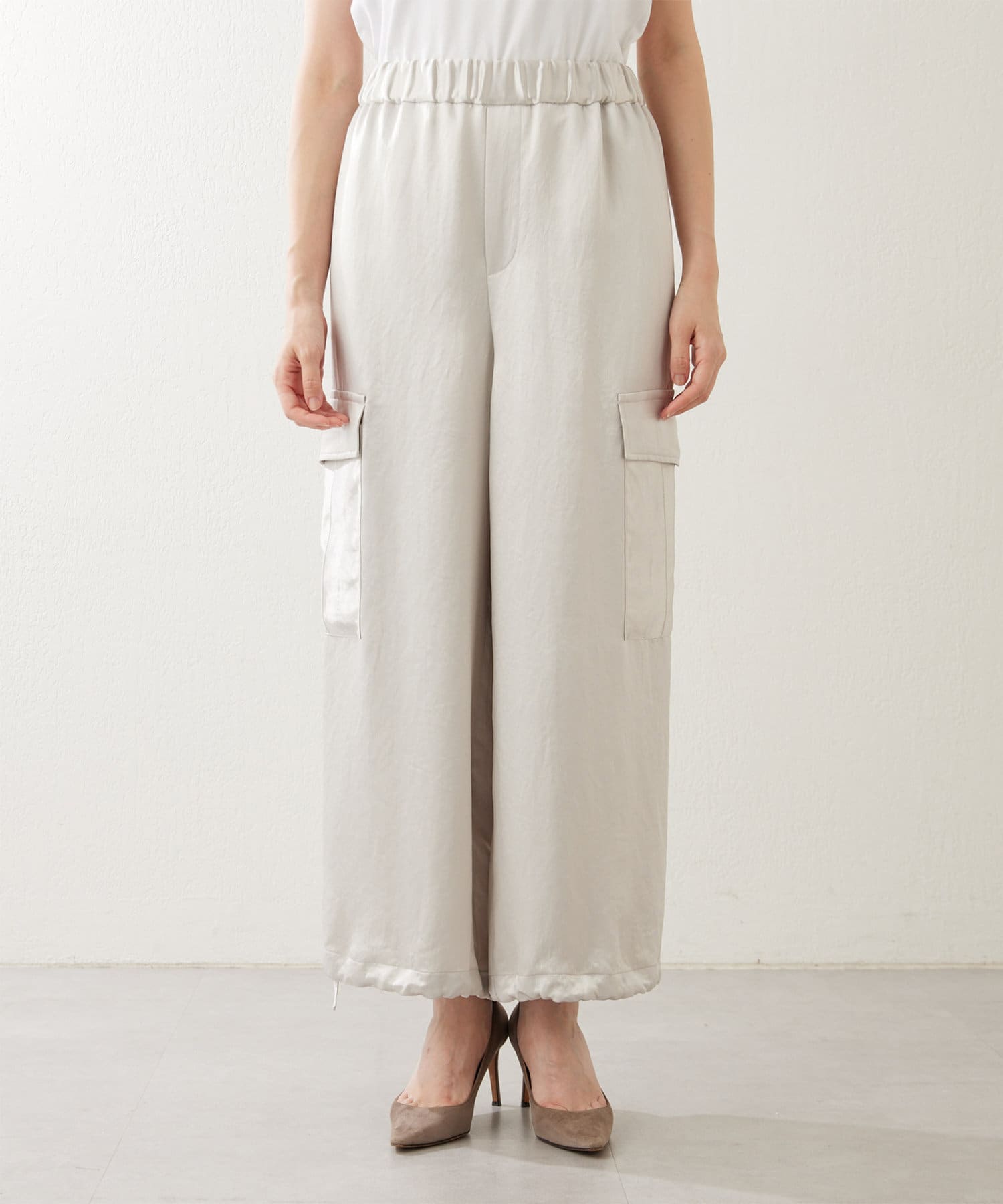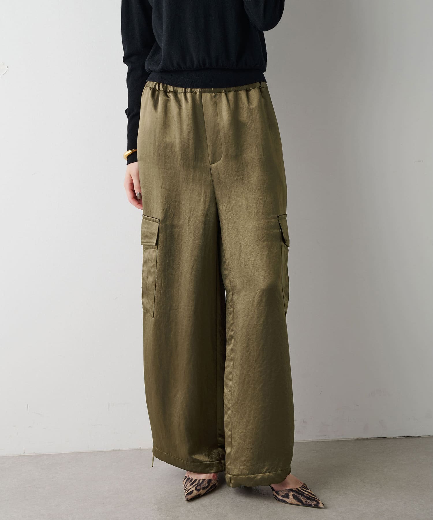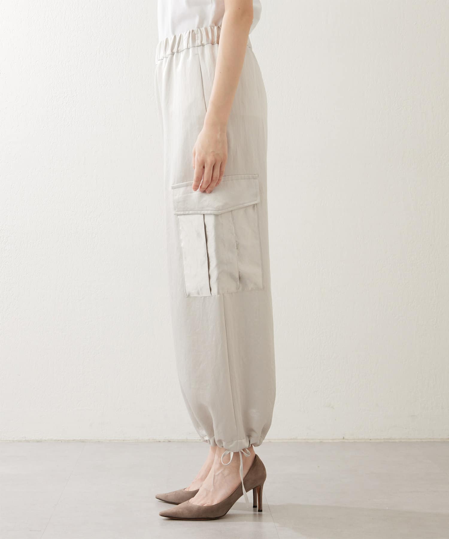 ■光沢感のあるサテン素材で仕立てたドロストパンツ。