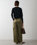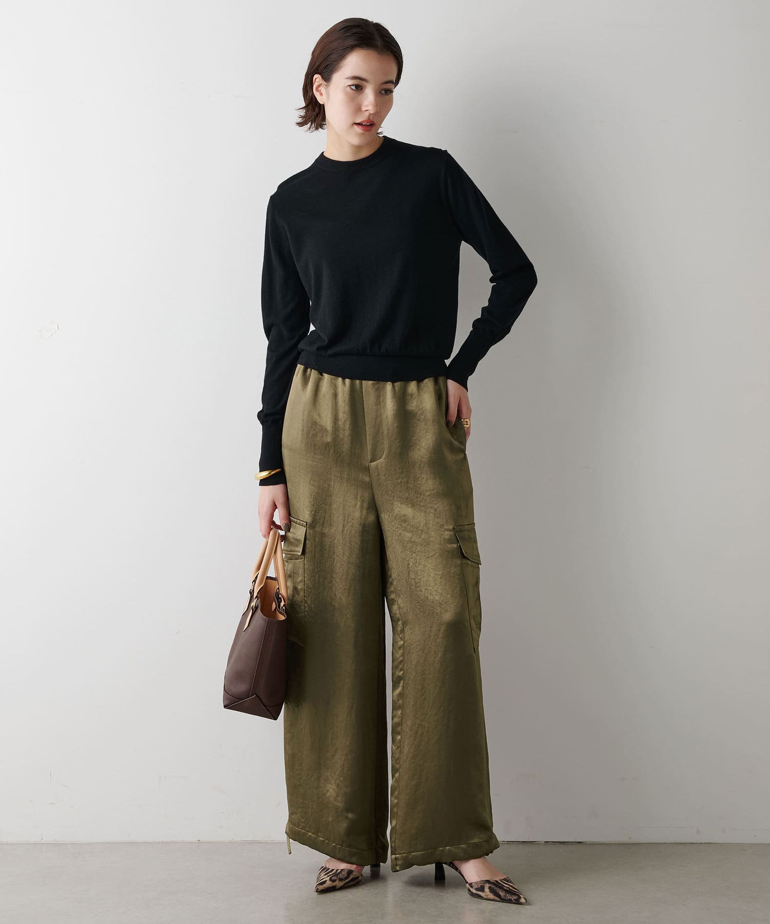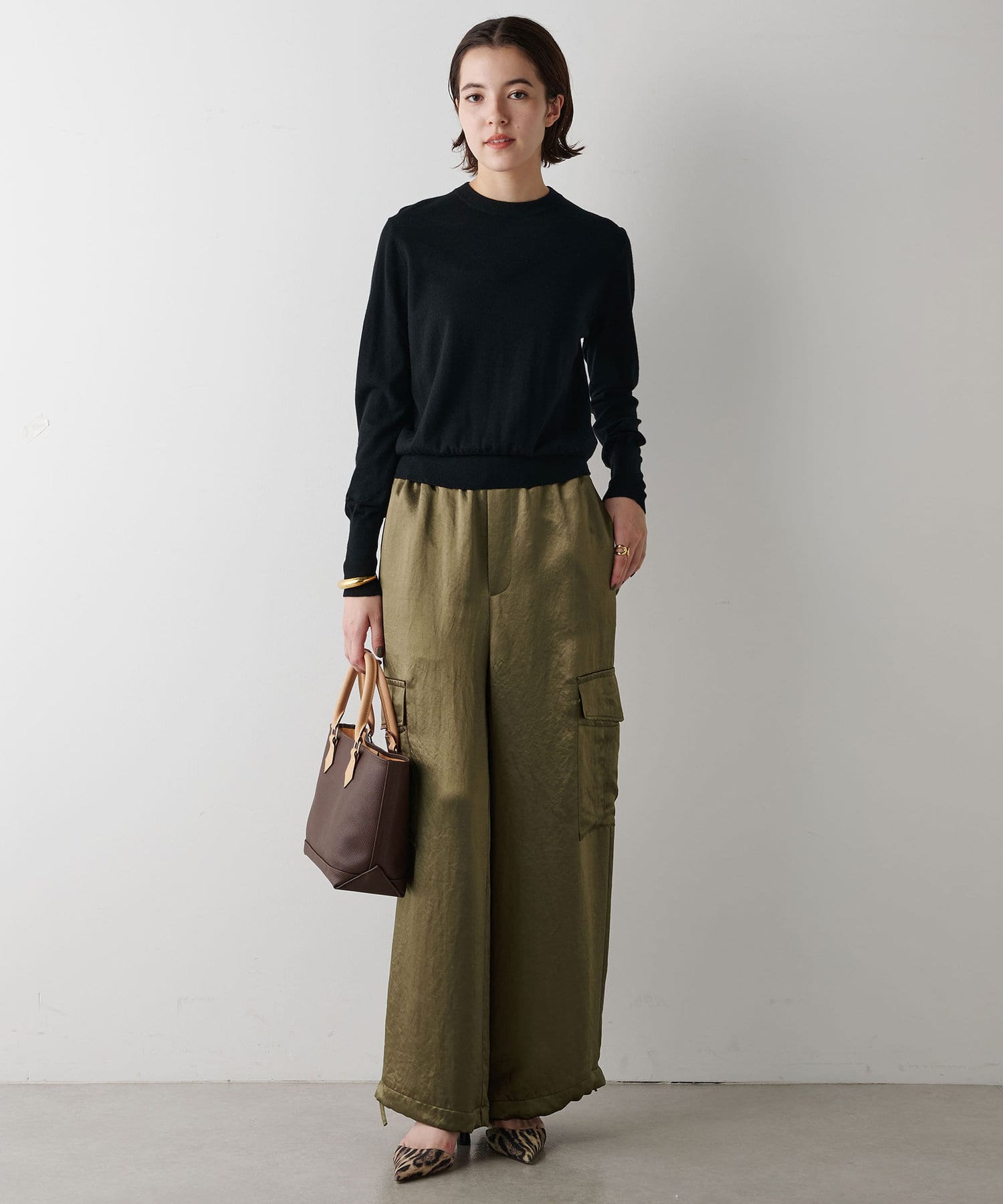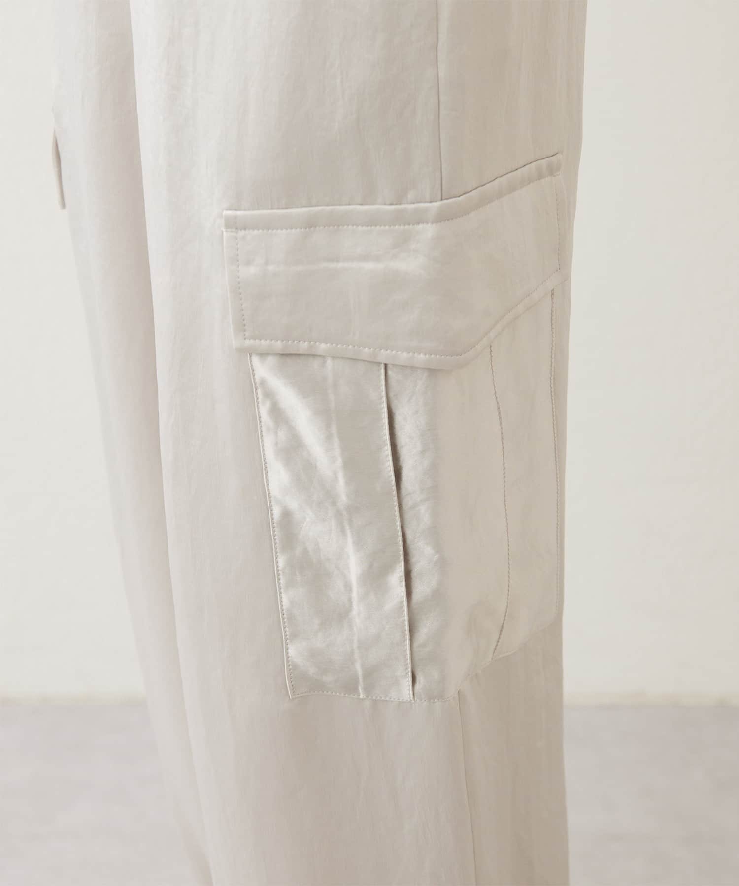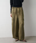 艶感が綺麗なドロストパンツ。裾部分がドロストになっているので、自由にデザインを変えられます。しっかりワイドシルエットで比較的カジュアルなデザインですが、サテンの艶感により上品に見えるアイテムです。ニットなどマットなアイテムが多くなる秋冬に大活躍しそうなパンツです。