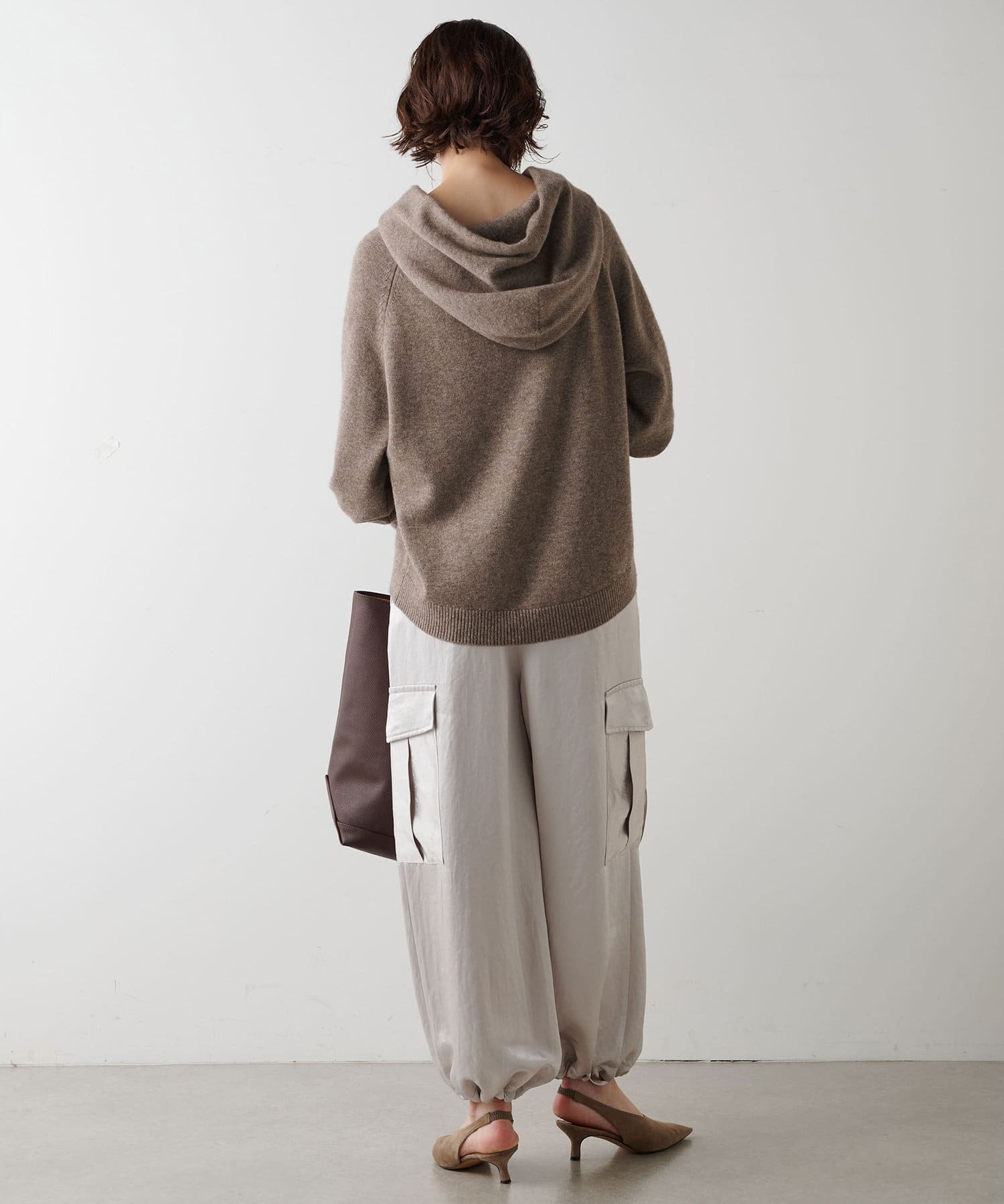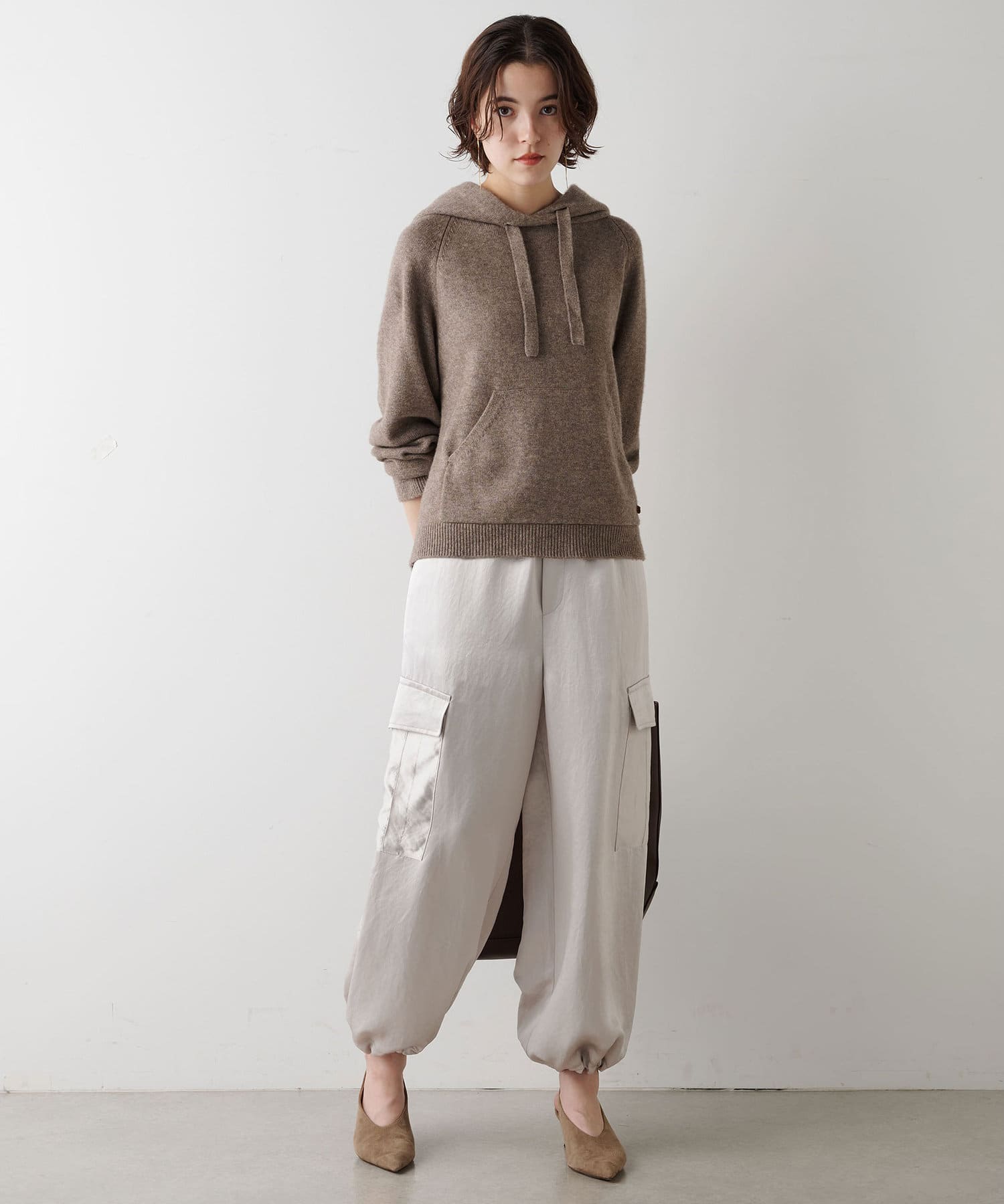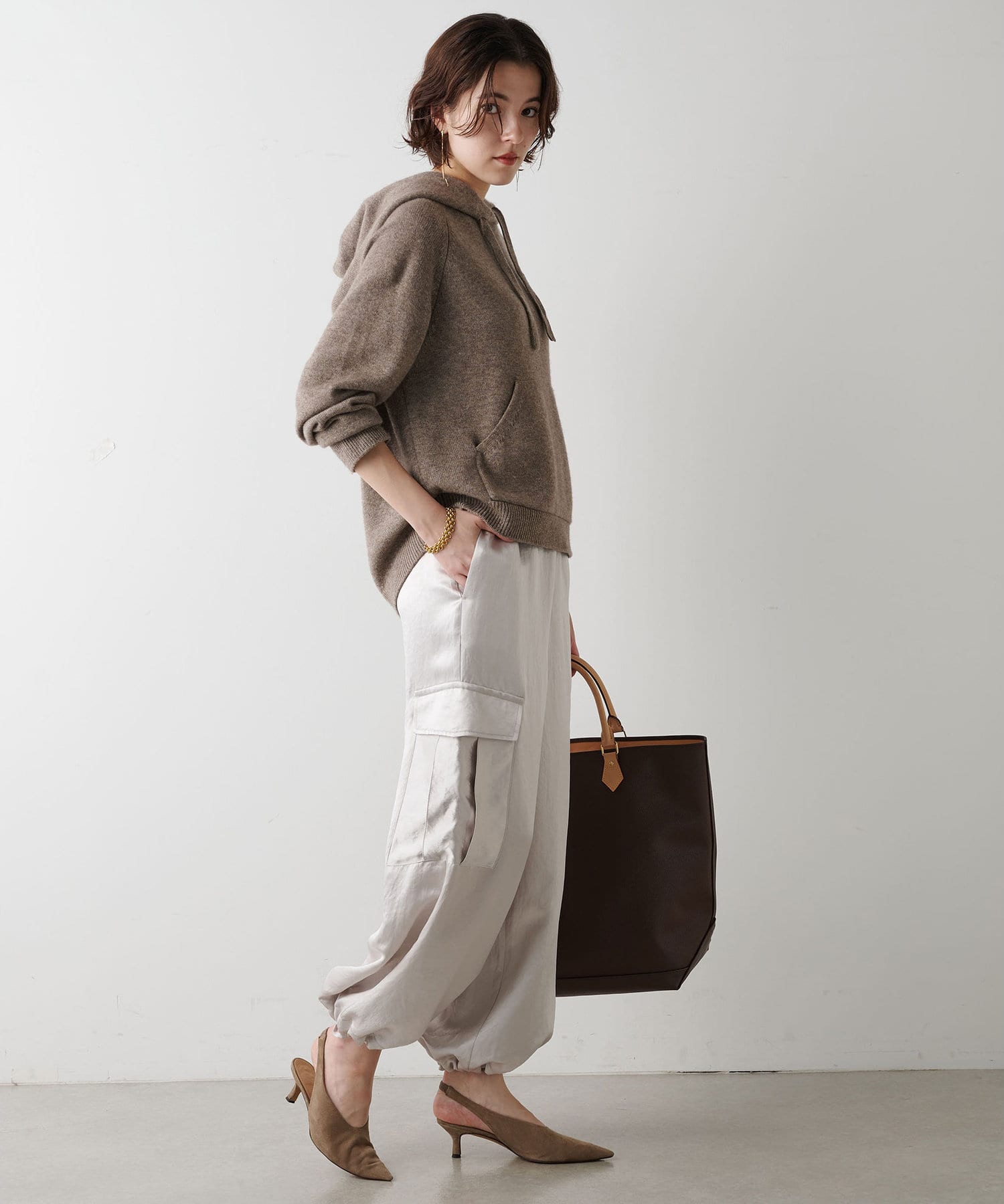 サイズ感はゆったりめだと感じました。光沢のあるボトムなので、ニットやスウェットなど秋冬のマットなトップスと相性◎履くだけでコーデがスタイリッシュになります。裾の絞り具合は調整可能。そのまま履くとボリューム感が出るので、絞り方で雰囲気を変えて楽しめそうです。