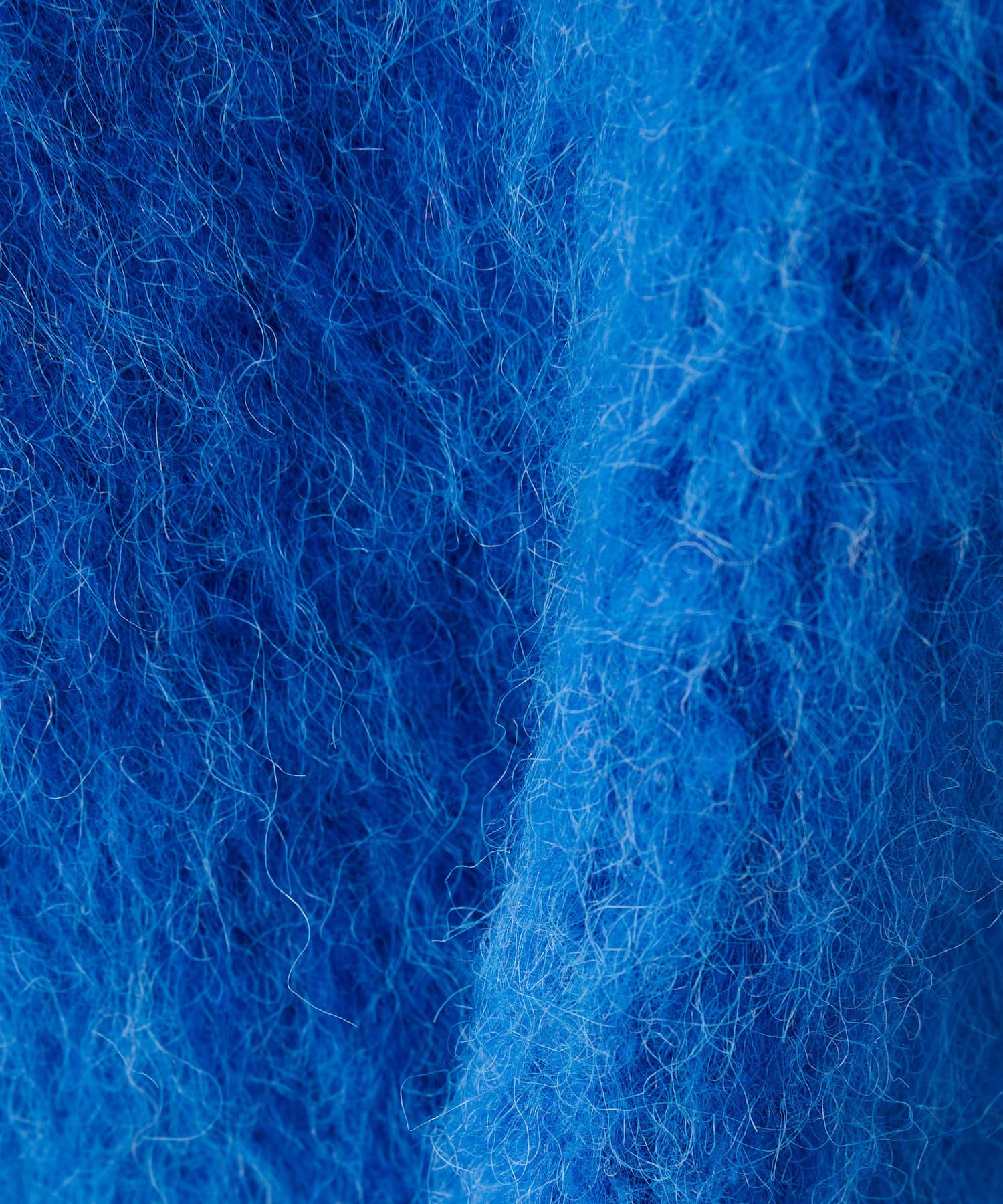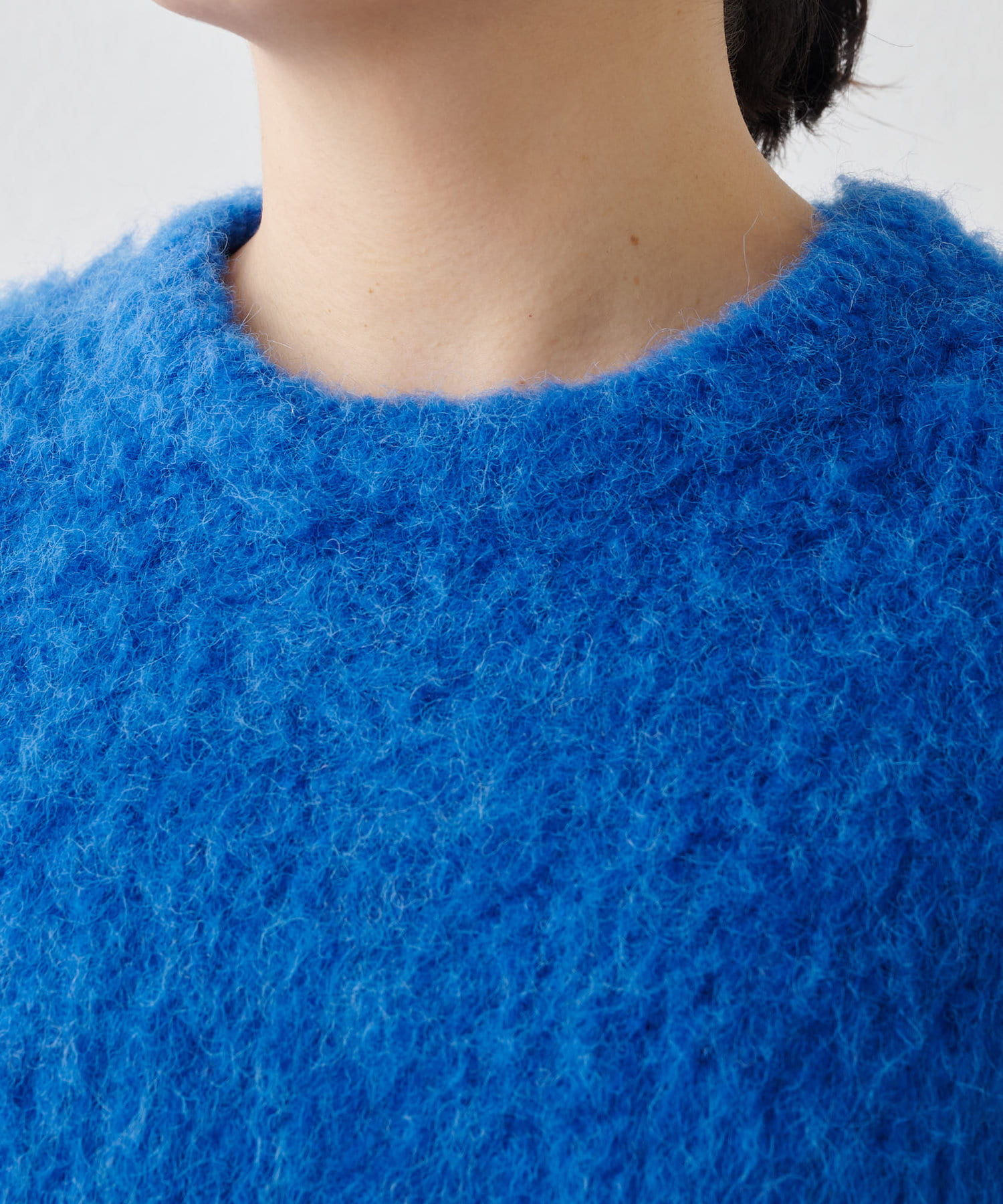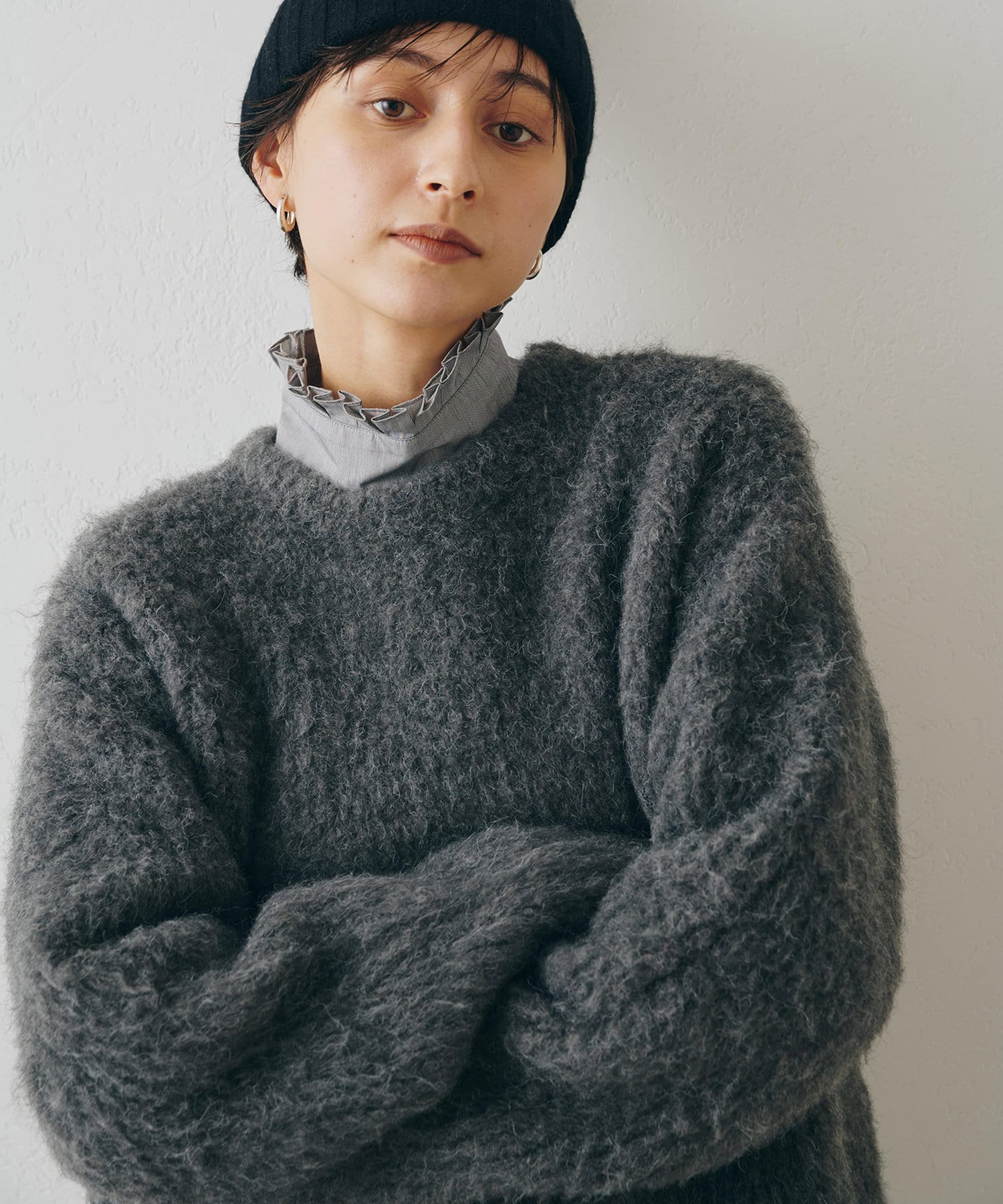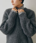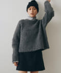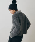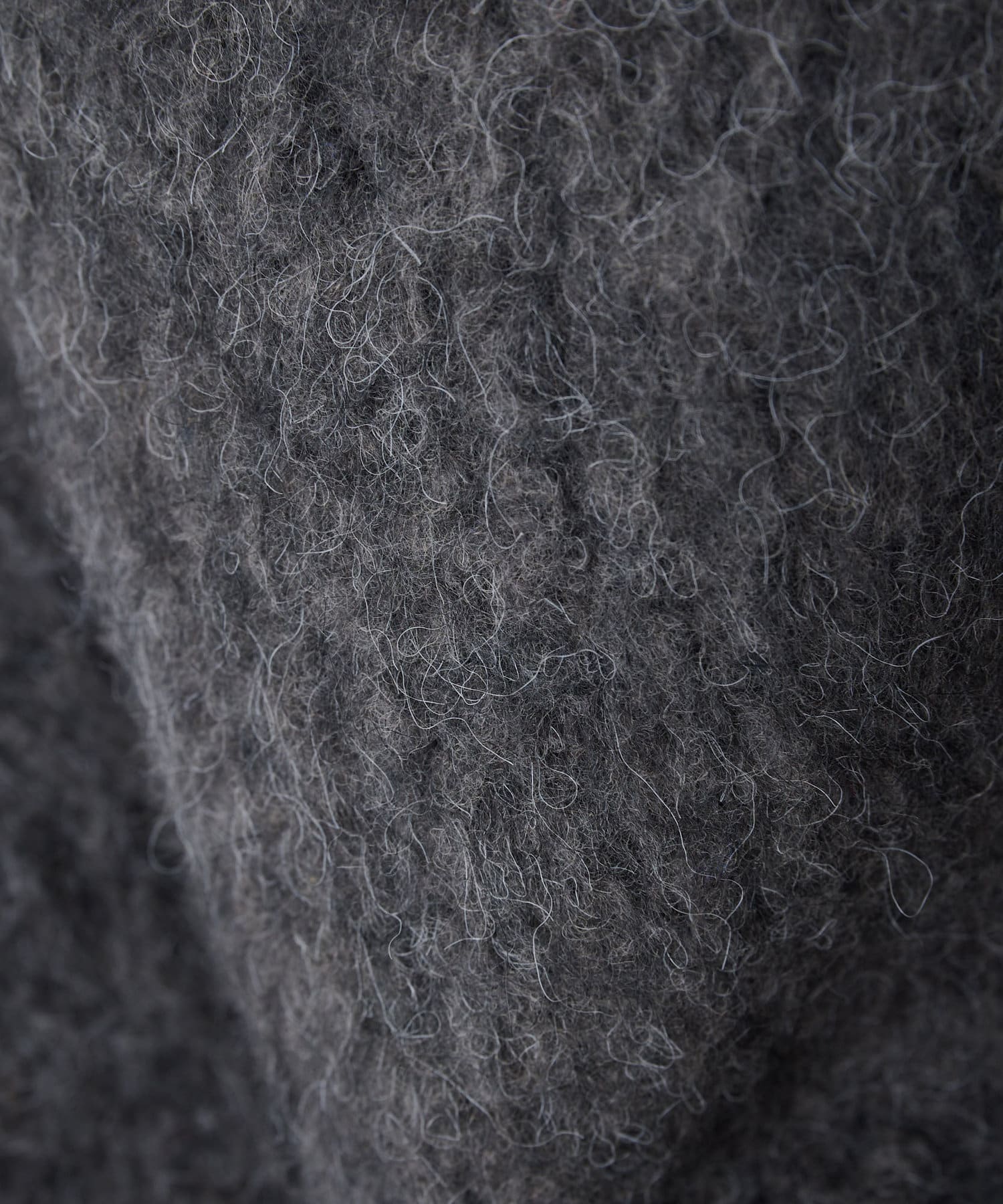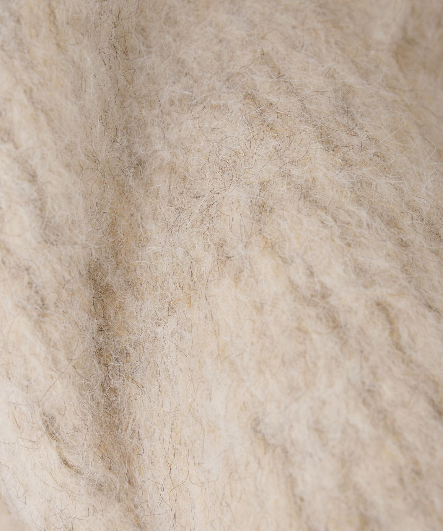 ふくらみ感と毛足が特徴のヤク混の糸とループ糸を引き揃えて起毛し、さらに毛足を出した糸を使用した編地。