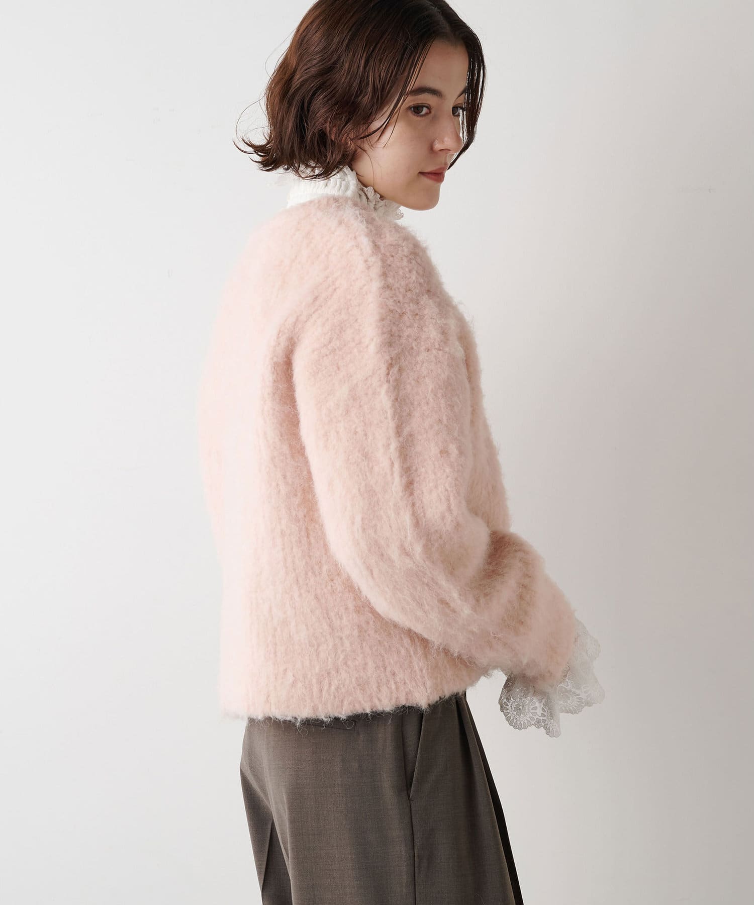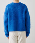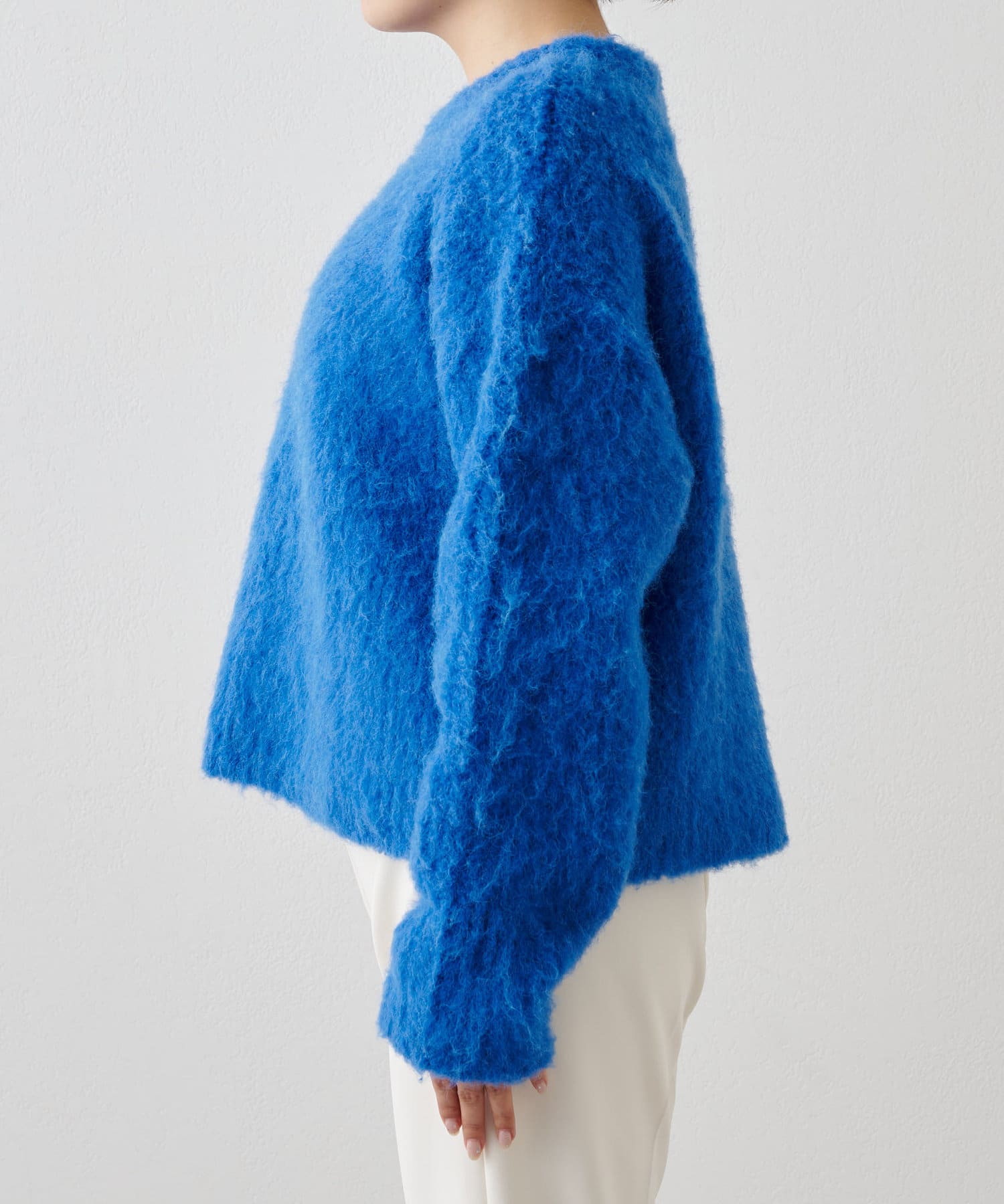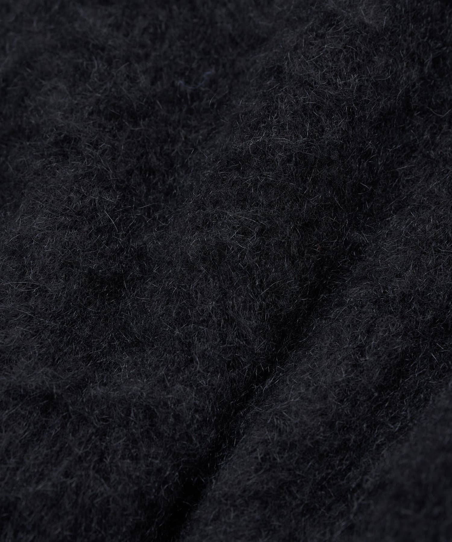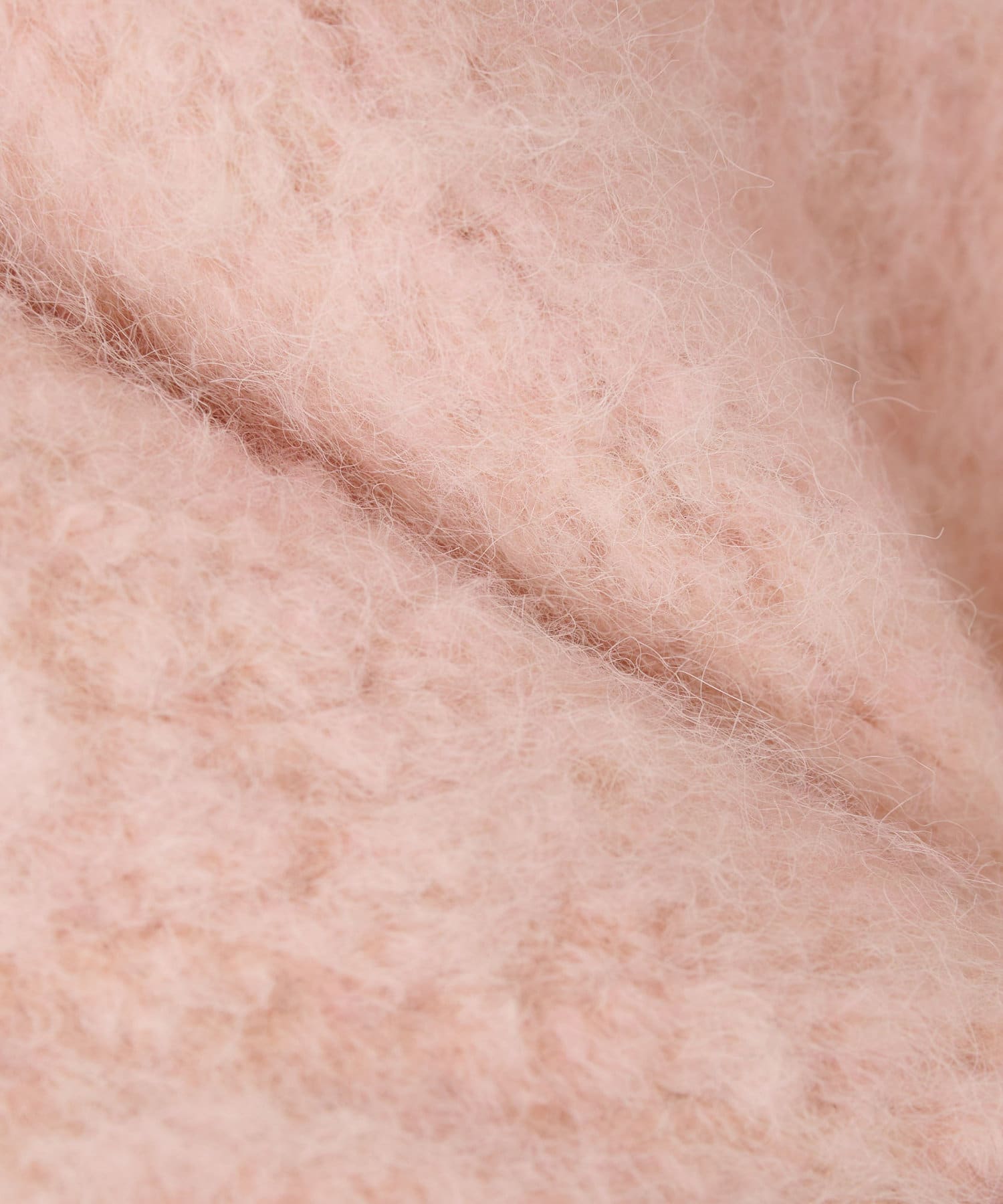 ふくらみ感と毛足が特徴のヤク混の糸とループ糸を引き揃えて起毛し、さらに毛足を出した糸を使用した編地。