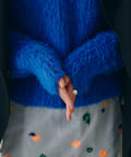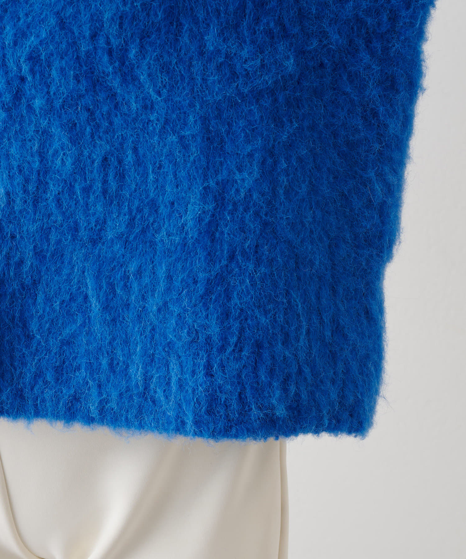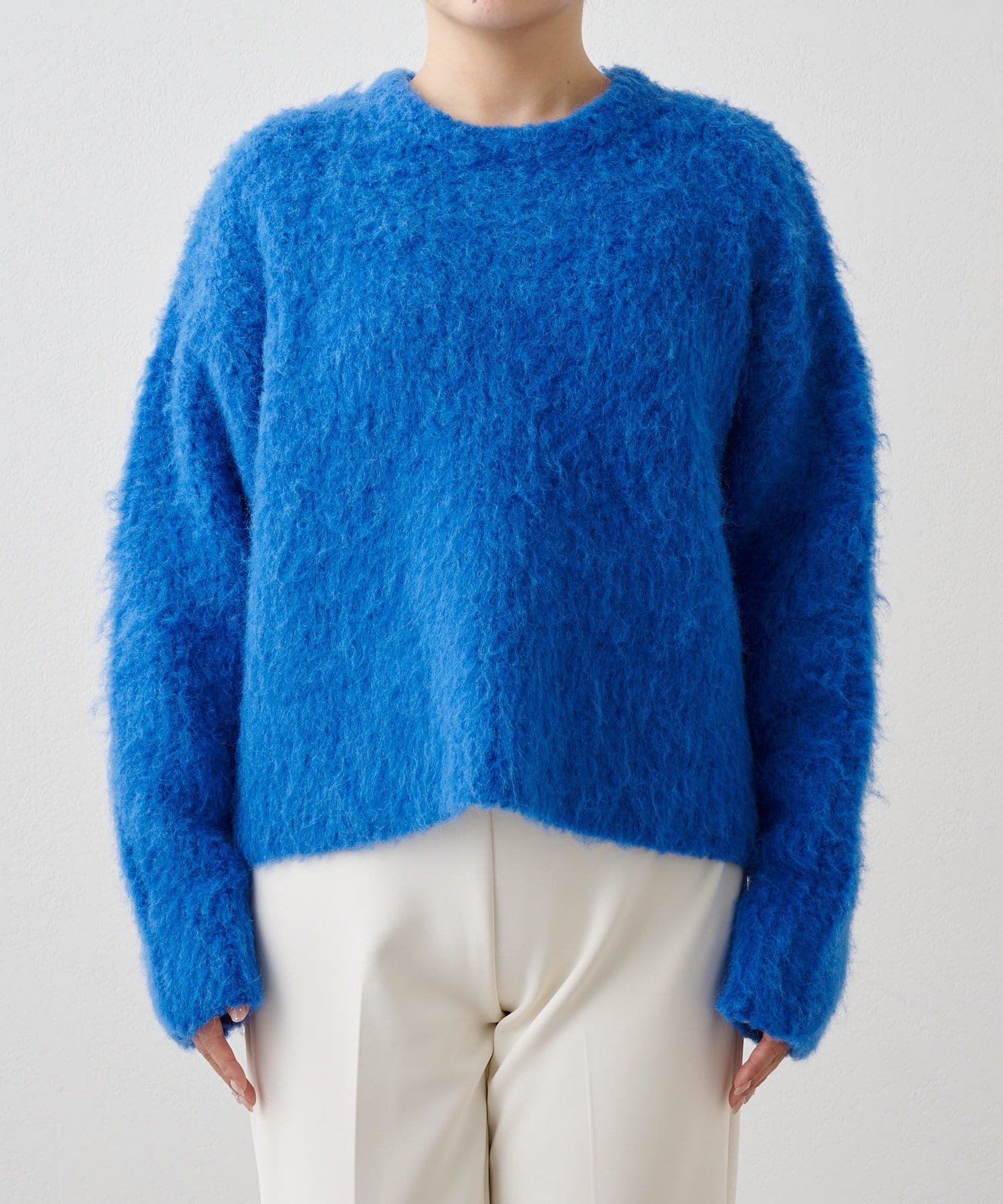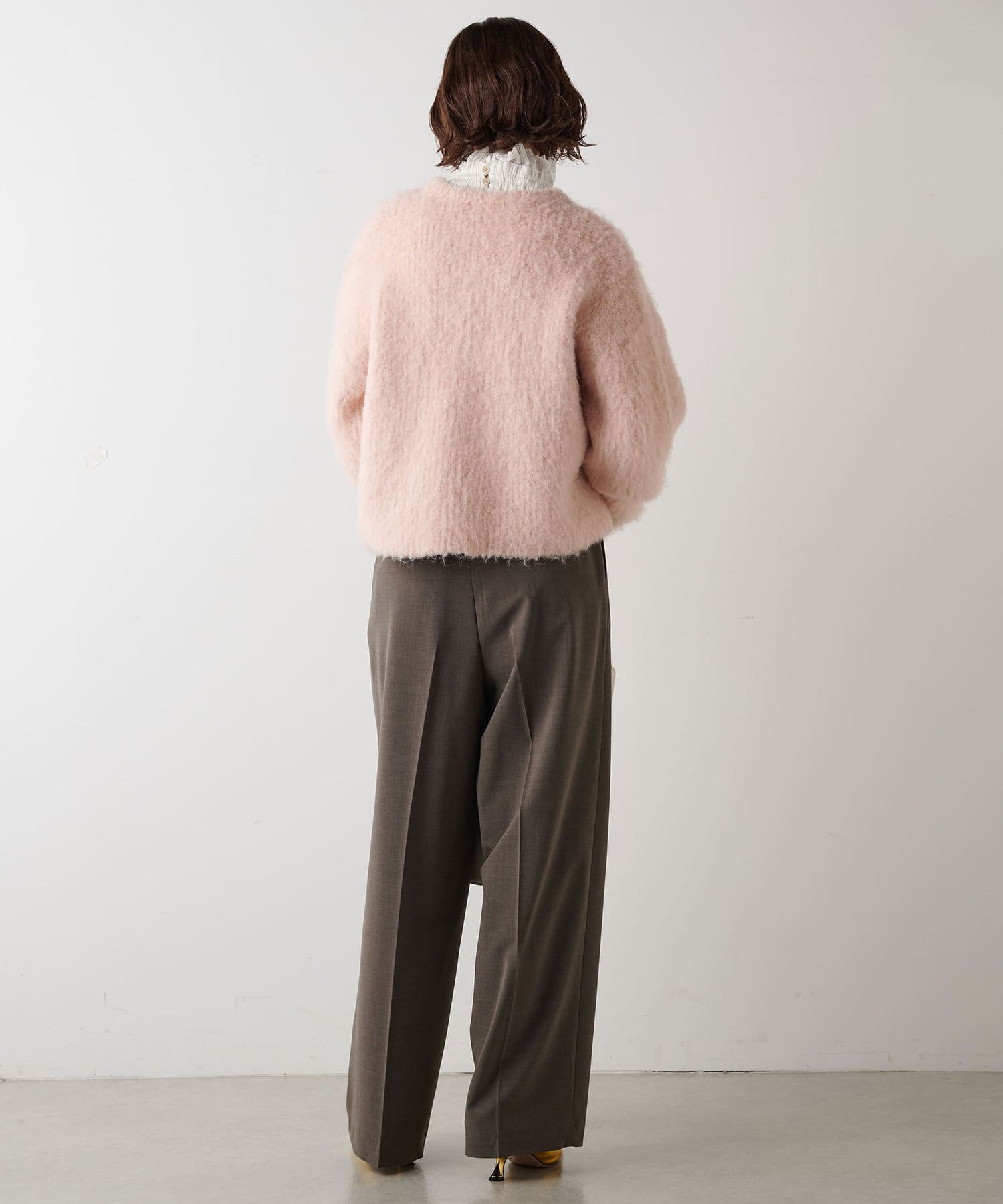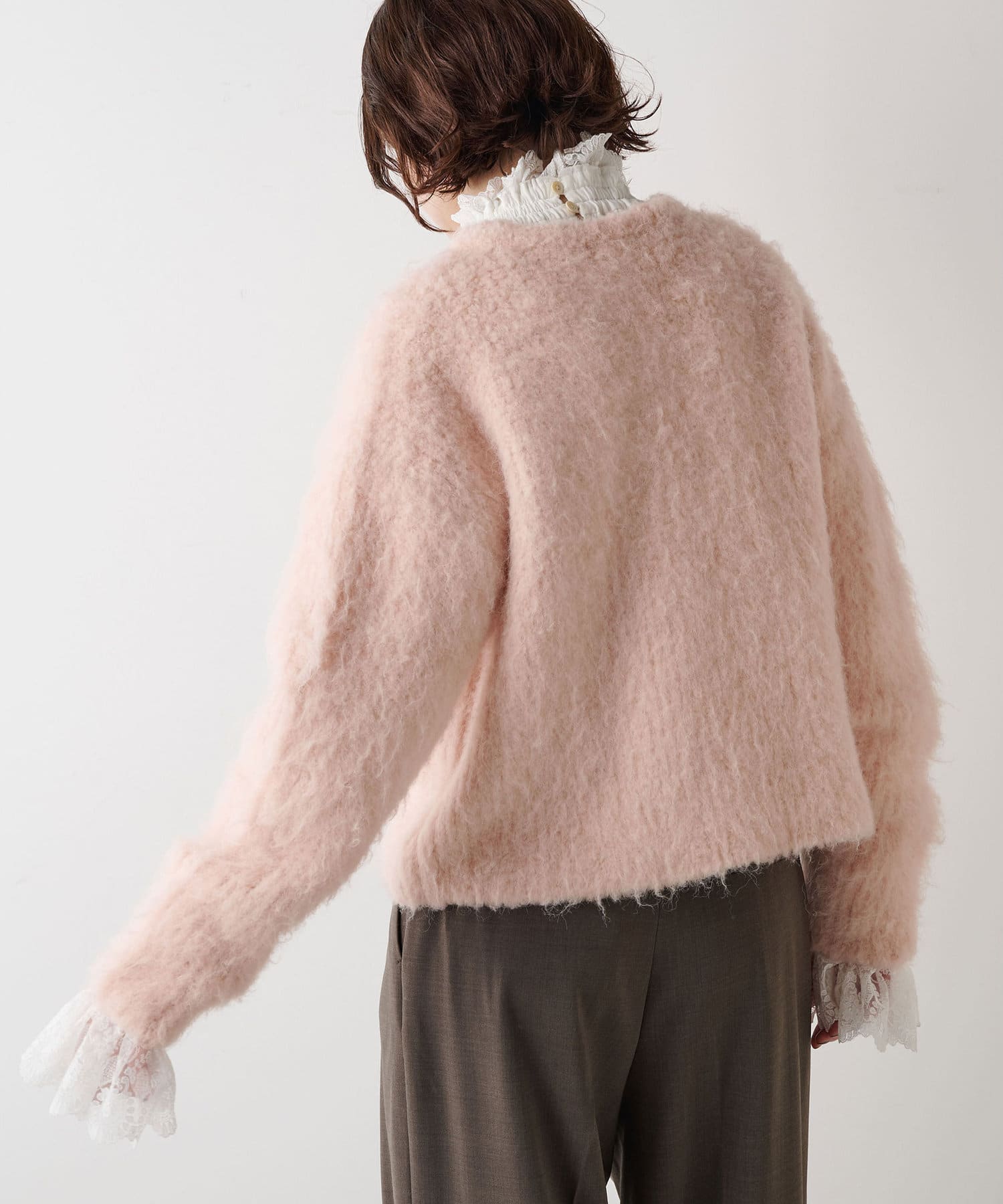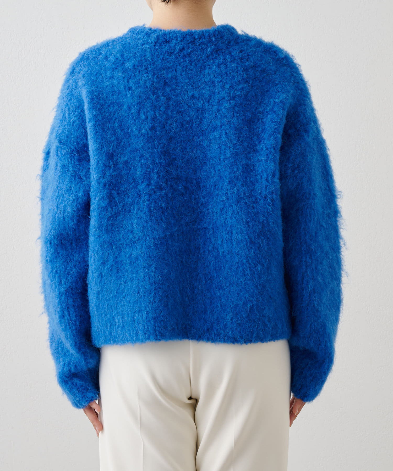 ふくらみ感と毛足が特徴のヤク混の糸とループ糸を引き揃えて起毛し、さらに毛足を出した糸を使用した編地。