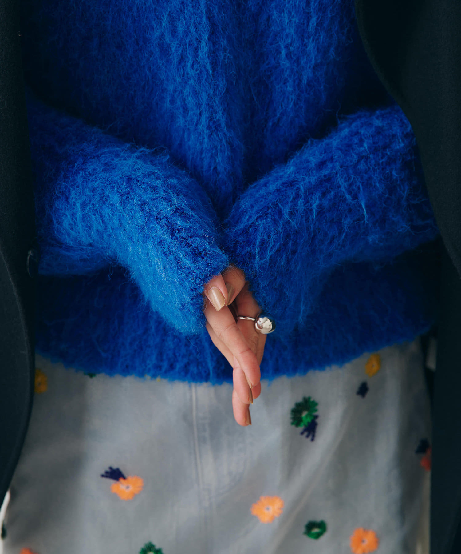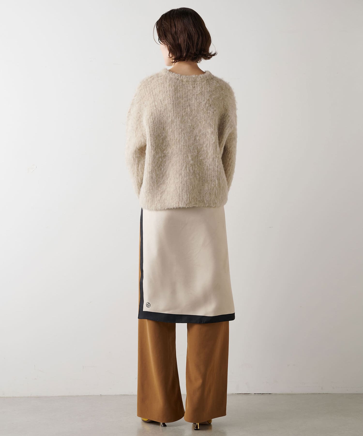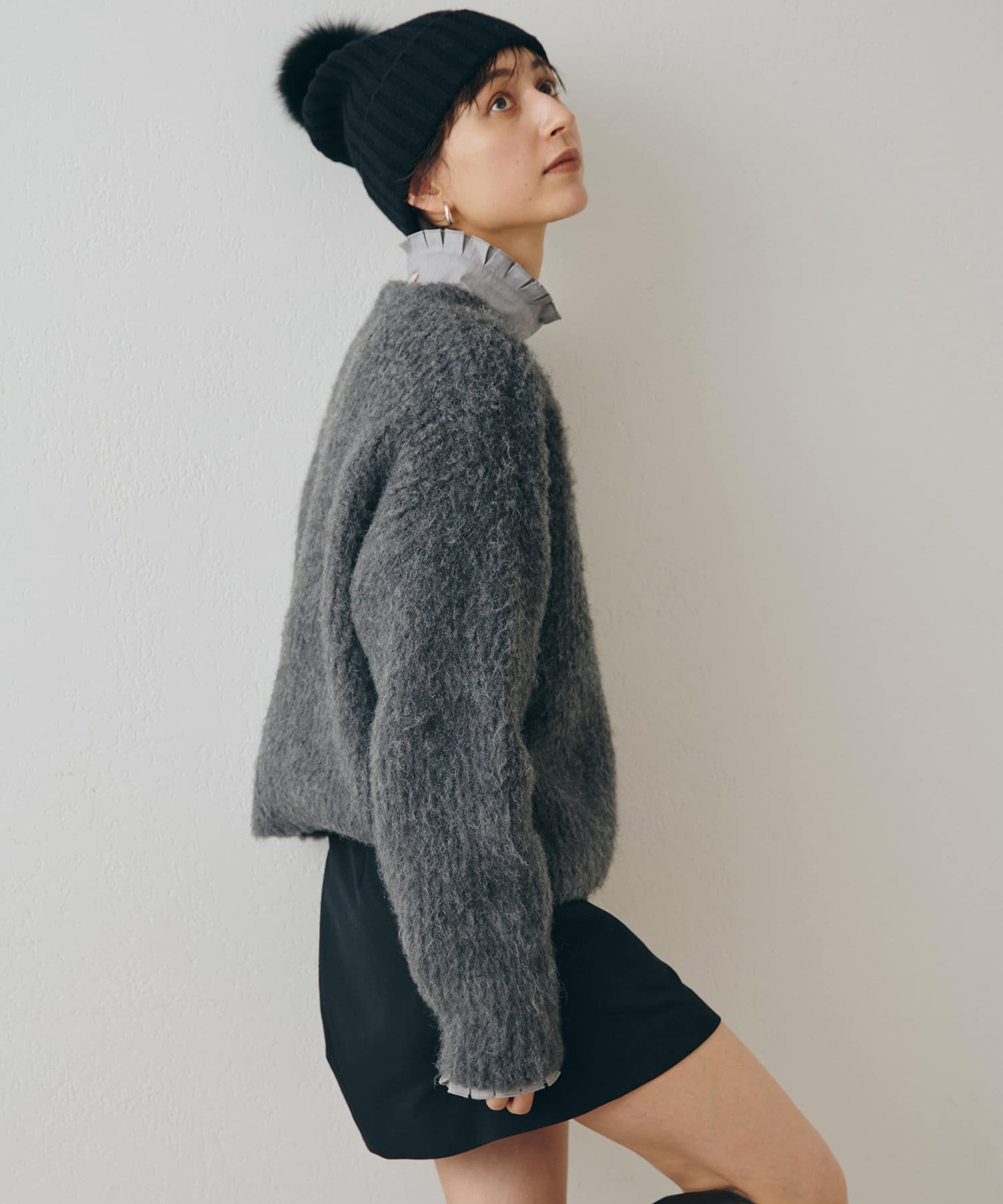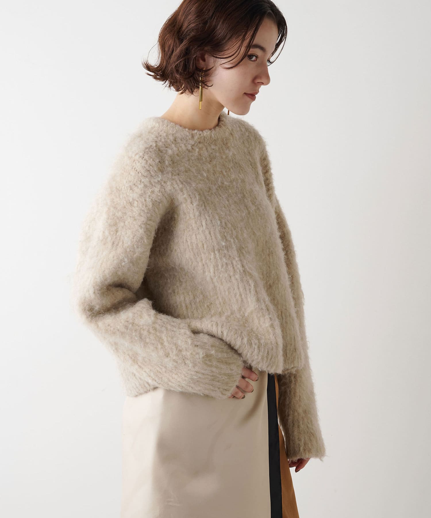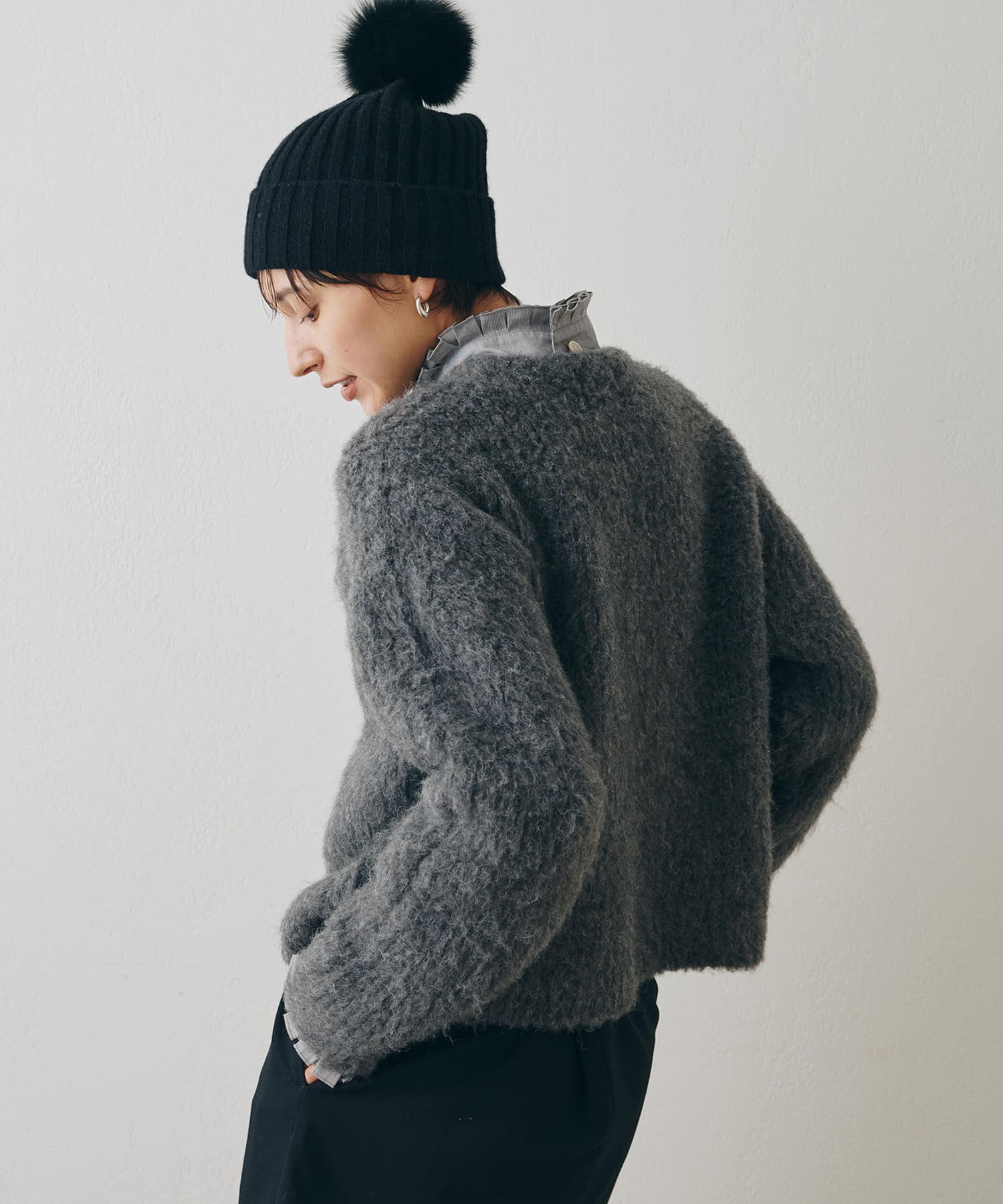 ■2本の糸を撚り合わせMIX感のあるニットに仕上げ、ふんわりとした表面感と目の立った存在感のある編地が魅力。