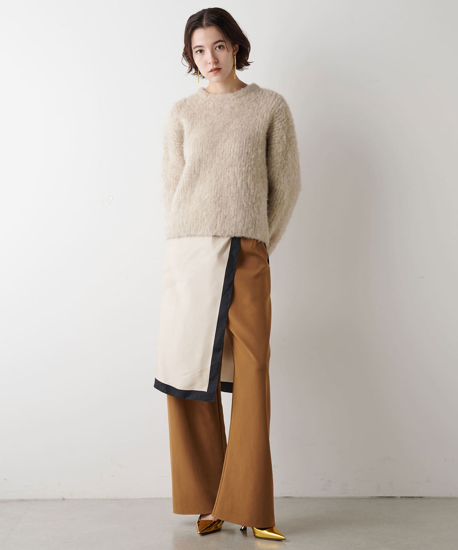 カラー展開が豊富でお好みのカラーが見つかるはずです。肉厚のわりには、ボリュームを感じにくく、裾を出しても良いですし、インしてもフォルムがきれいです。華やかで日常で着回せる優秀ニットです。