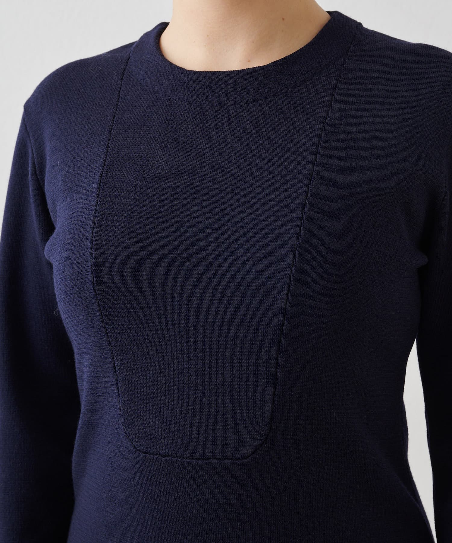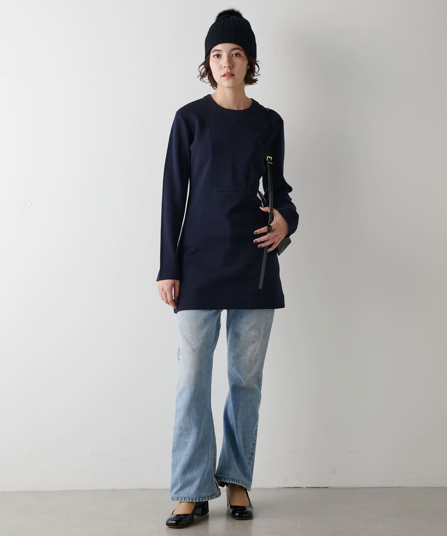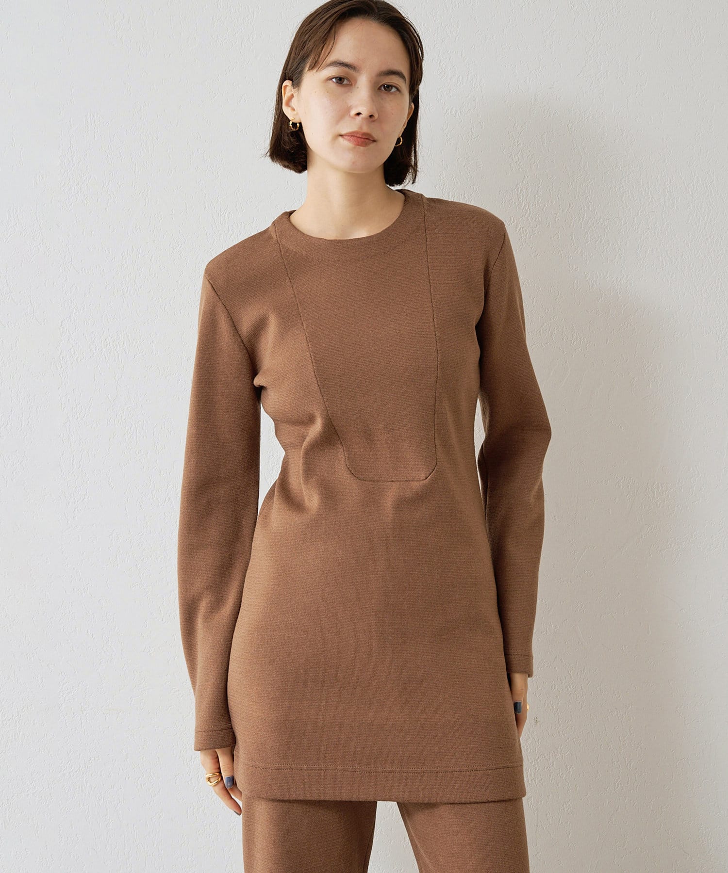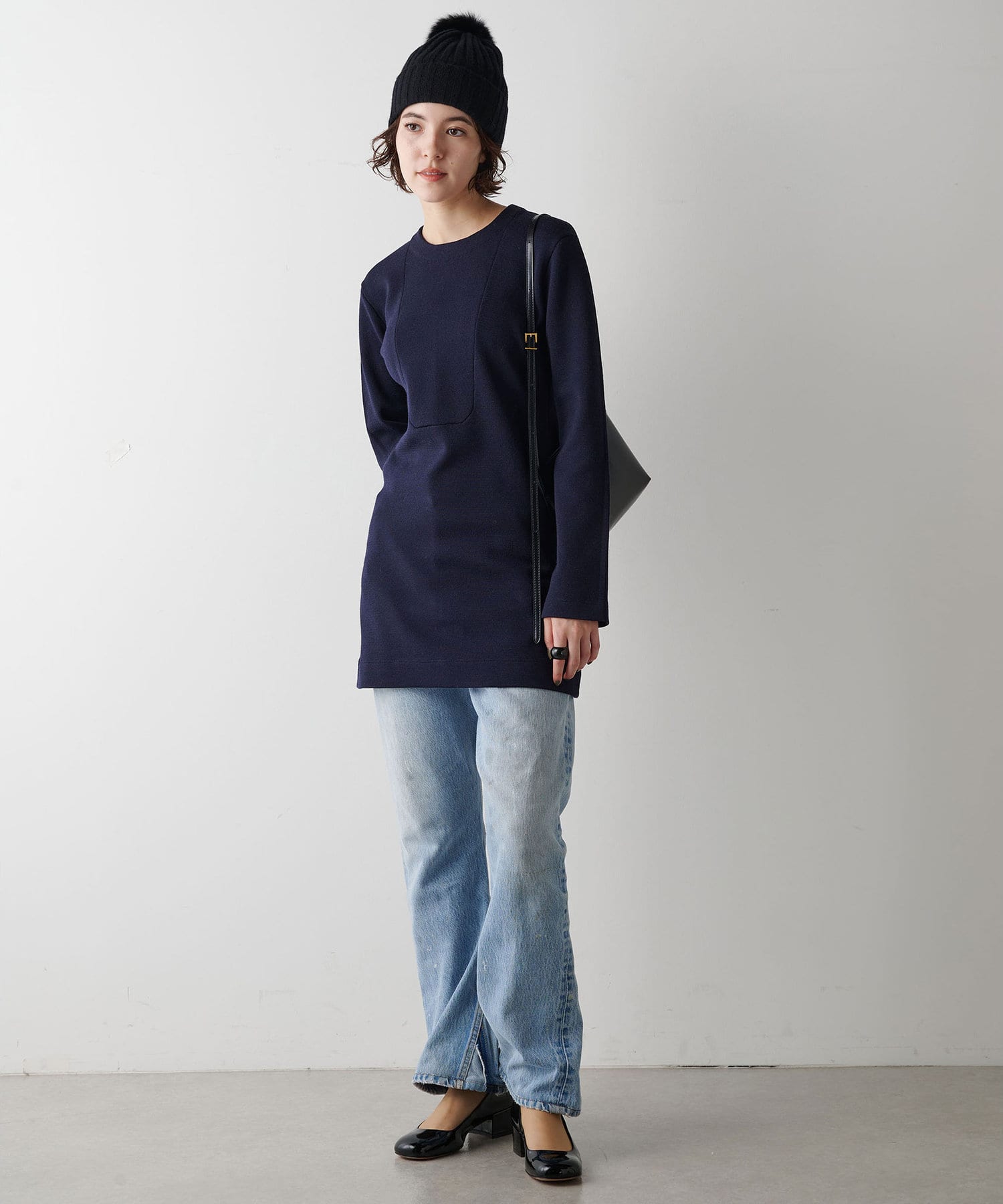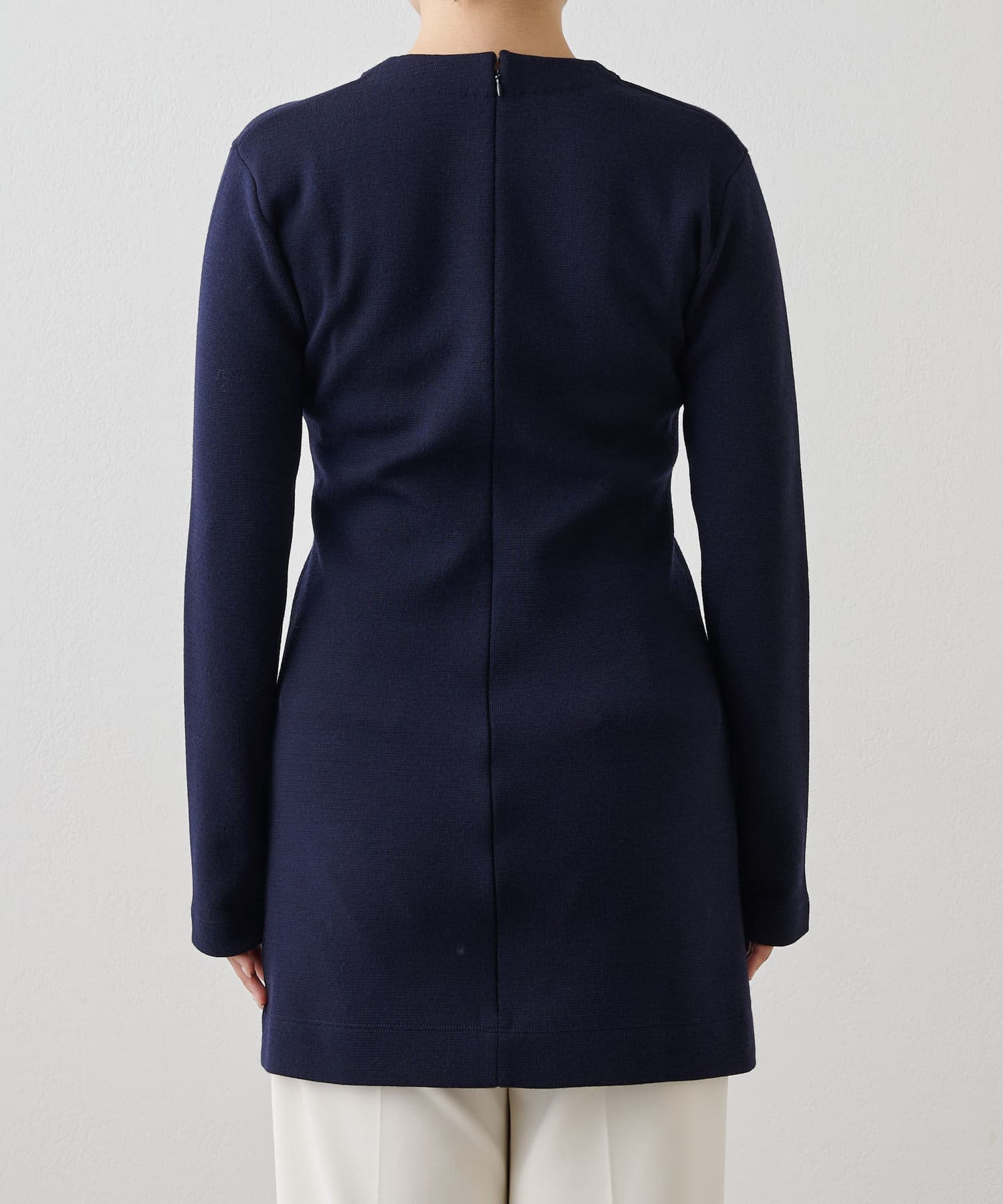 ウールを含みますがさらりとしたニット生地です。体のラインは拾いすぎませんが、ウエストラインはすっきりと見せてくれます。肩幅もジャストでアウターなどに困らず着ていただけますよ。