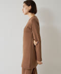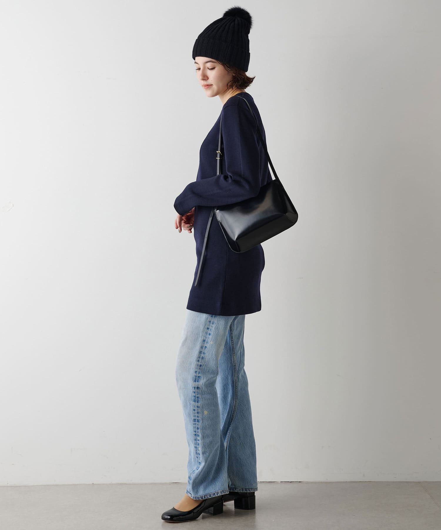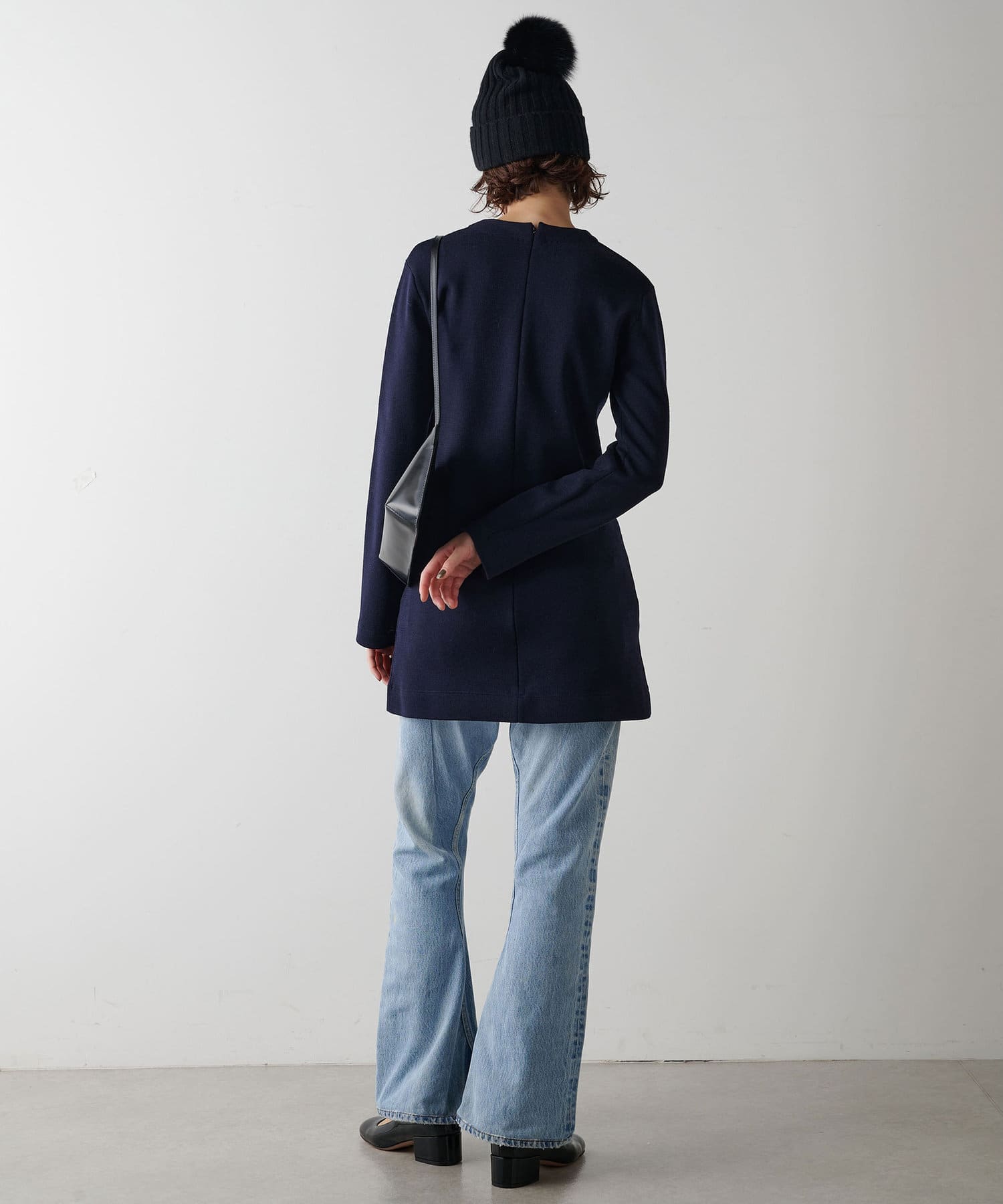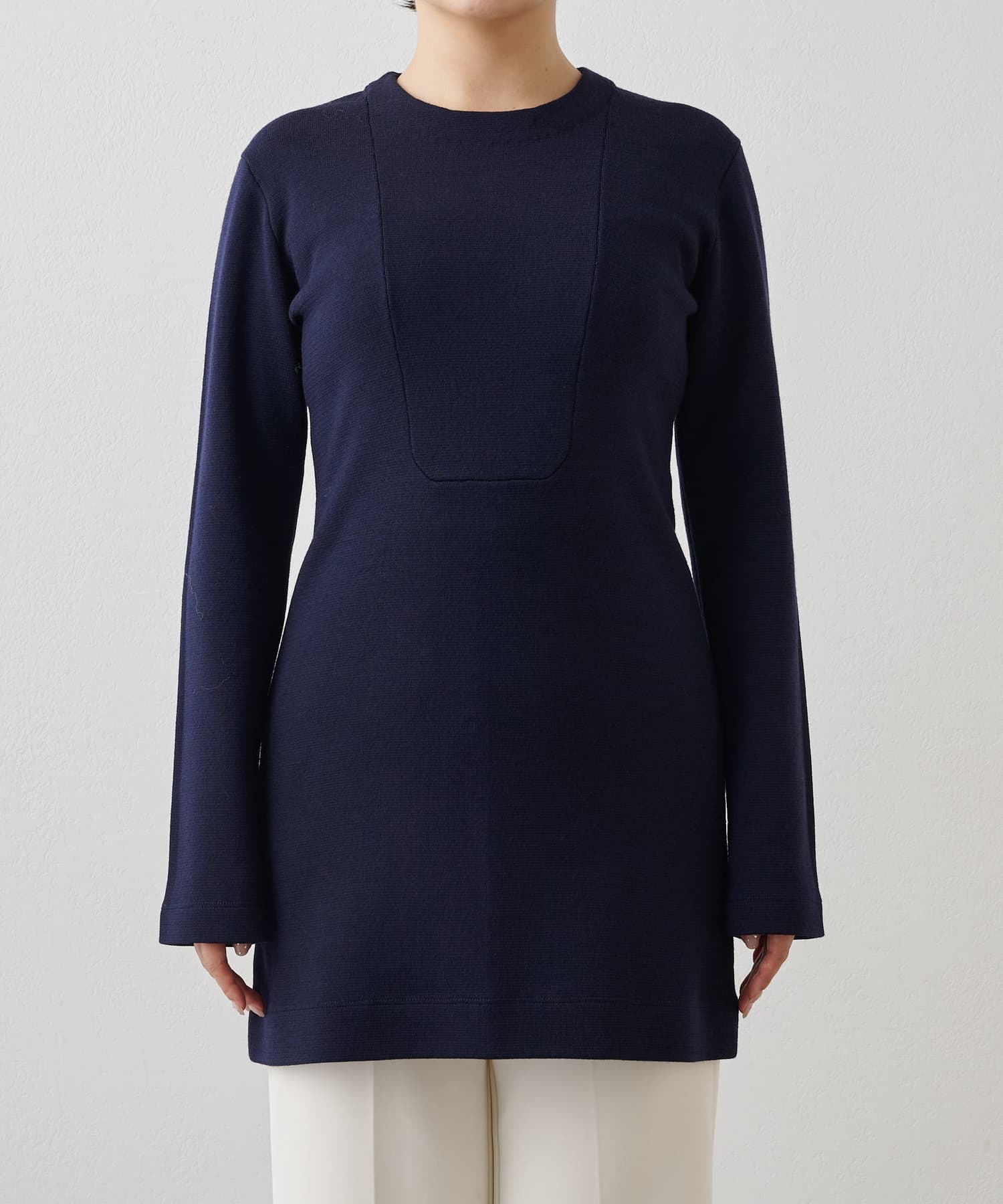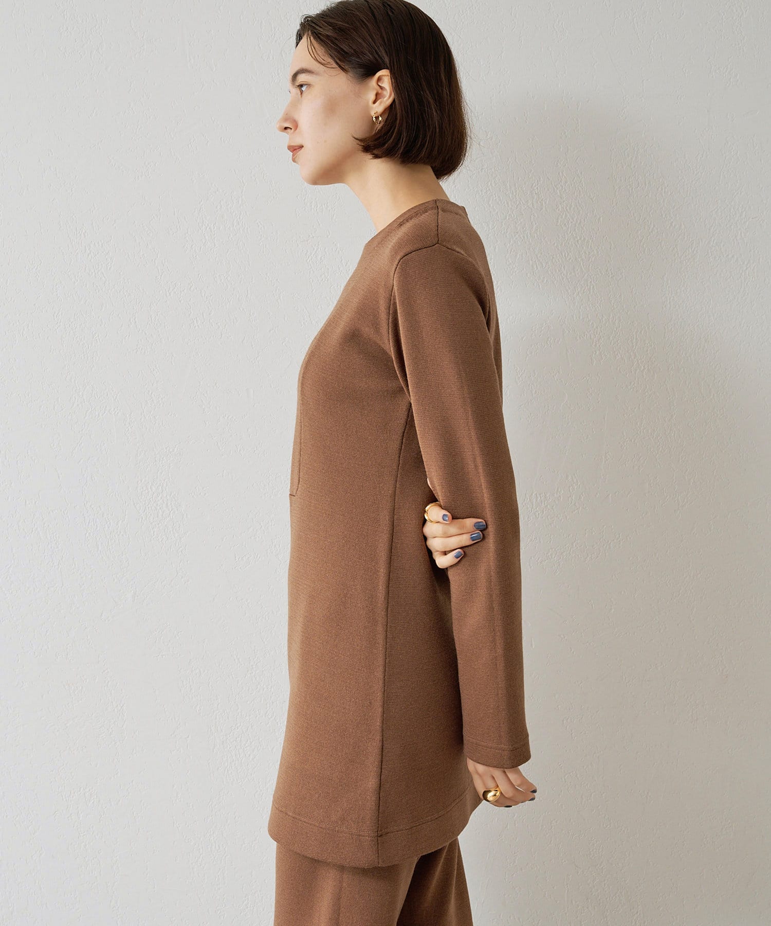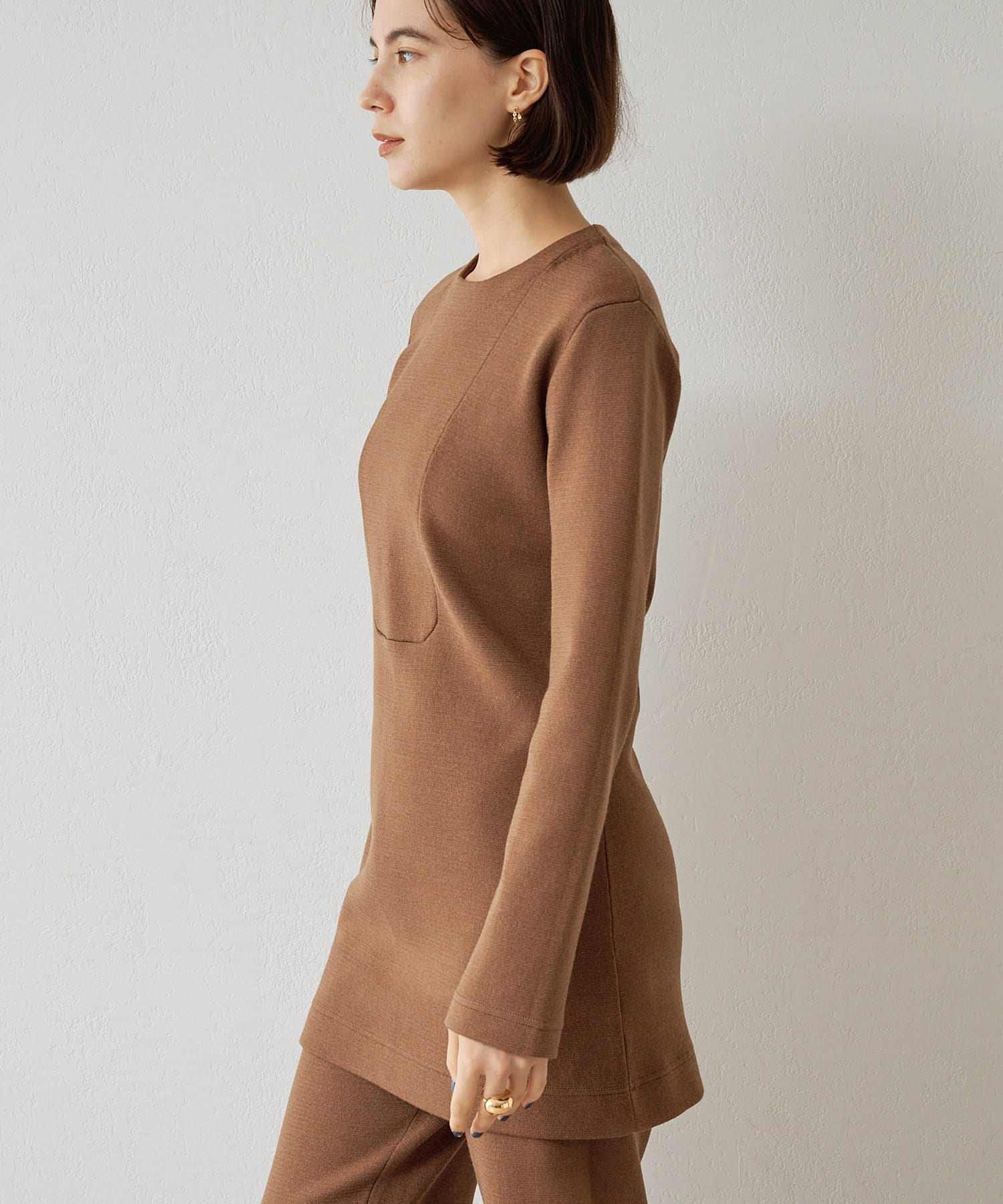 ウールを含みますがさらりとしたニット生地です。体のラインは拾いすぎませんが、ウエストラインはすっきりと見せてくれます。肩幅もジャストでアウターなどに困らず着ていただけますよ。