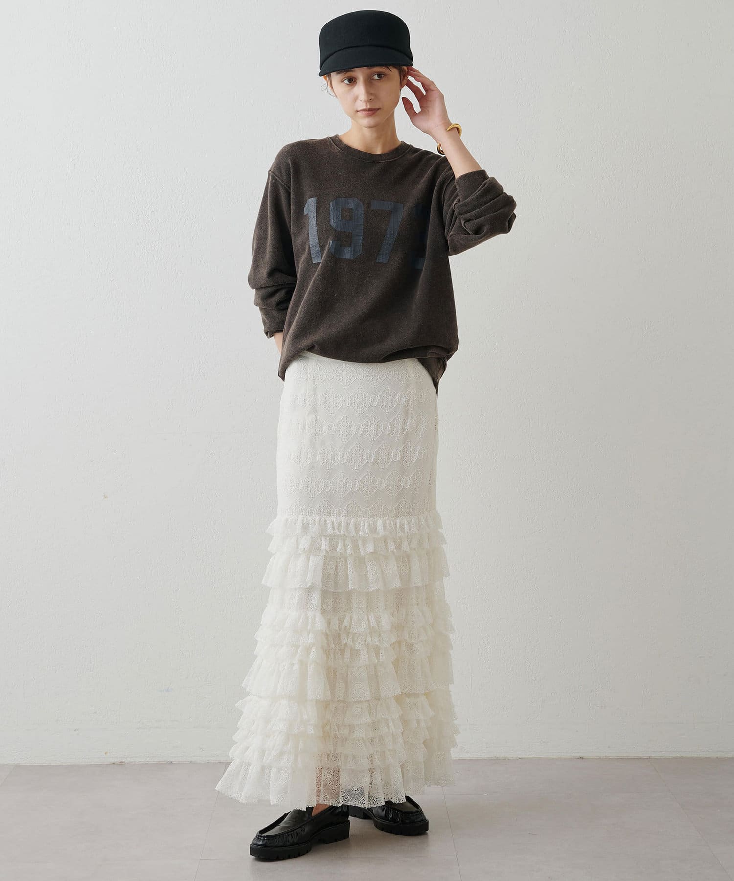 秋にはタートルニットやシャツをレイヤードした着こなしもおすすめです。厚手過ぎないスウェットなので上からアウターも羽織やすいです。数字のロゴがコーデのワンポイントになります。