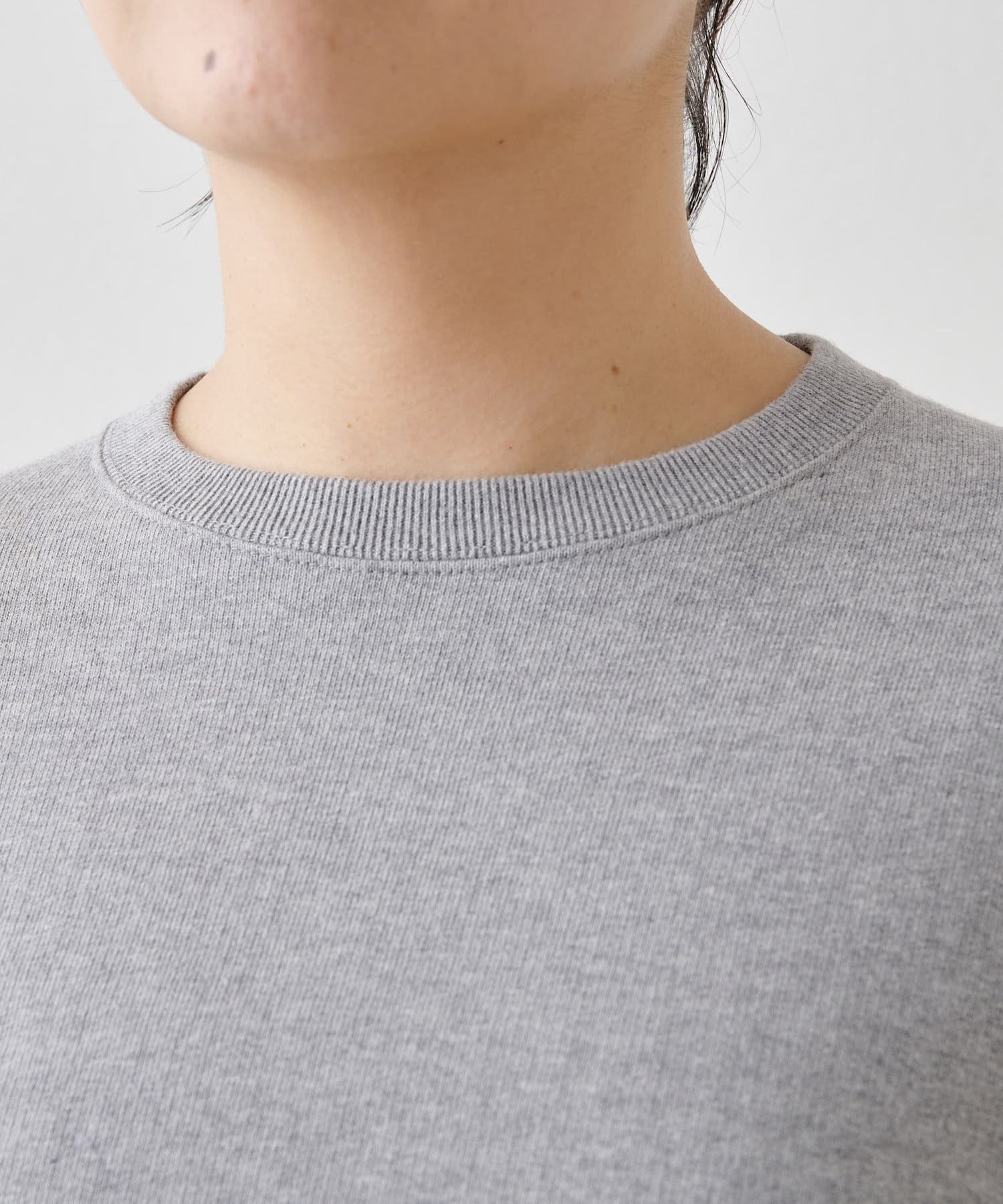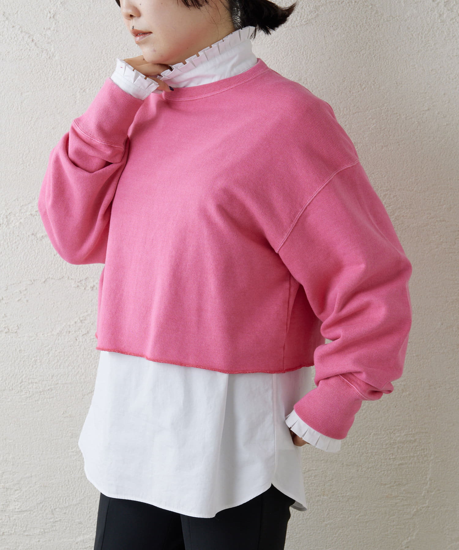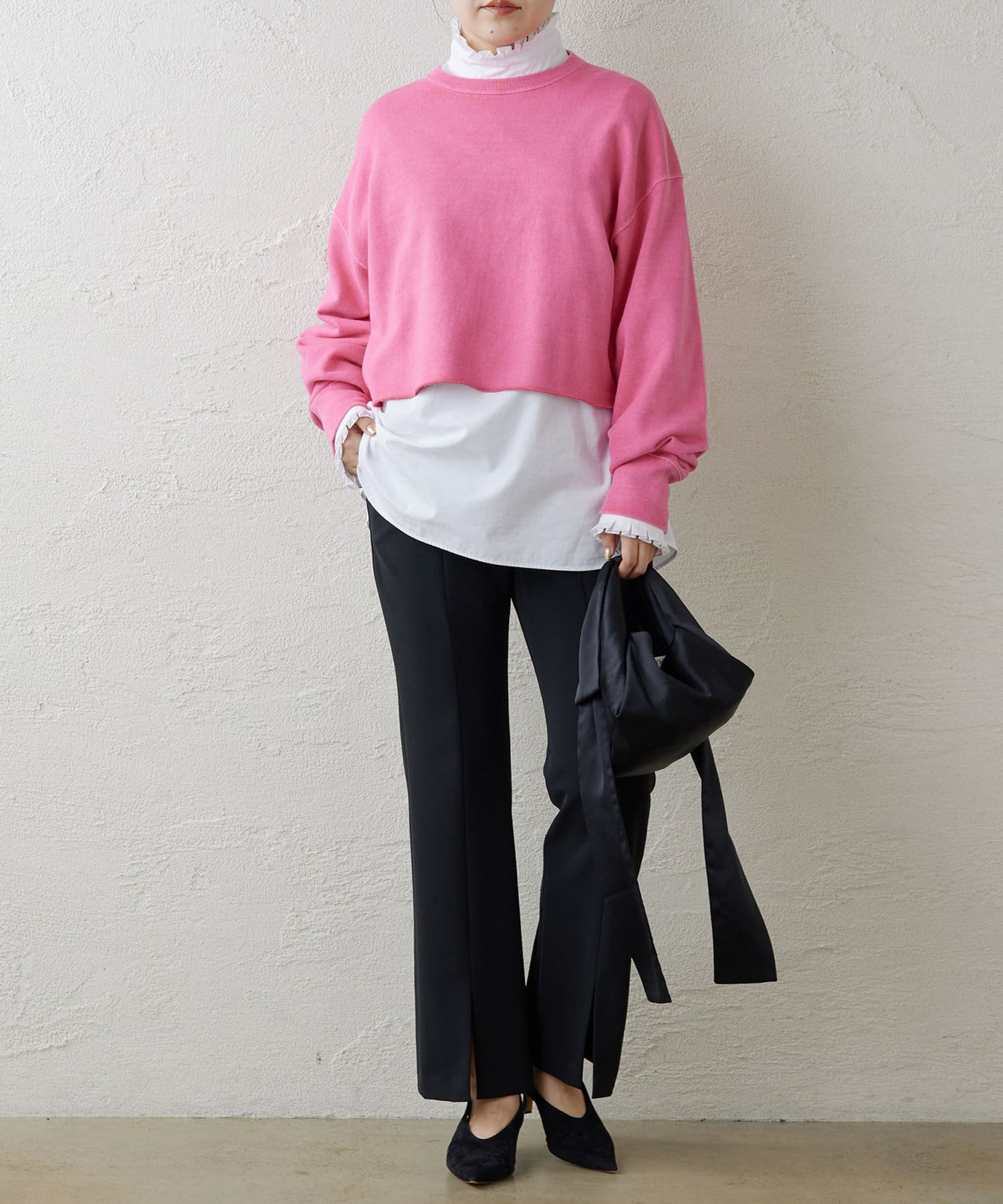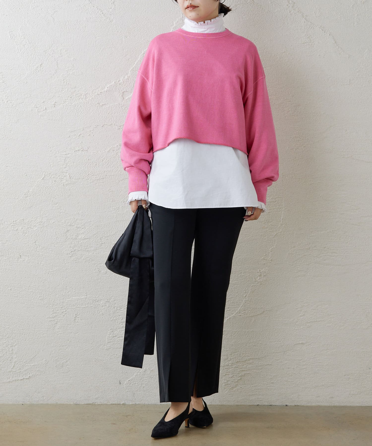 着回しが効くシンプルスウェット。子供っぽくならないようにシルエットが絶妙なバランス。肌寒い季節でも温度調節に優れ長く愛用できます◎。