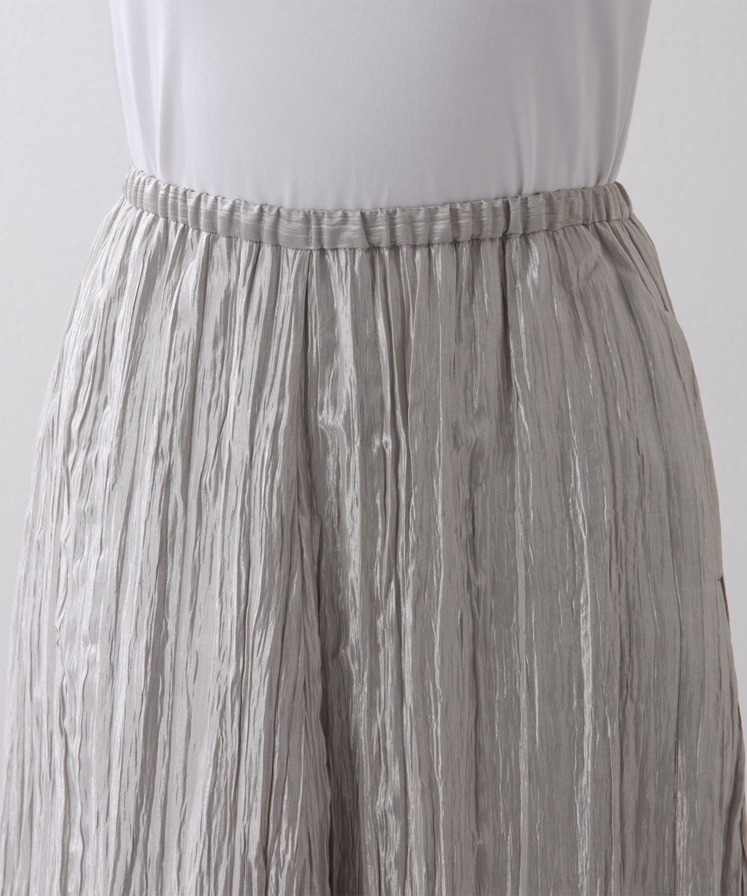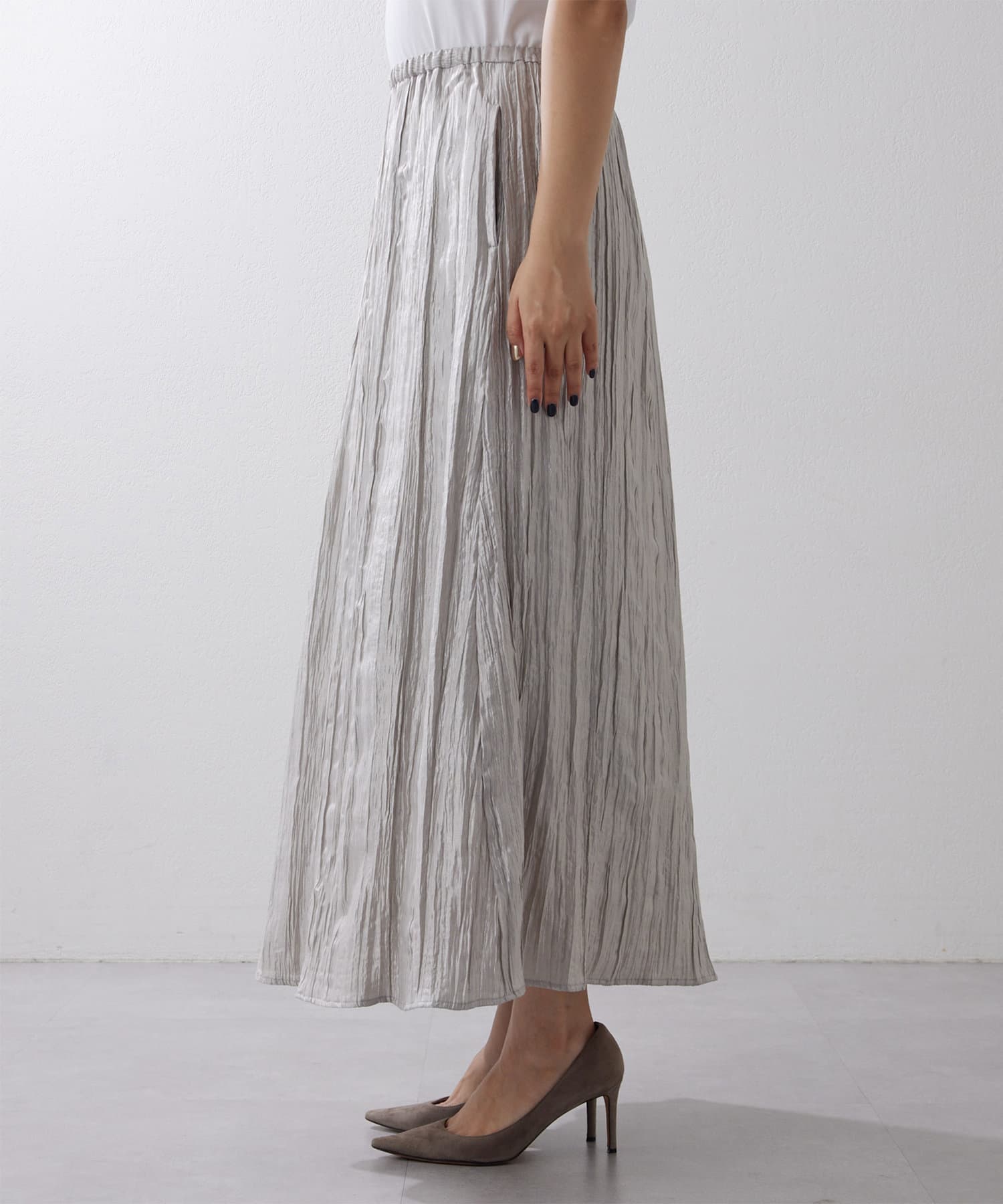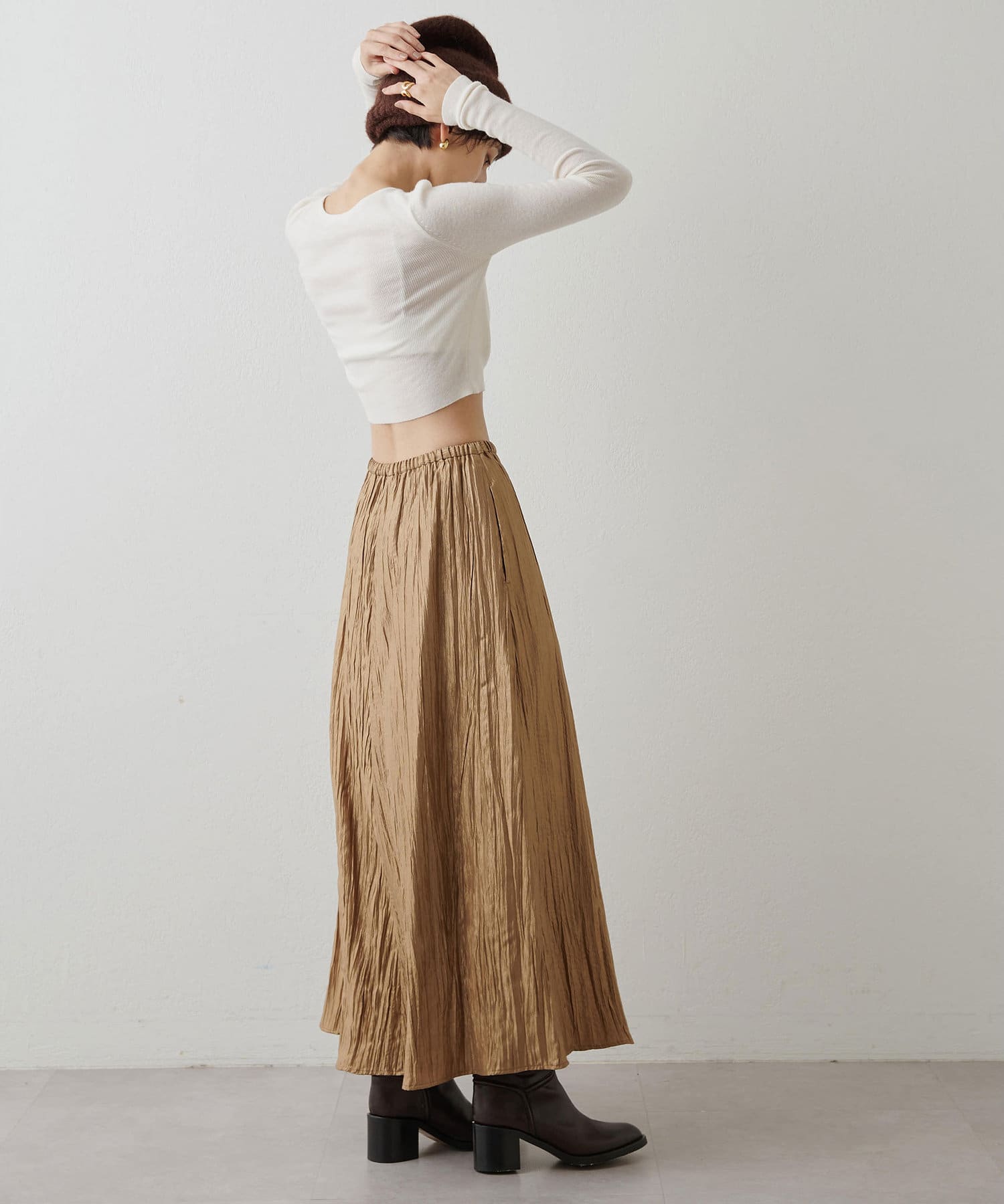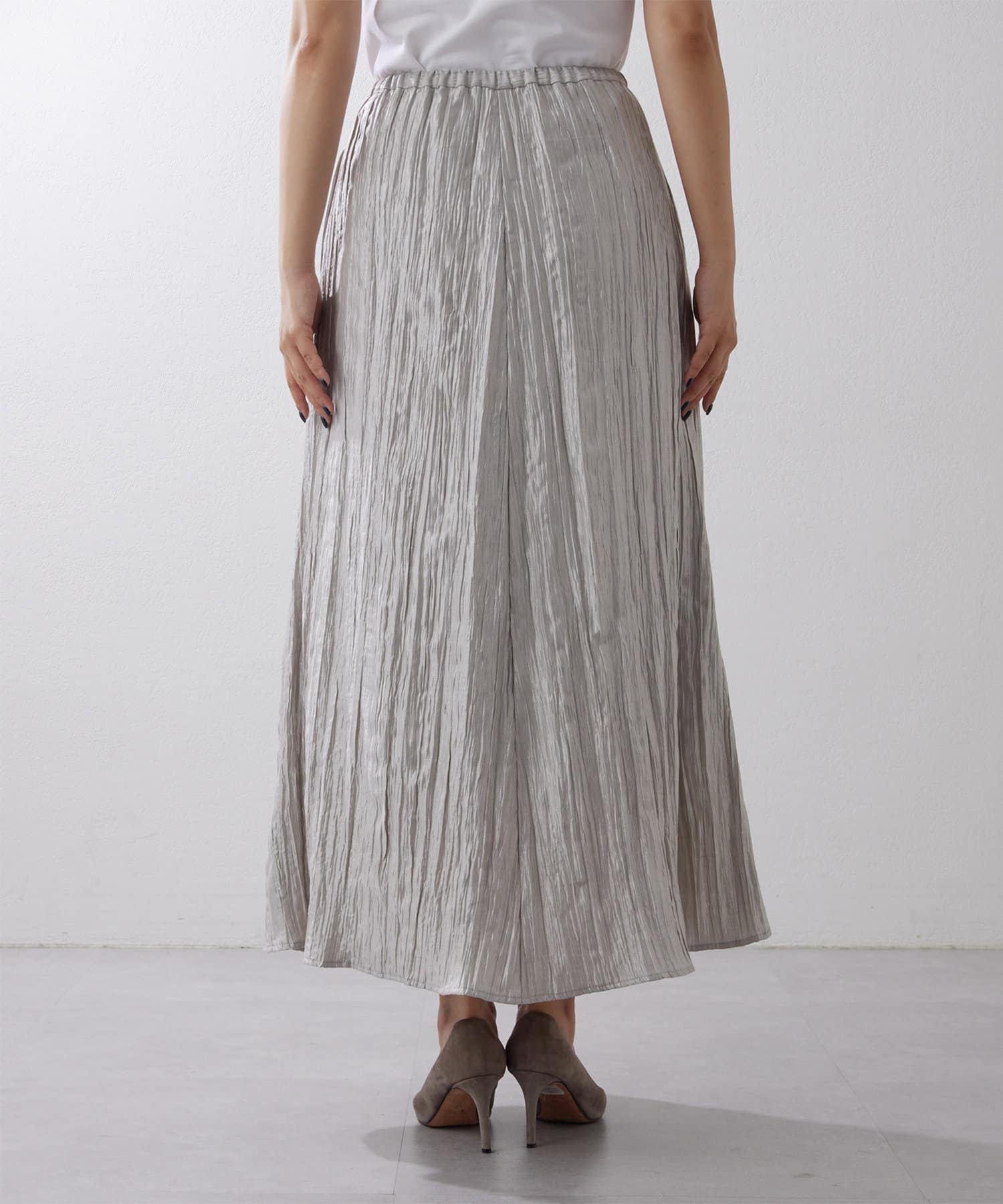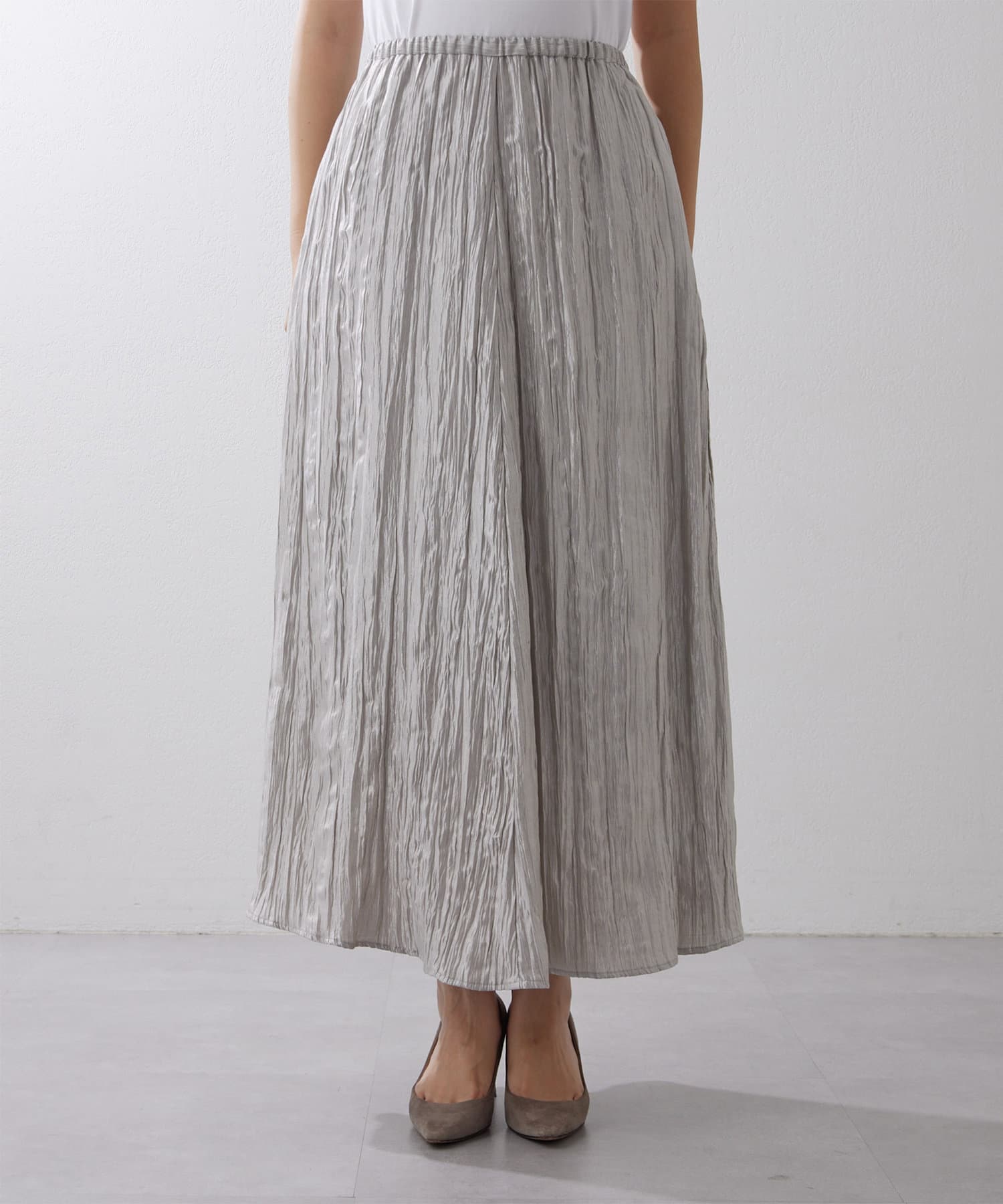 ■ワッシャー加工によるシワ感で生地の光沢が際立つフレアスカート。