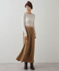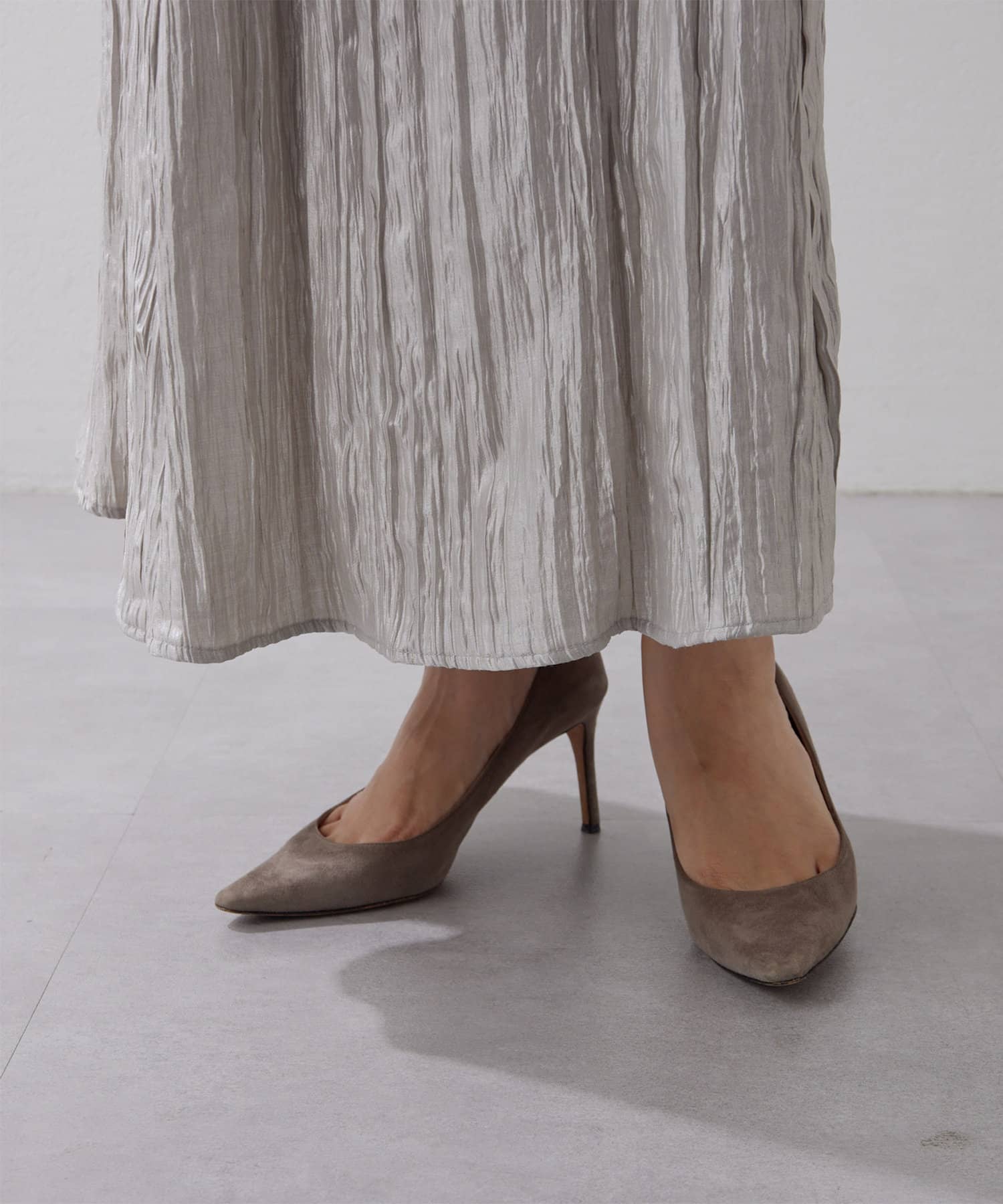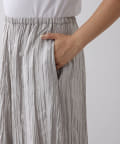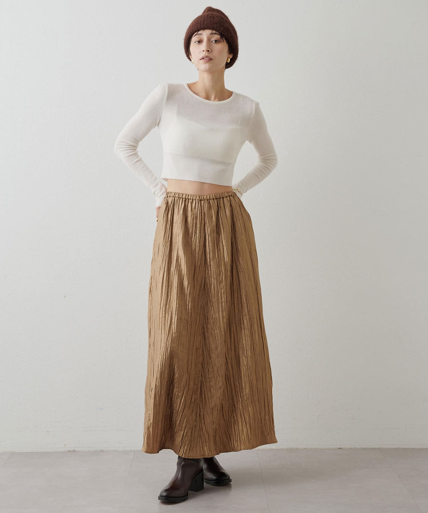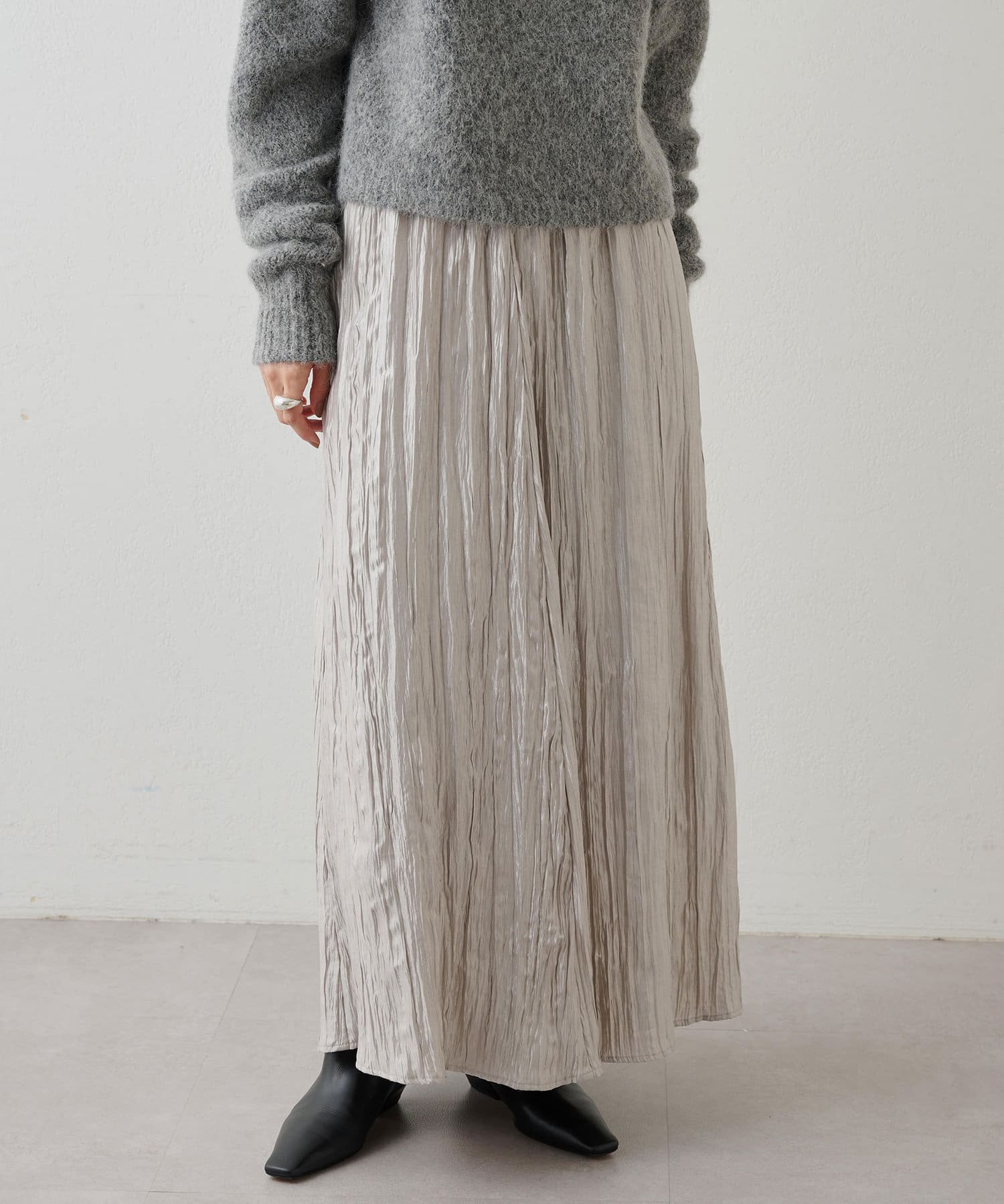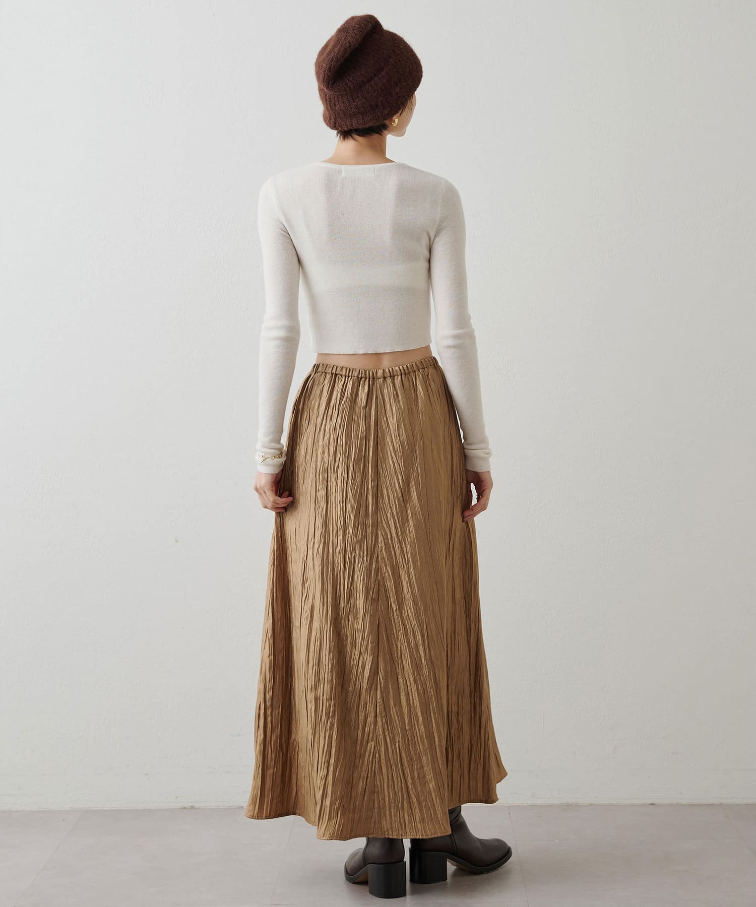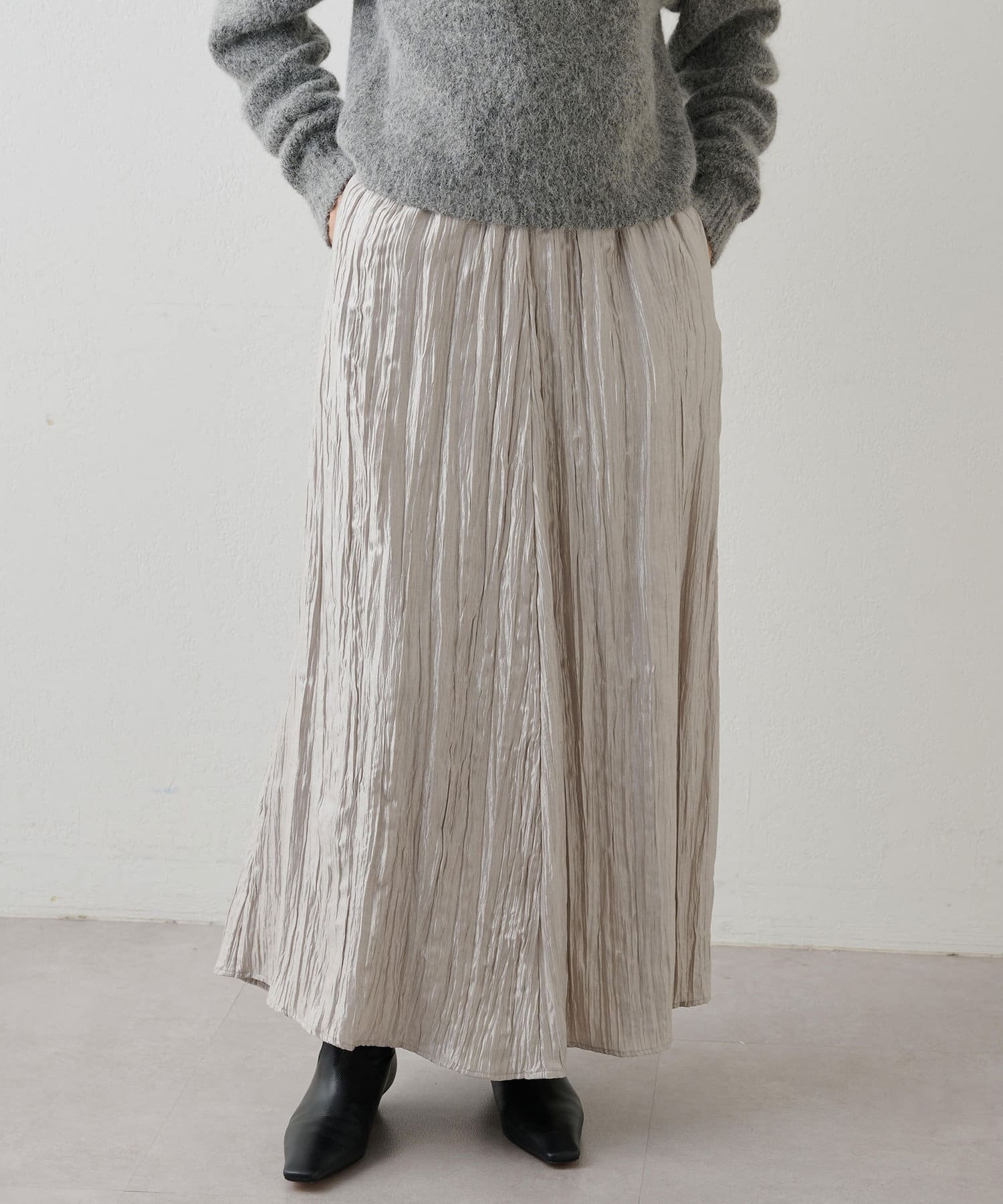 ■ワッシャー加工によるシワ感で生地の光沢が際立つフレアスカート。