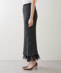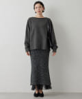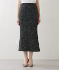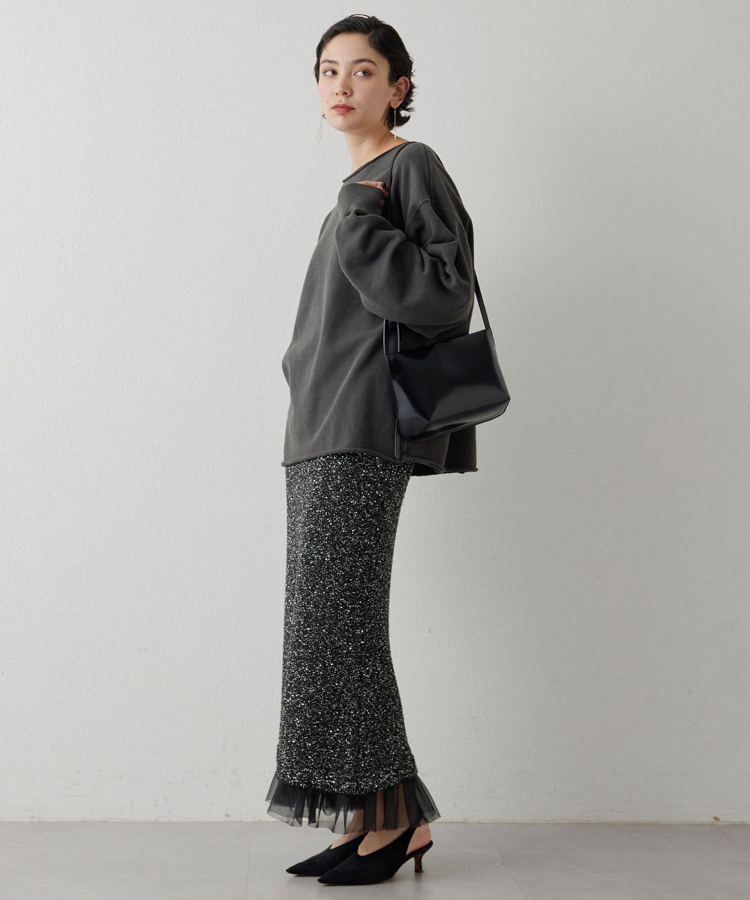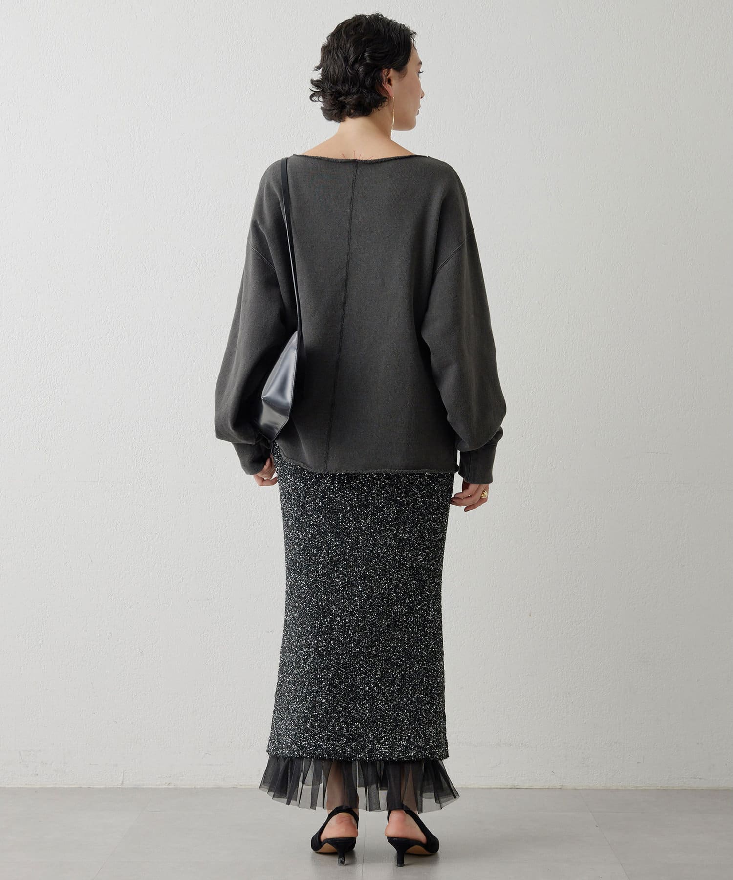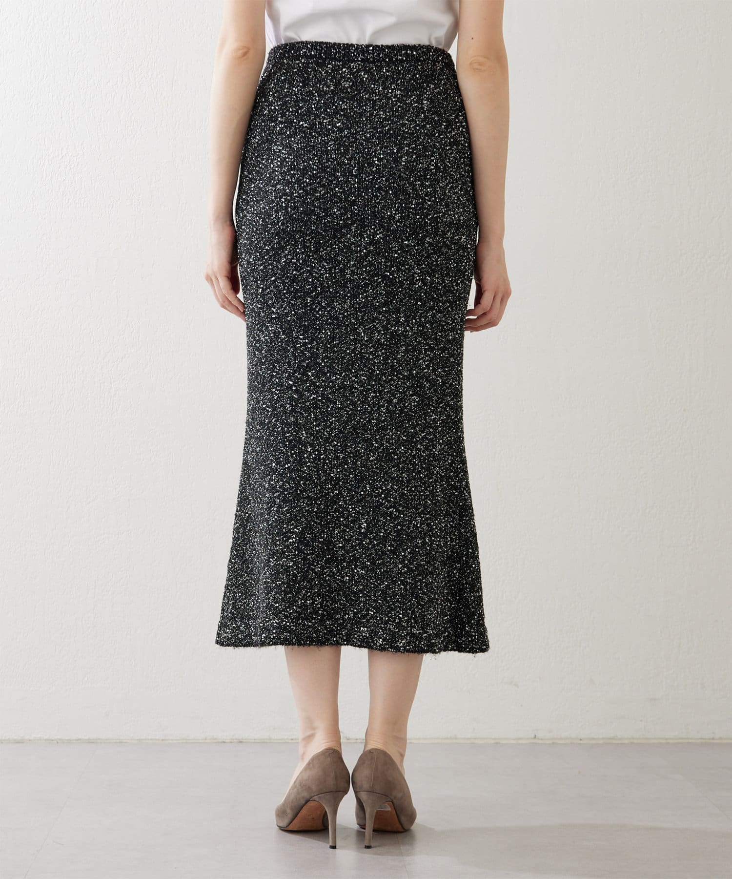 ニットスカート:スパンコール入りのペーパーモール・ウール混のループ糸・ストレッチ性の強いポリエステル糸それぞれ特徴の違う3素材を引きそろえて編んでいるニット。