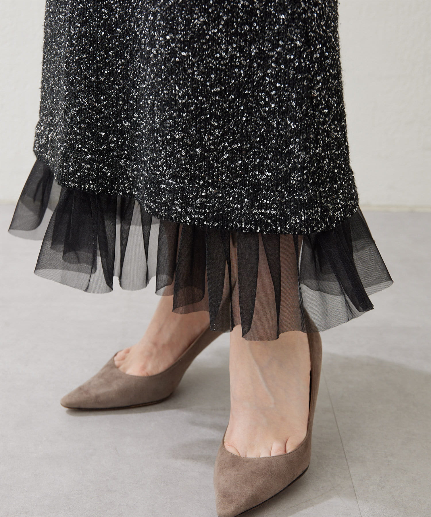■スパンコールニットとオーガンジー生地のスカートがセットになった一着。