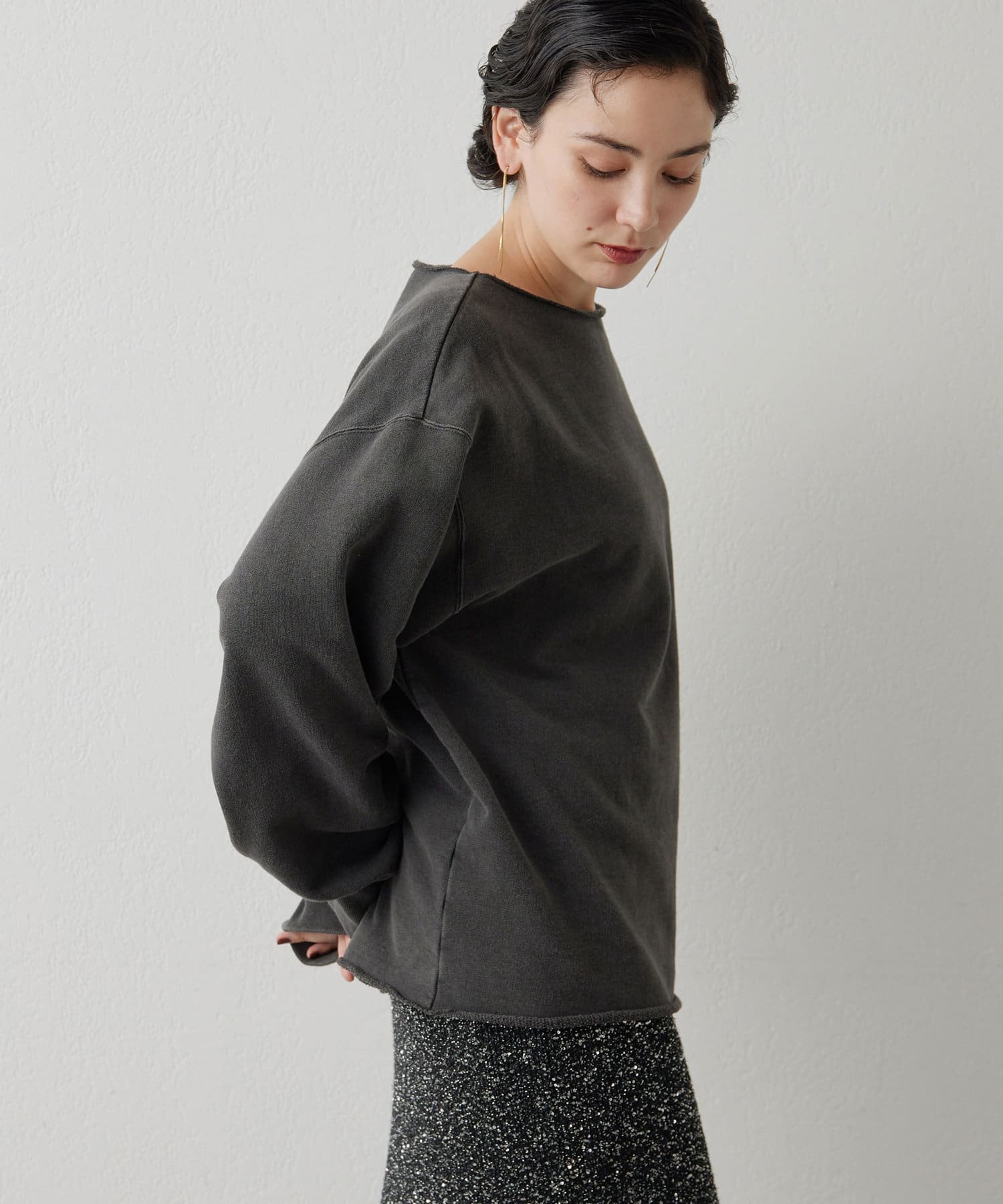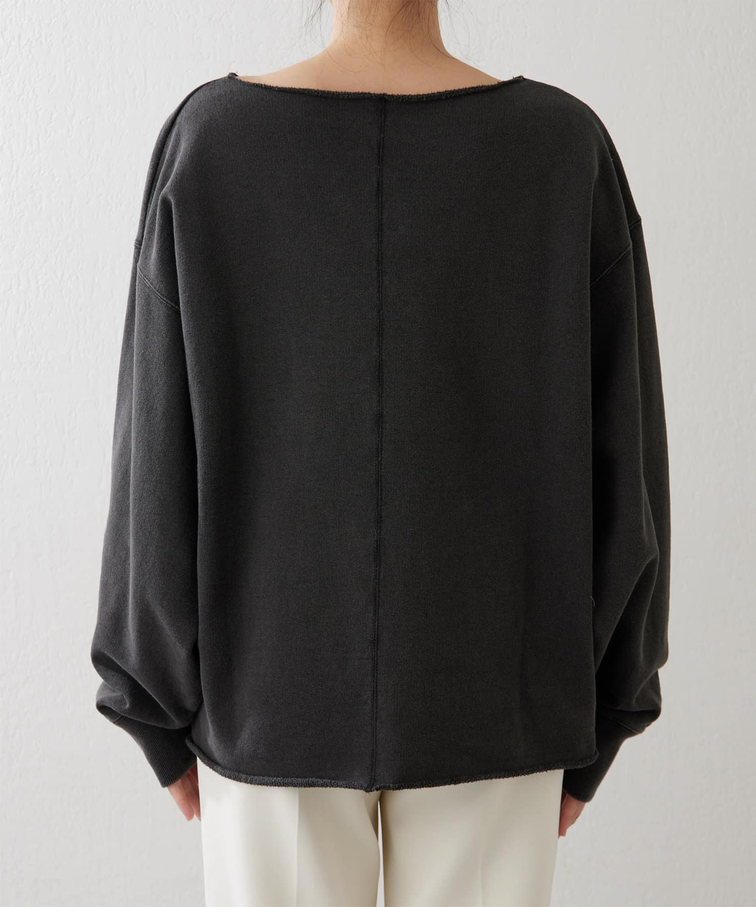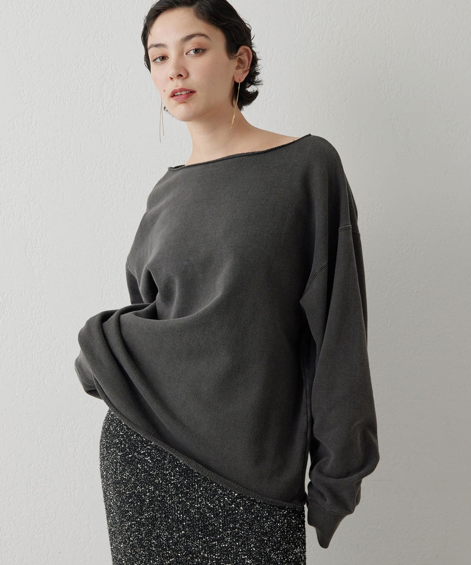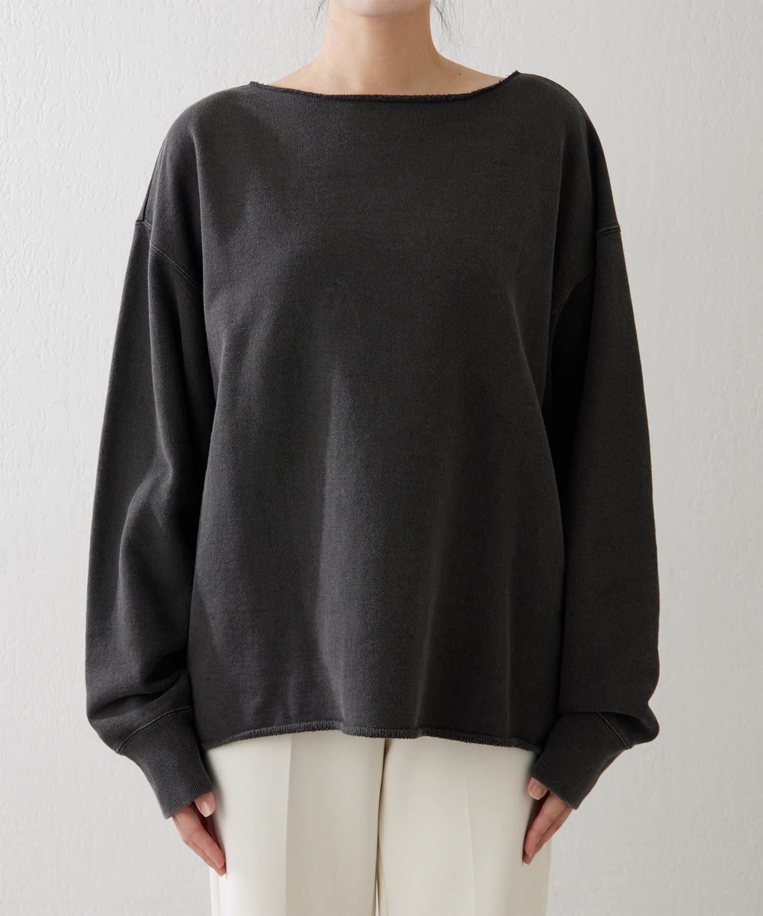 かなりカジュアルなディテールのスウェットですが、形がとってもきれいで大人にぜひおすすめしたい!!襟元がボートネックになっていて、ちょうど鎖骨に沿うような開き具合。これがすごくフェミニンに見せてくれるラインです!切りっぱなしですがそのカジュアルさをうまく中和してくれています。全体的にもかなりゆったりしたサイズ感。でも生地が柔らかく、ゴワゴワ感がないので、アウターの中にもすっきりと着られます。