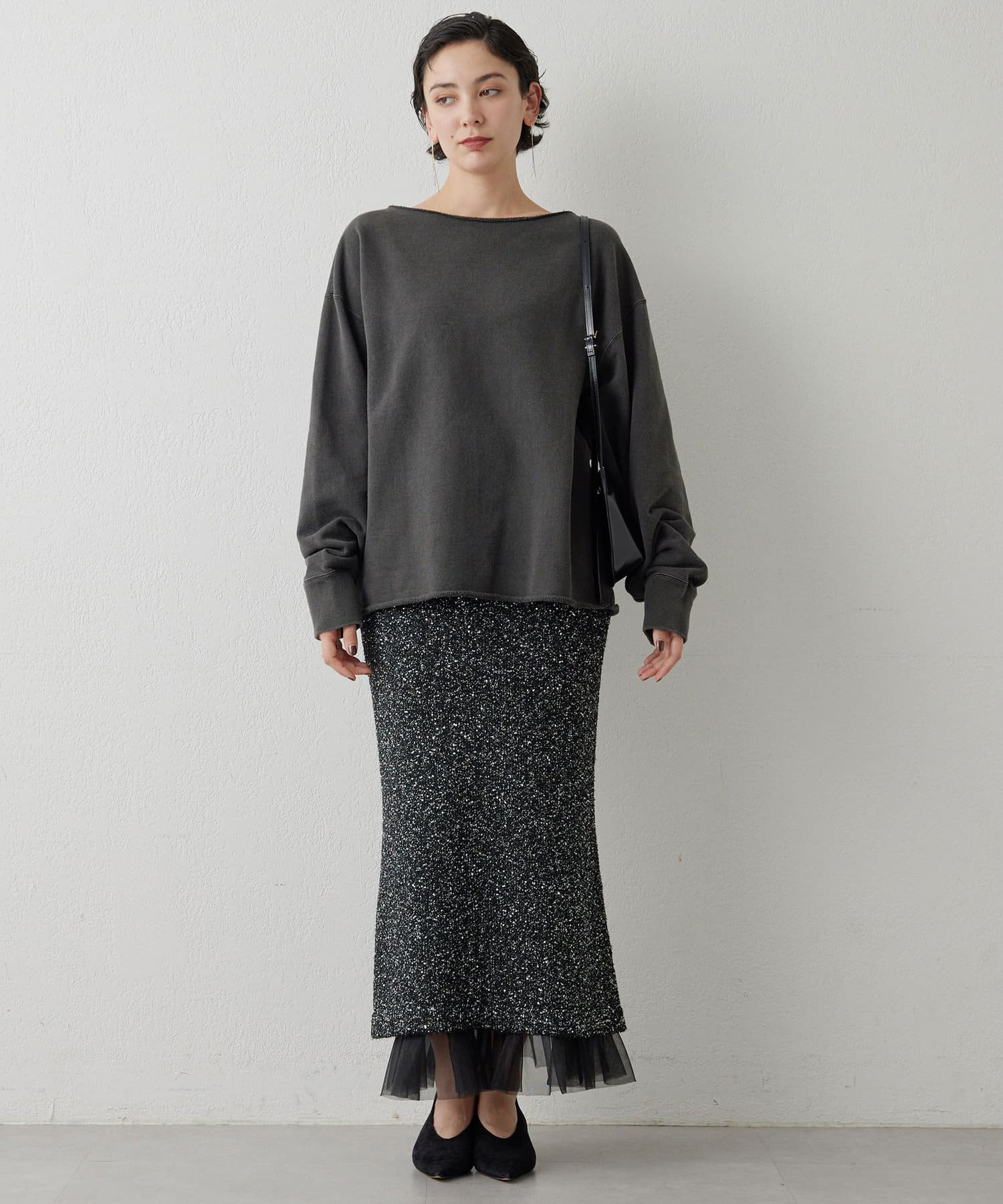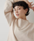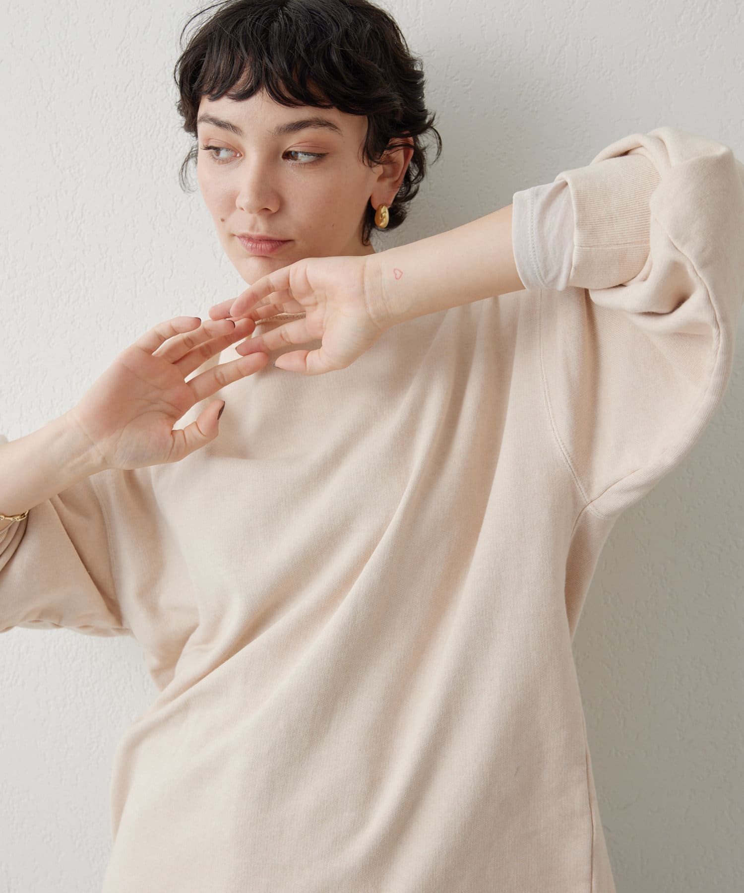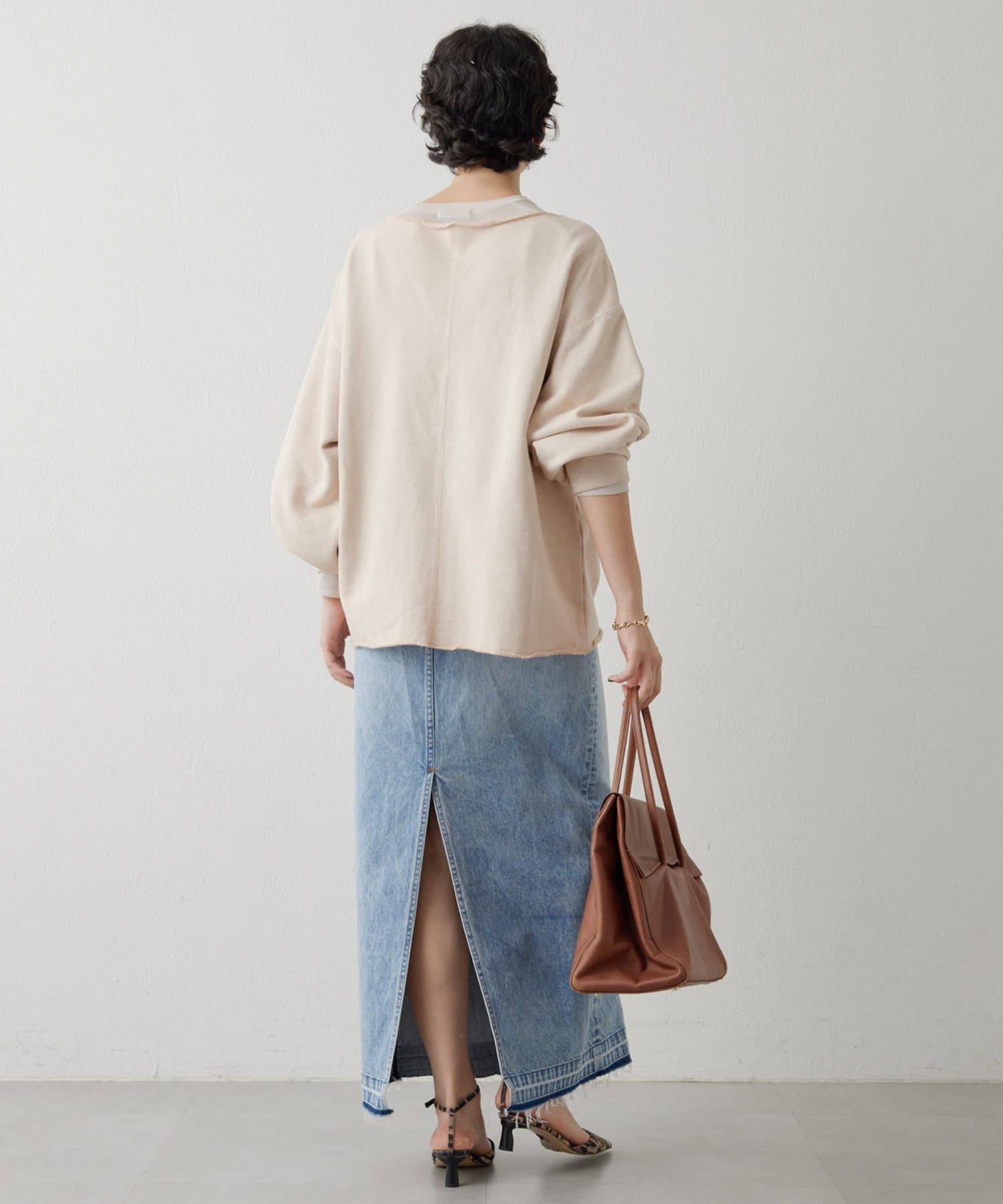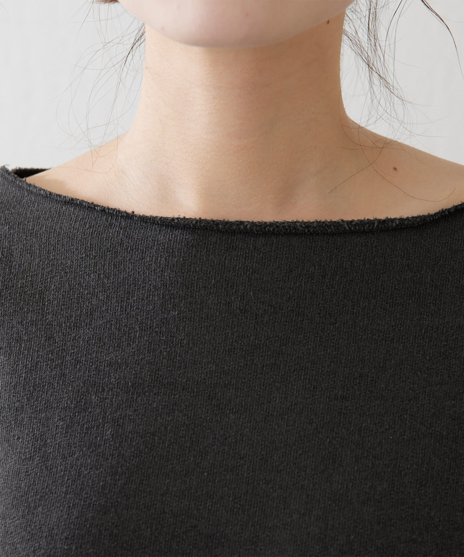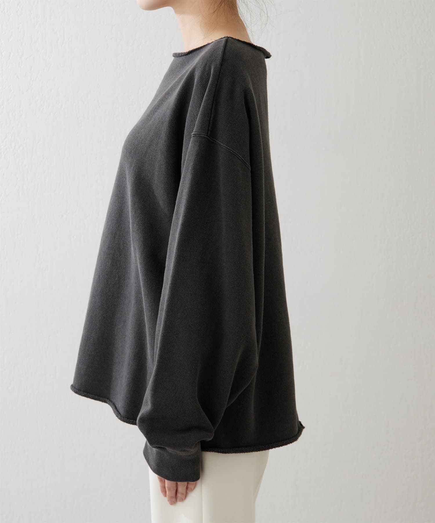 かなりカジュアルなディテールのスウェットですが、形がとってもきれいで大人にぜひおすすめしたい!!襟元がボートネックになっていて、ちょうど鎖骨に沿うような開き具合。これがすごくフェミニンに見せてくれるラインです!切りっぱなしですがそのカジュアルさをうまく中和してくれています。全体的にもかなりゆったりしたサイズ感。でも生地が柔らかく、ゴワゴワ感がないので、アウターの中にもすっきりと着られます。