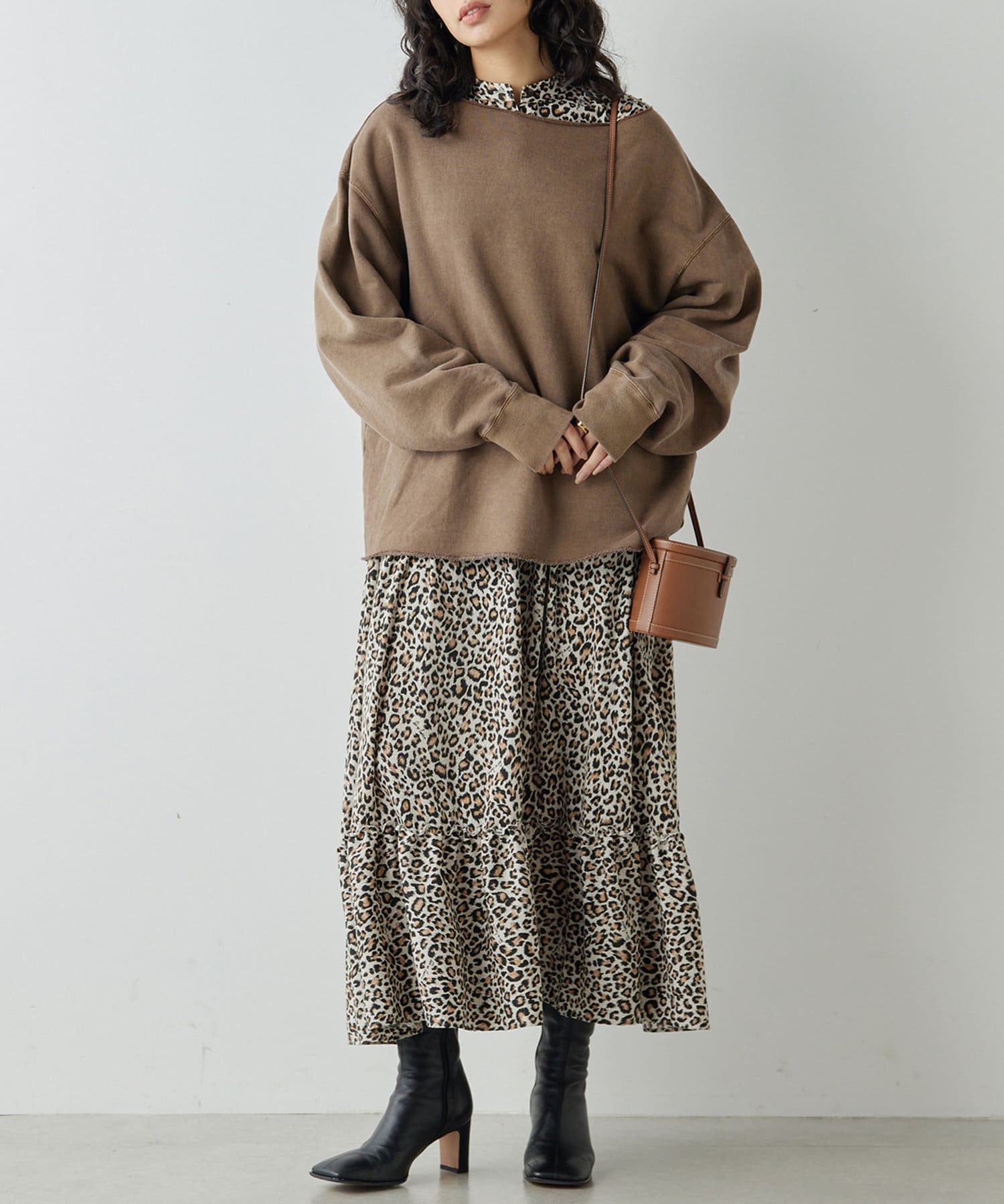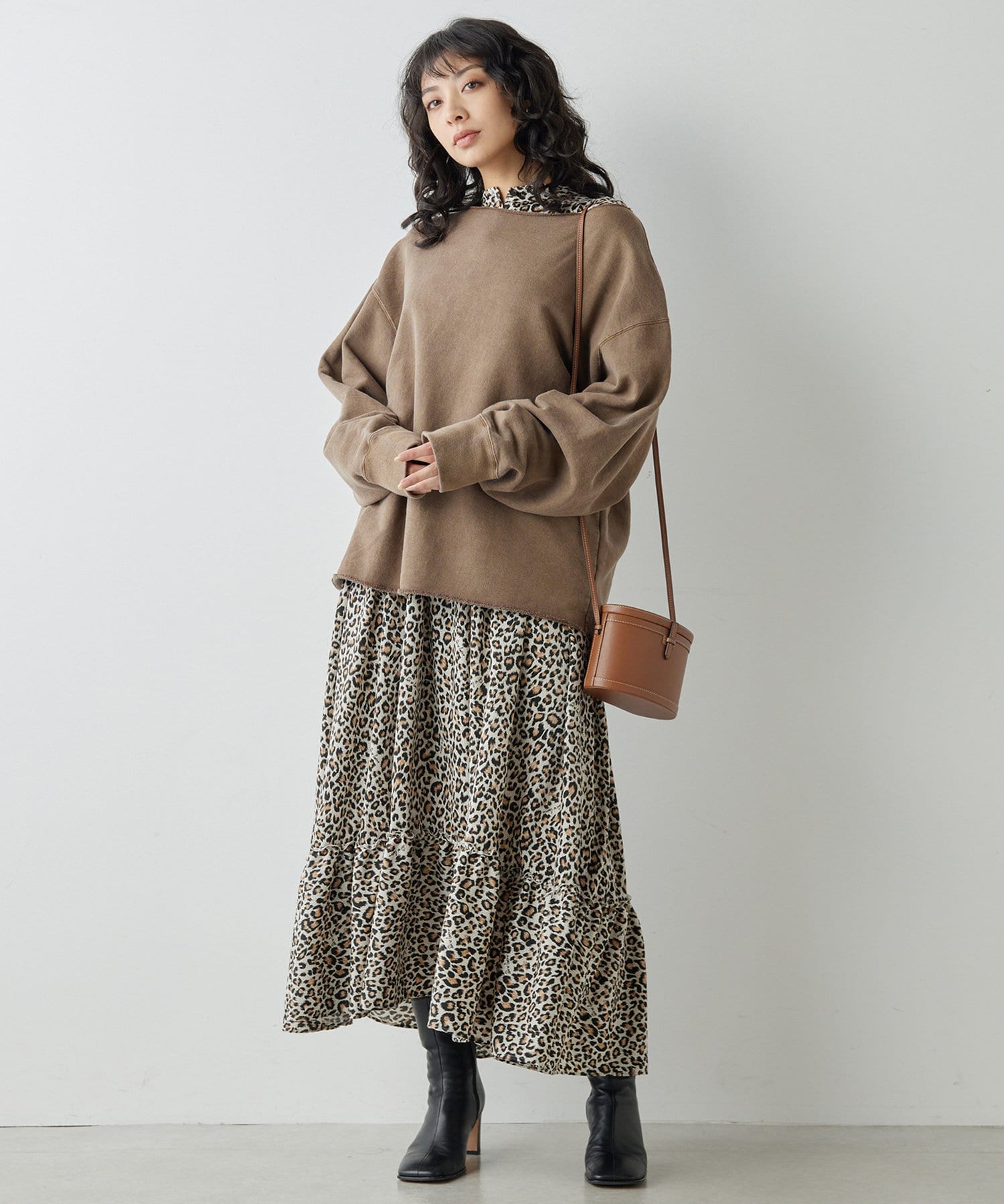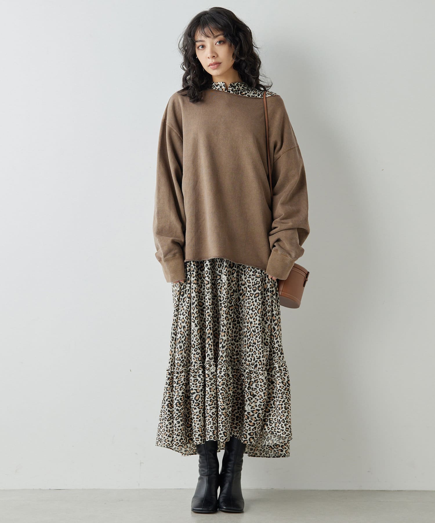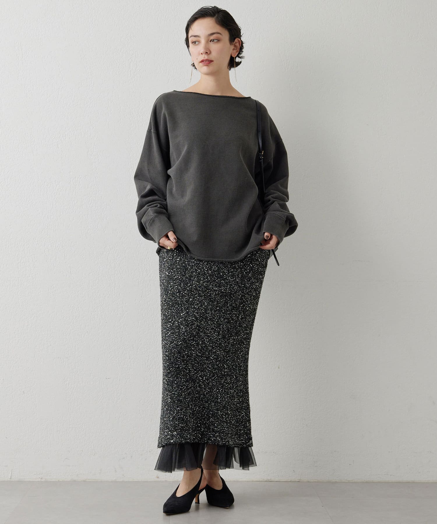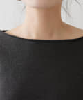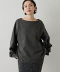 かなりカジュアルなディテールのスウェットですが、形がとってもきれいで大人にぜひおすすめしたい!!襟元がボートネックになっていて、ちょうど鎖骨に沿うような開き具合。これがすごくフェミニンに見せてくれるラインです!切りっぱなしですがそのカジュアルさをうまく中和してくれています。全体的にもかなりゆったりしたサイズ感。でも生地が柔らかく、ゴワゴワ感がないので、アウターの中にもすっきりと着られます。