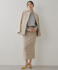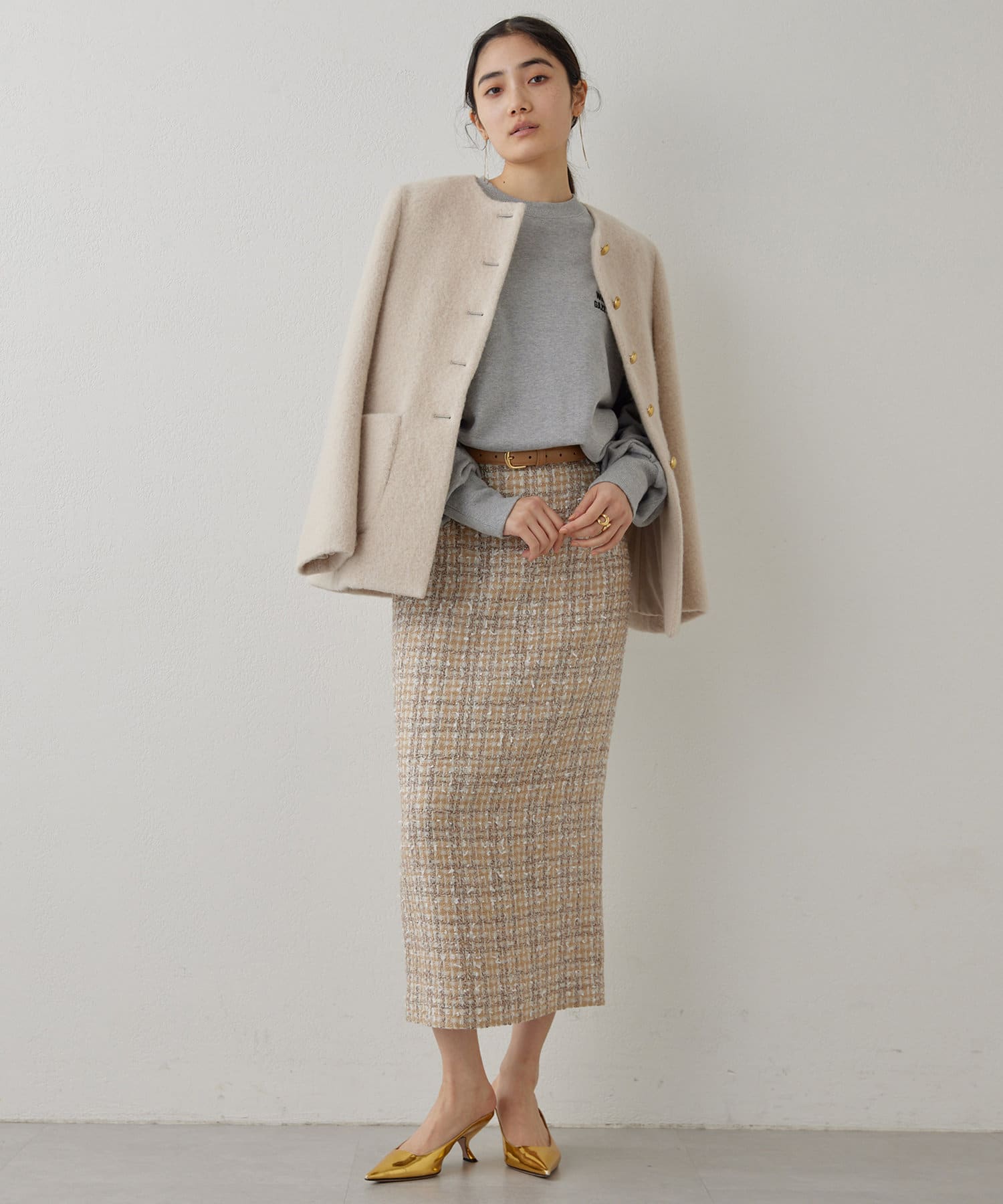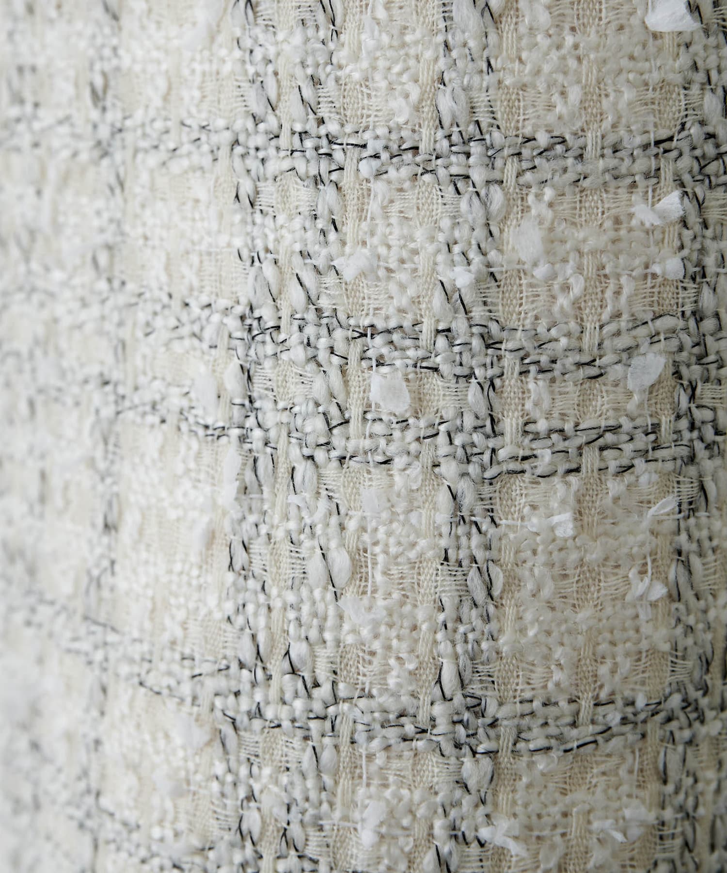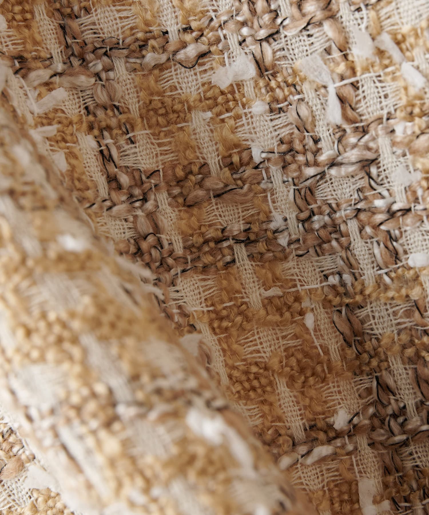 アクリルのトライスピン糸を使用したとてもふくらみ感のあるソフトな風合いに、フラックモール糸と杢糸を使用して表面感を出したツイード素材。
