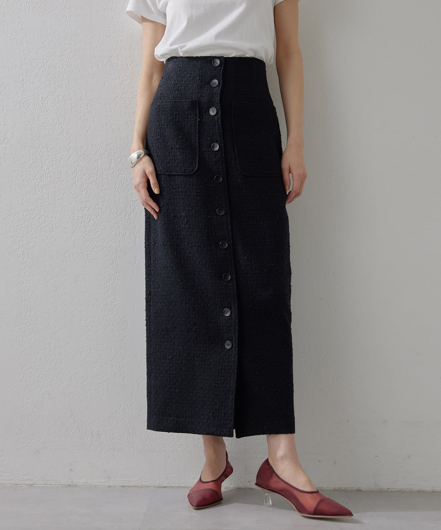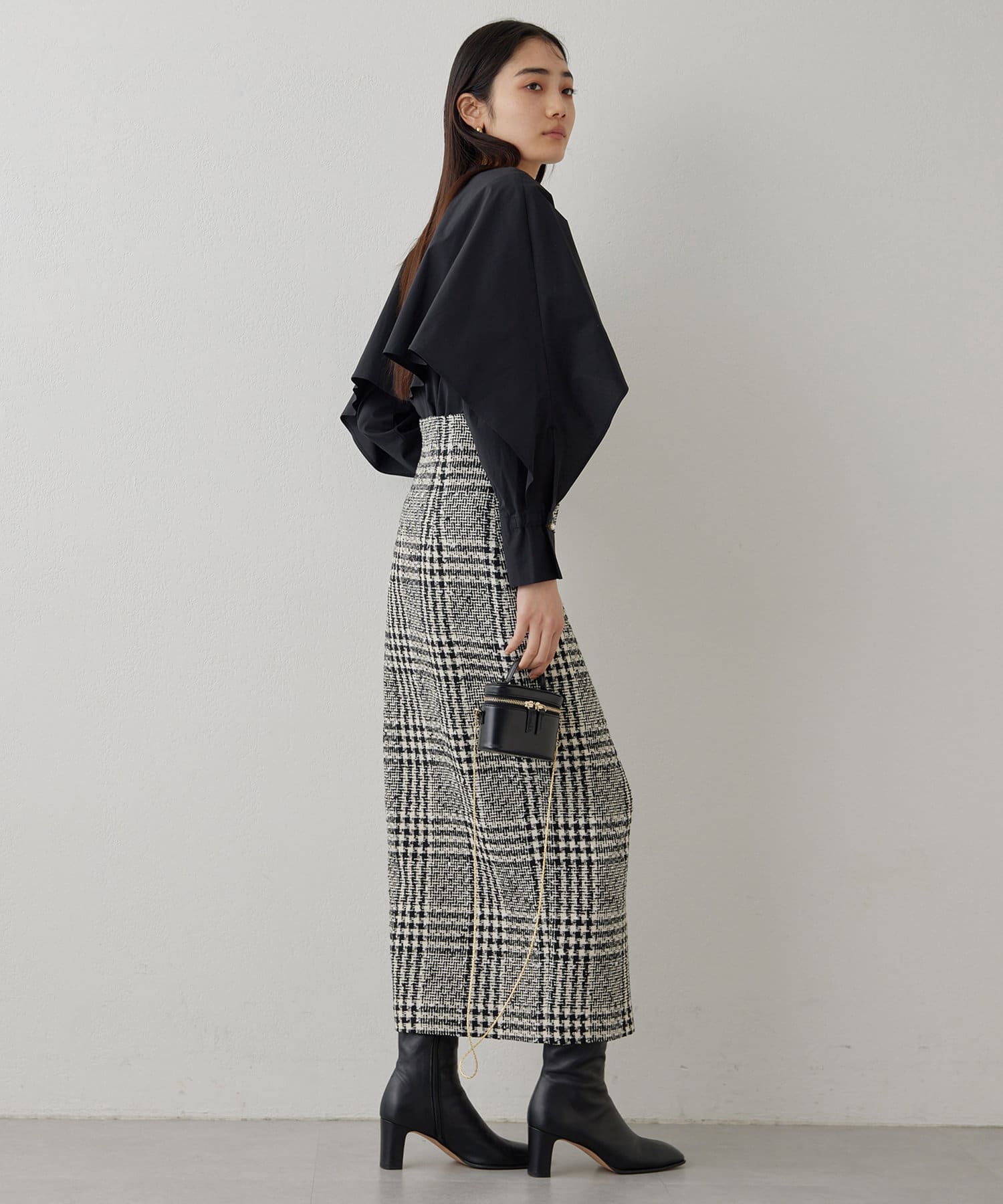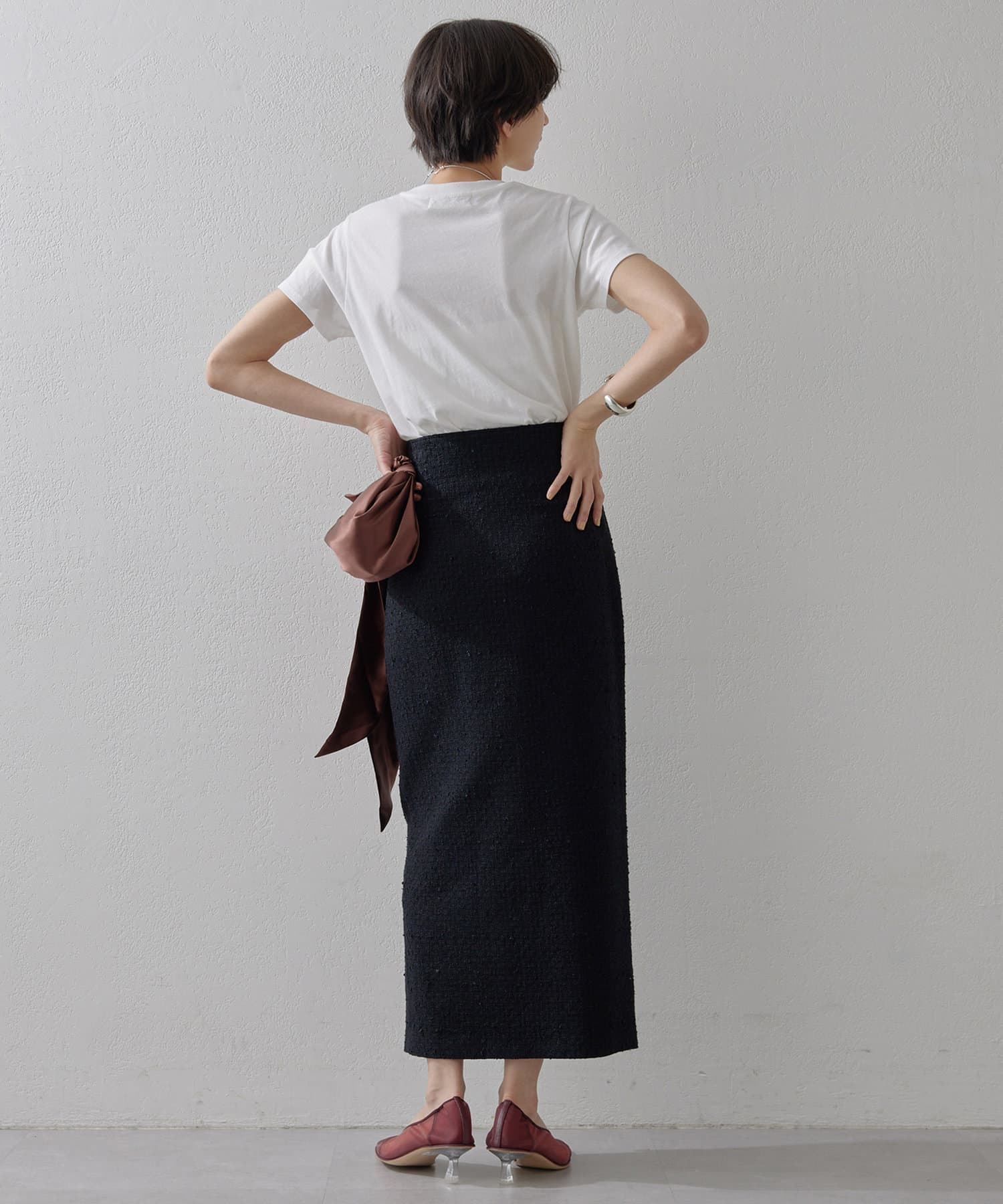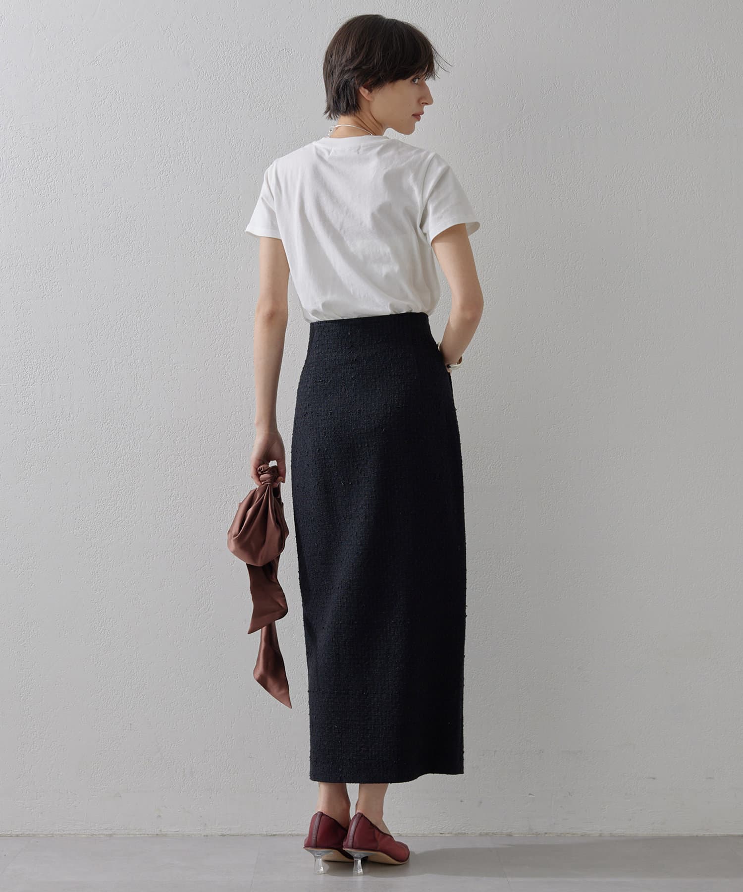 ■身体のラインを拾いすぎず女性らしさを演出するIラインシルエットもポイント。