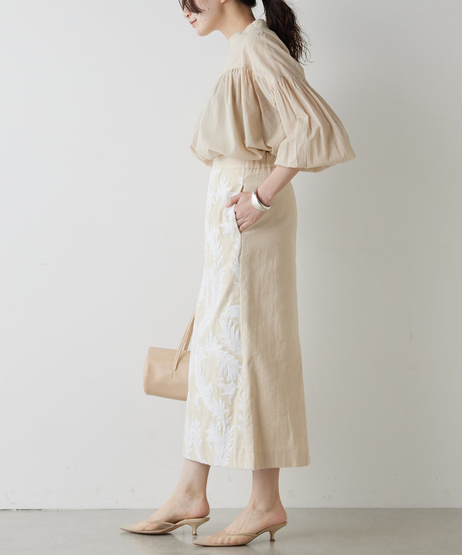 ■襟元はバンドカラーで引き締めて甘くなりすぎないバランス感を意識。