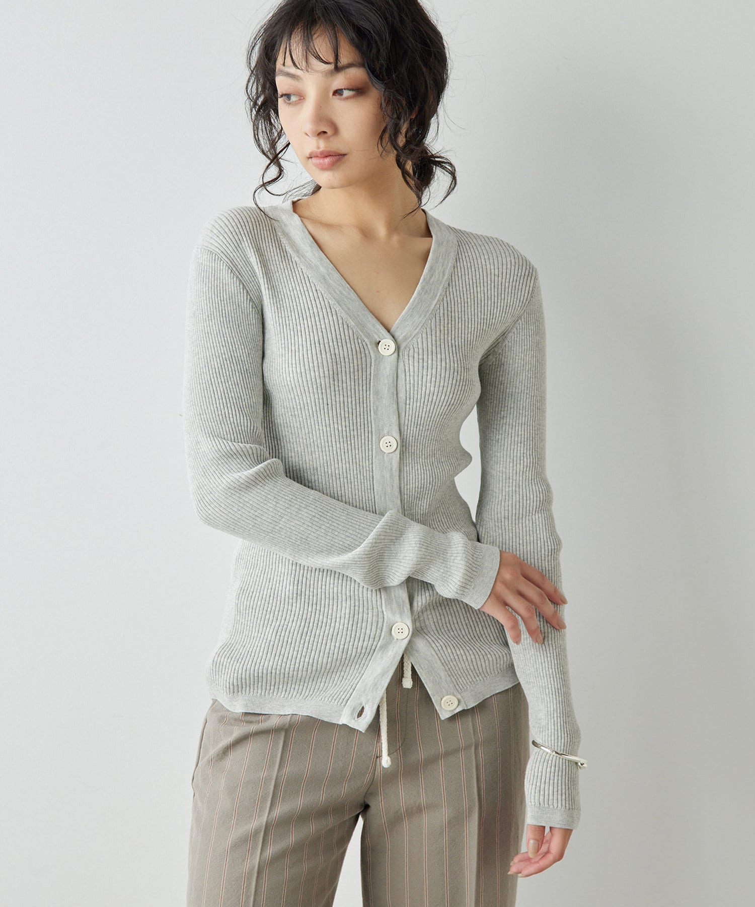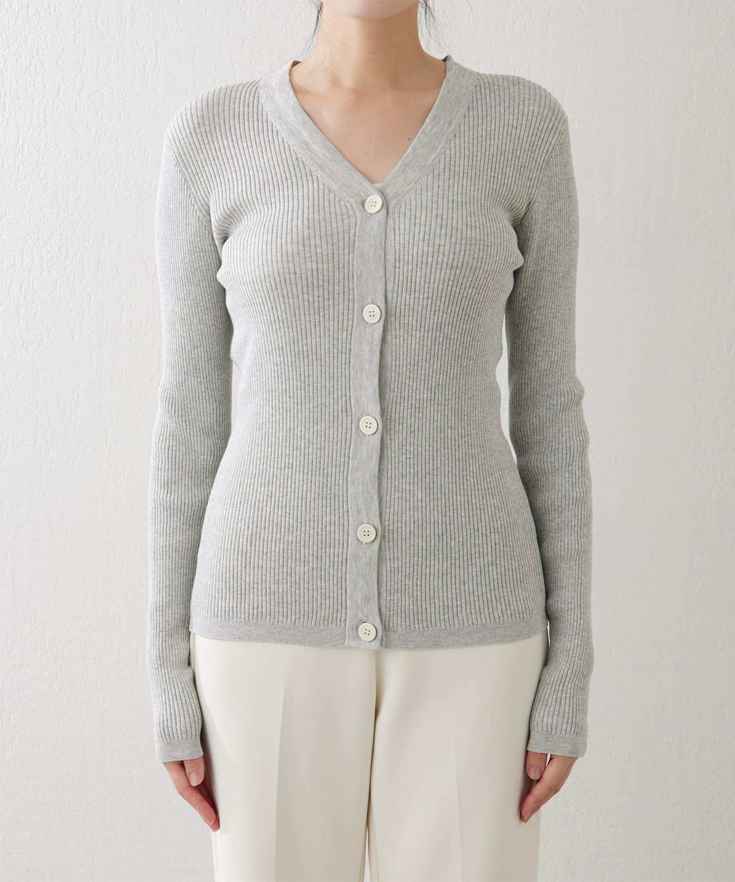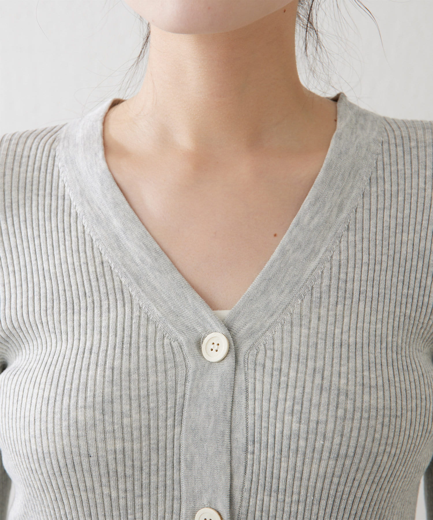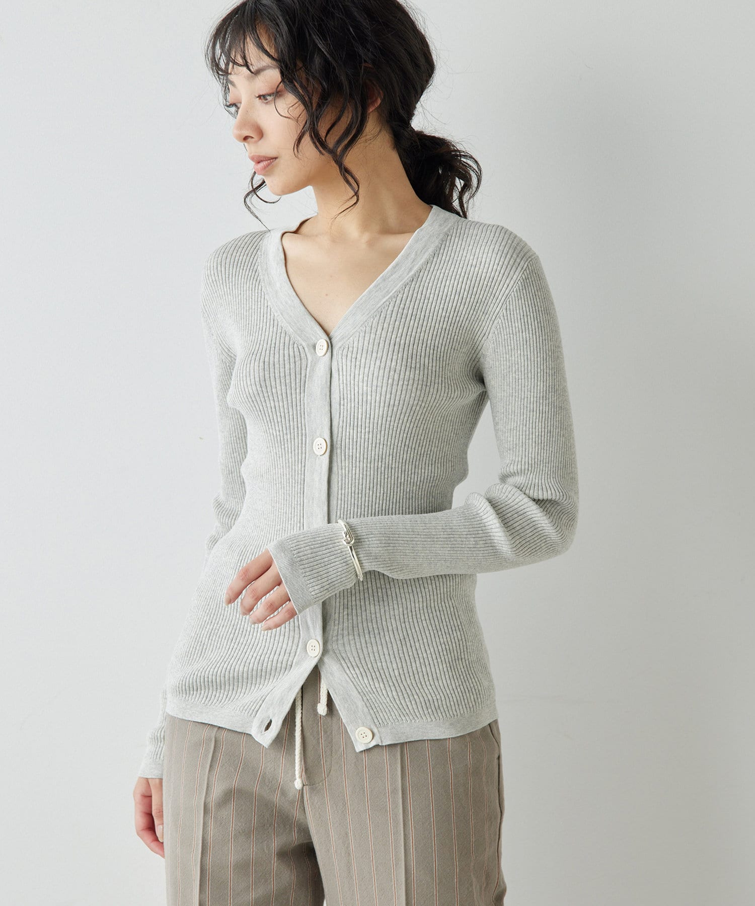 ■女性らしいシルエットのVネックリブニットカーディガン。