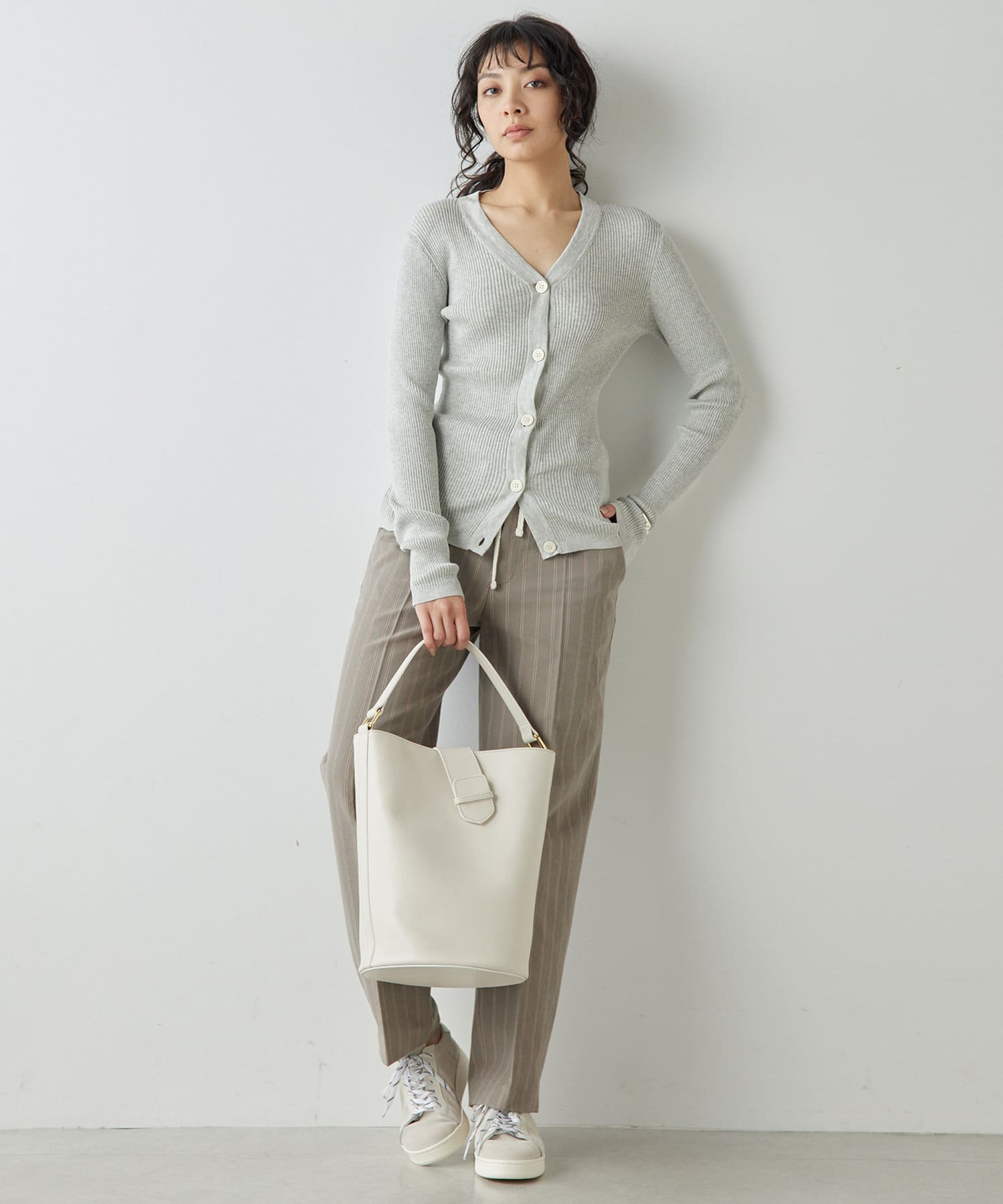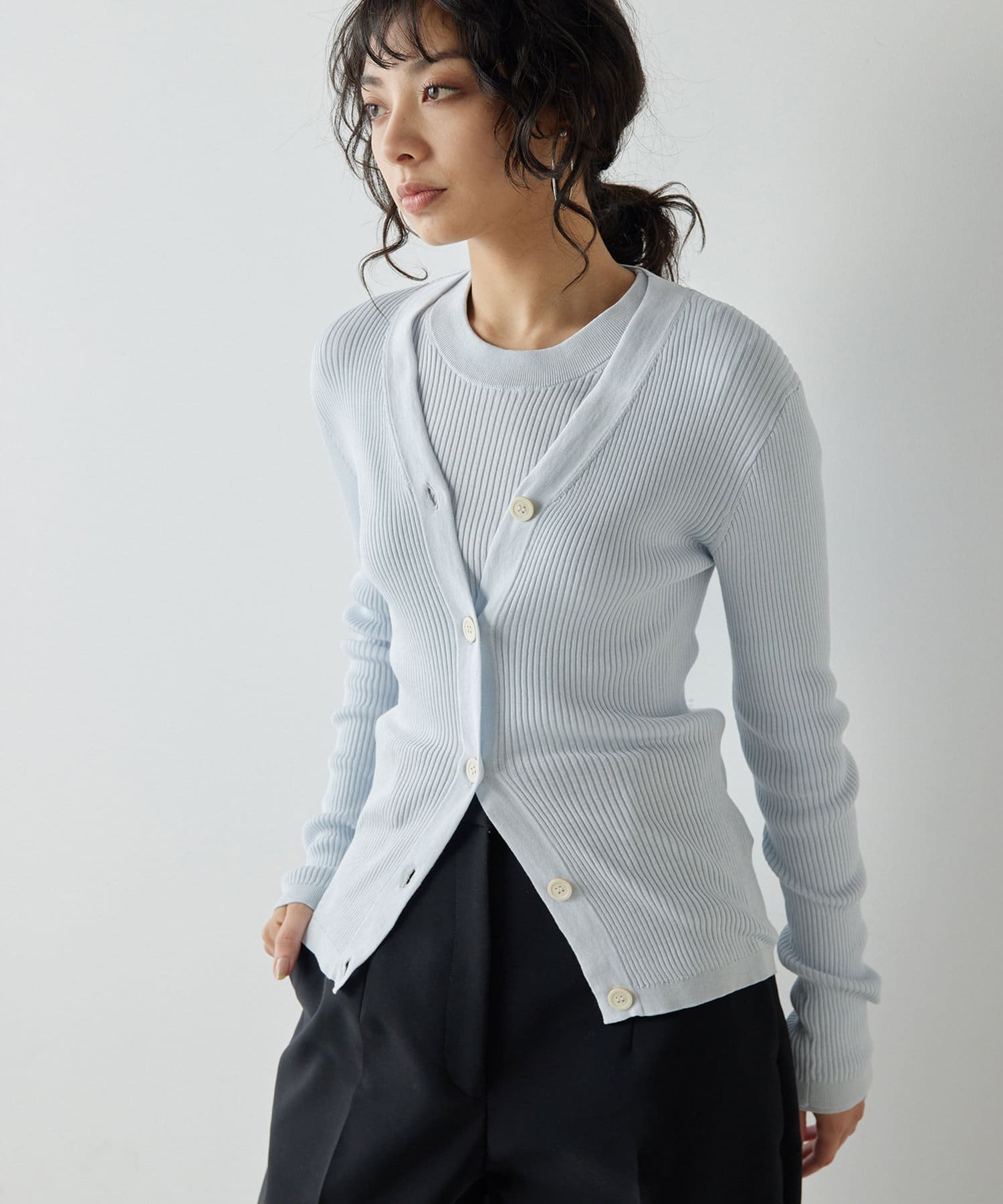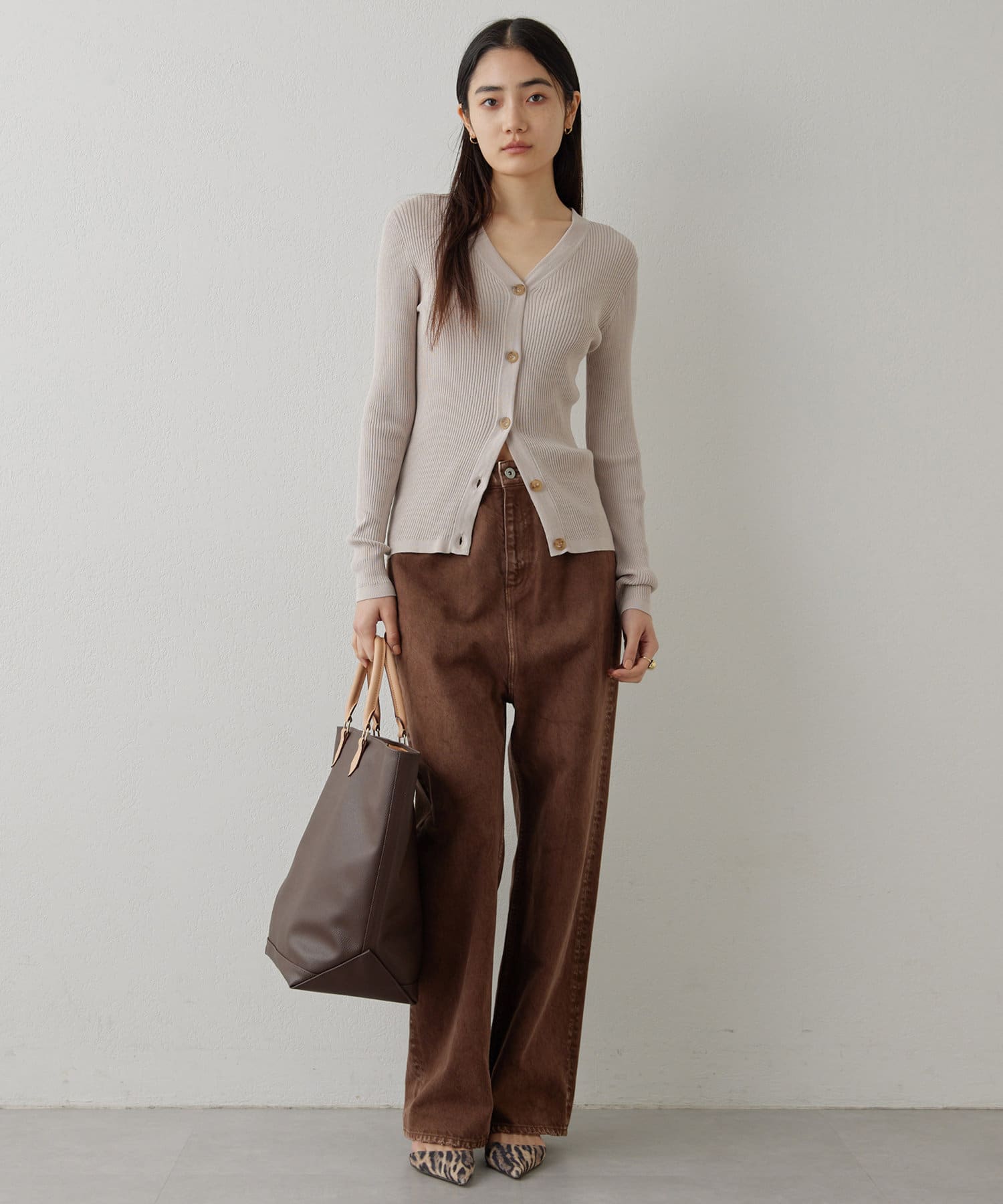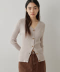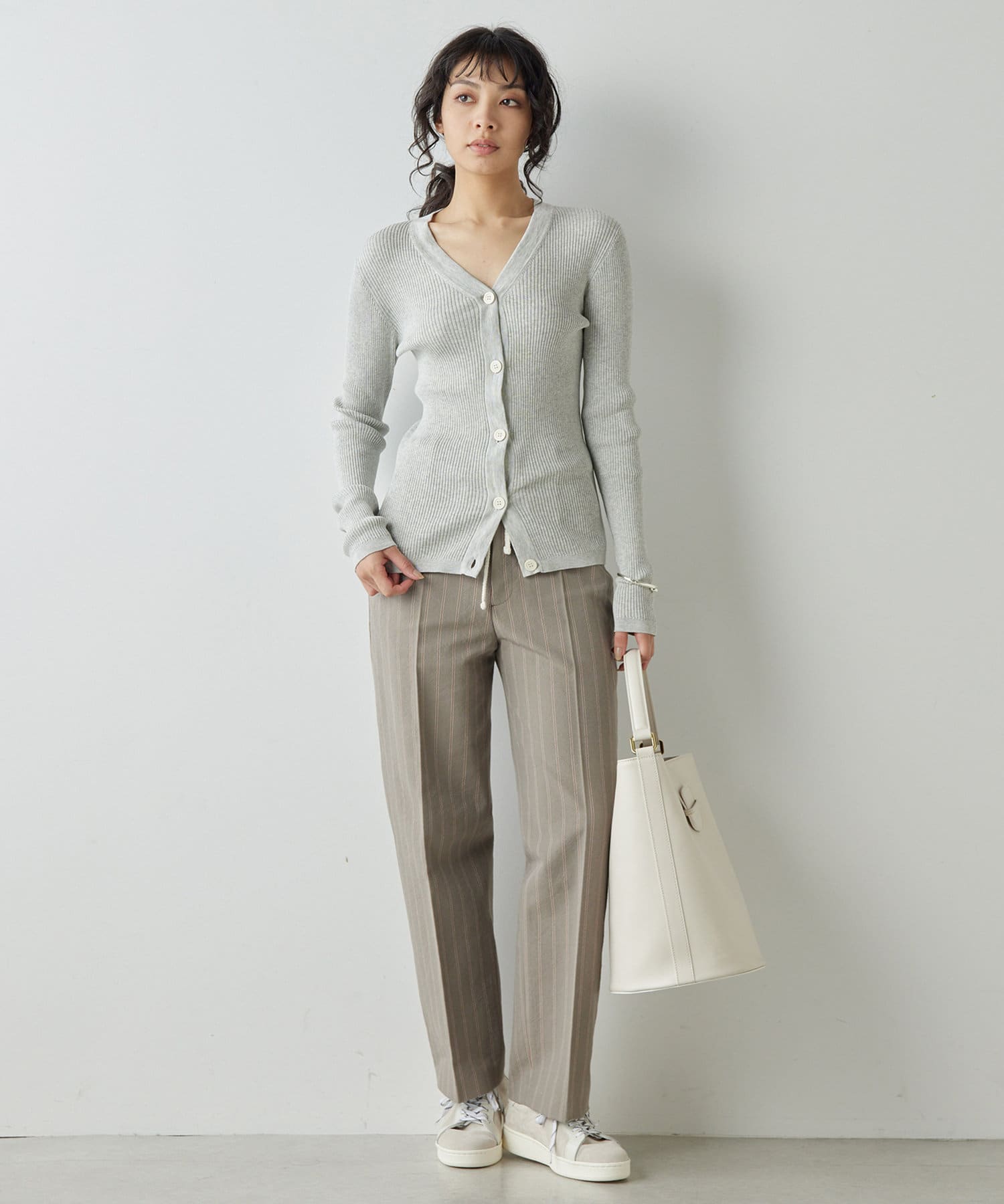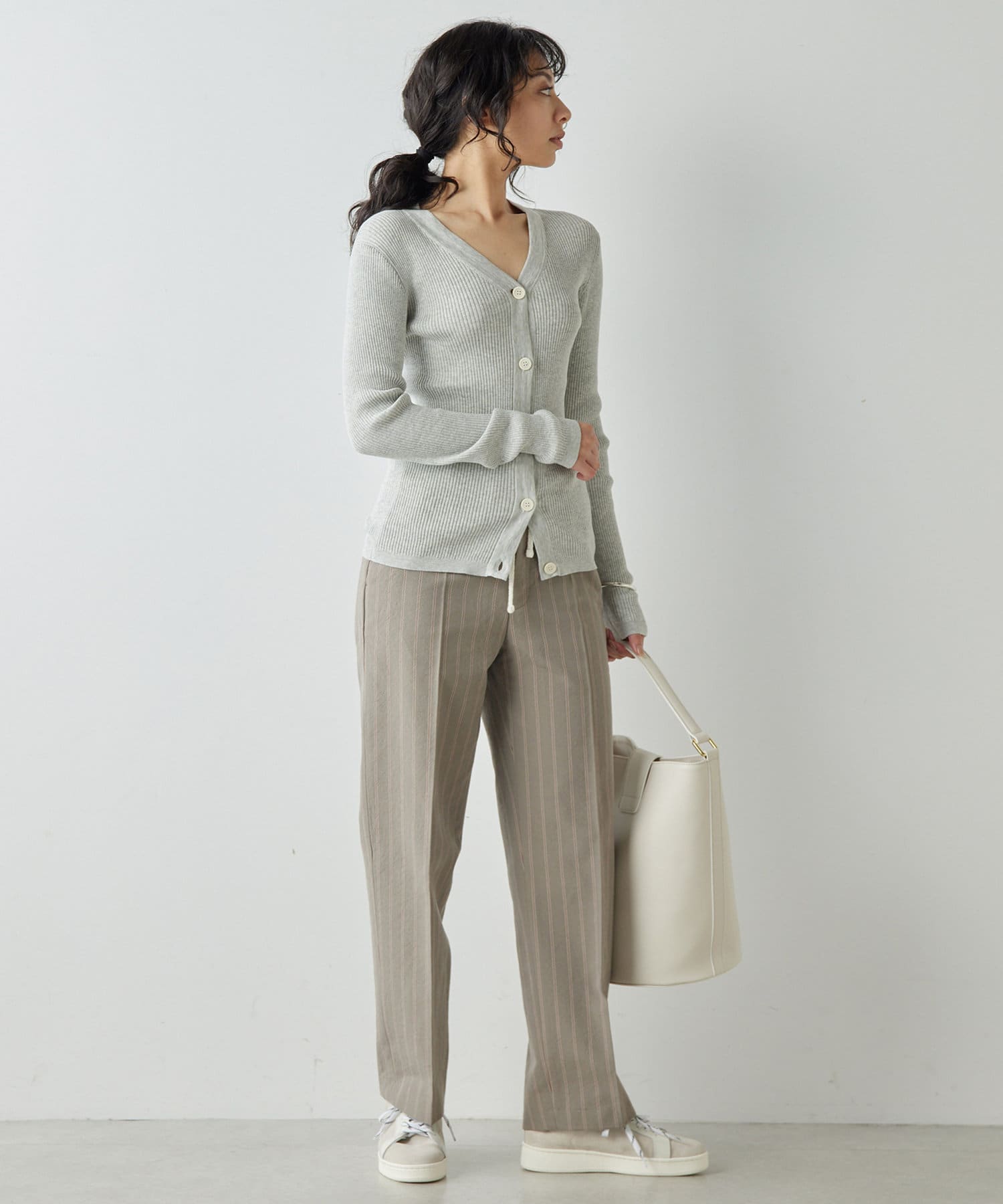 ■女性らしいシルエットのVネックリブニットカーディガン。