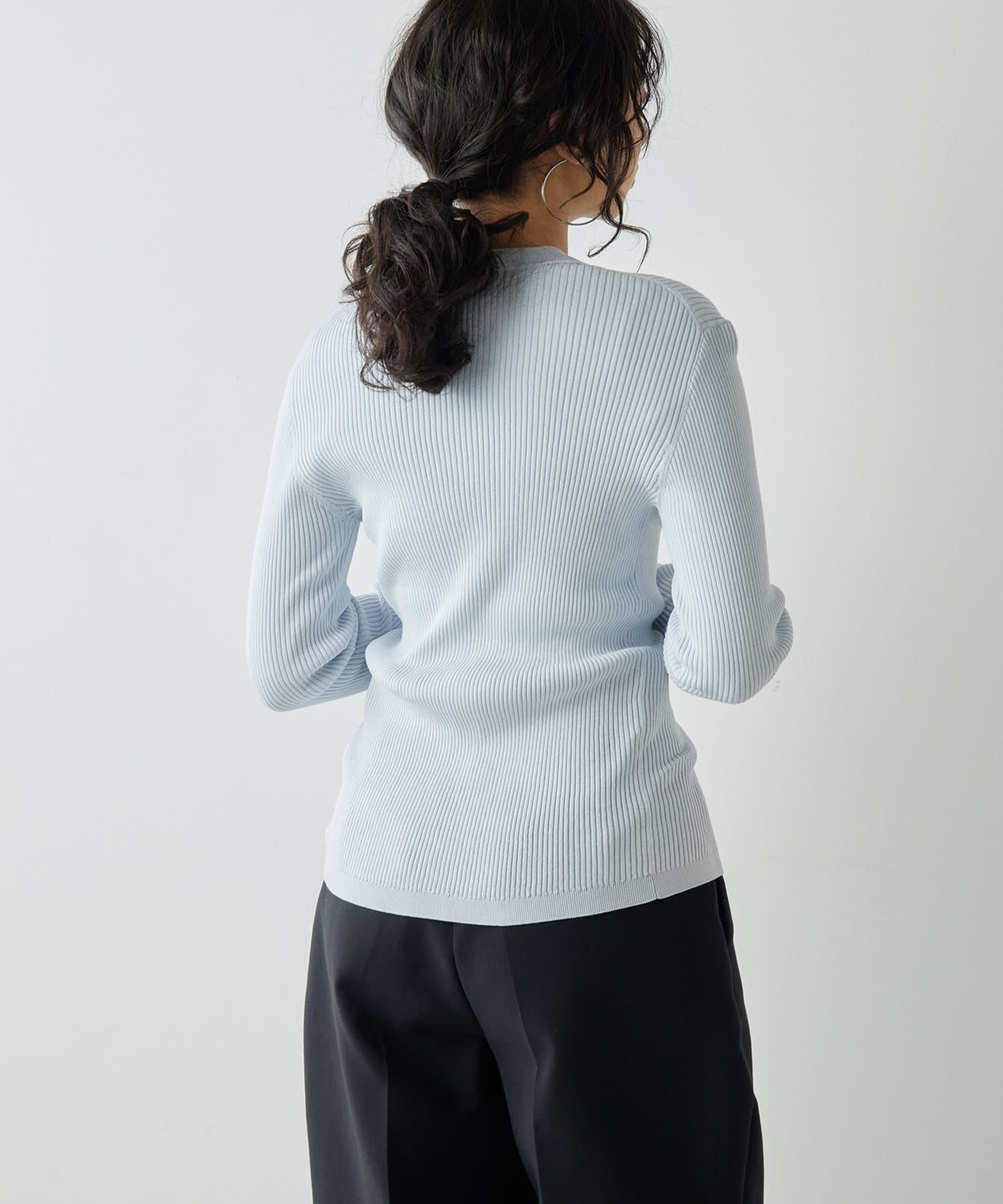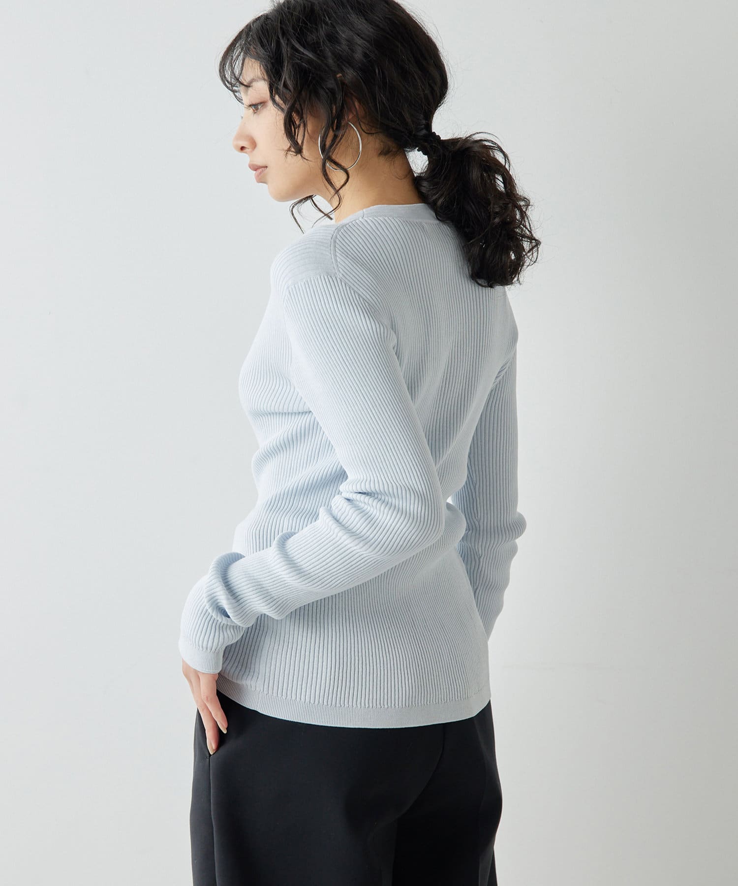 細番のシルクと繊維長の長いコットンを混紡した、シルクの光沢感と滑らかな手触りが魅力のリブニット。