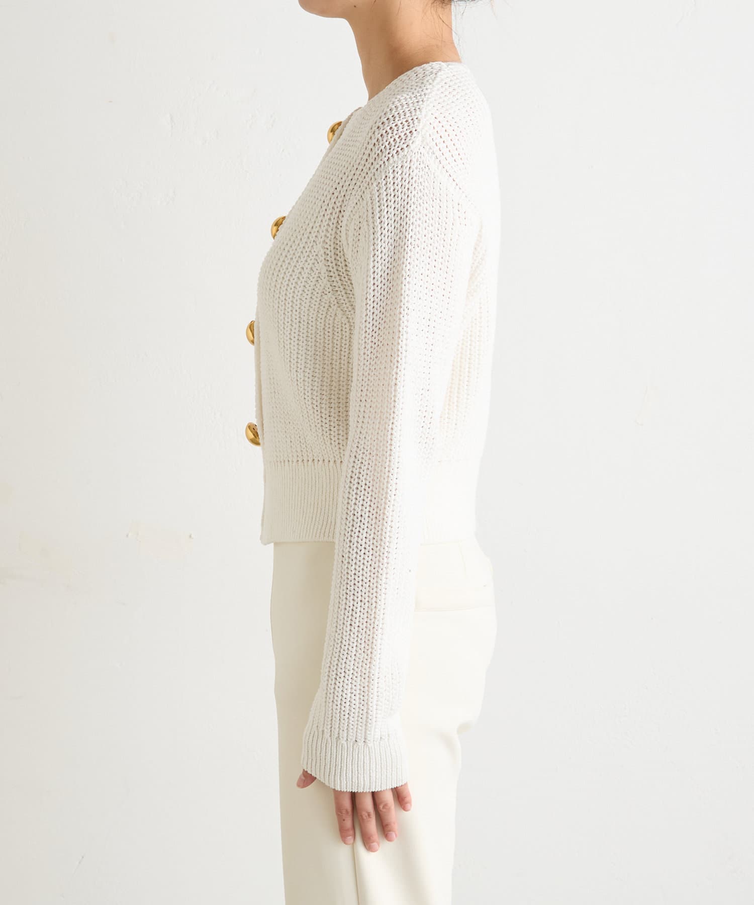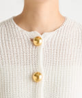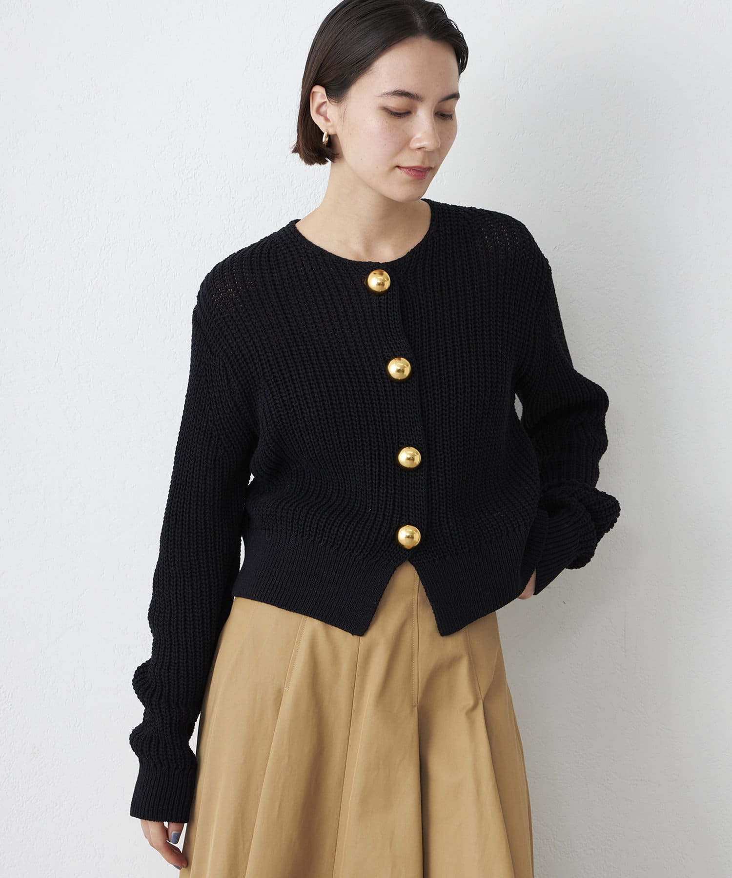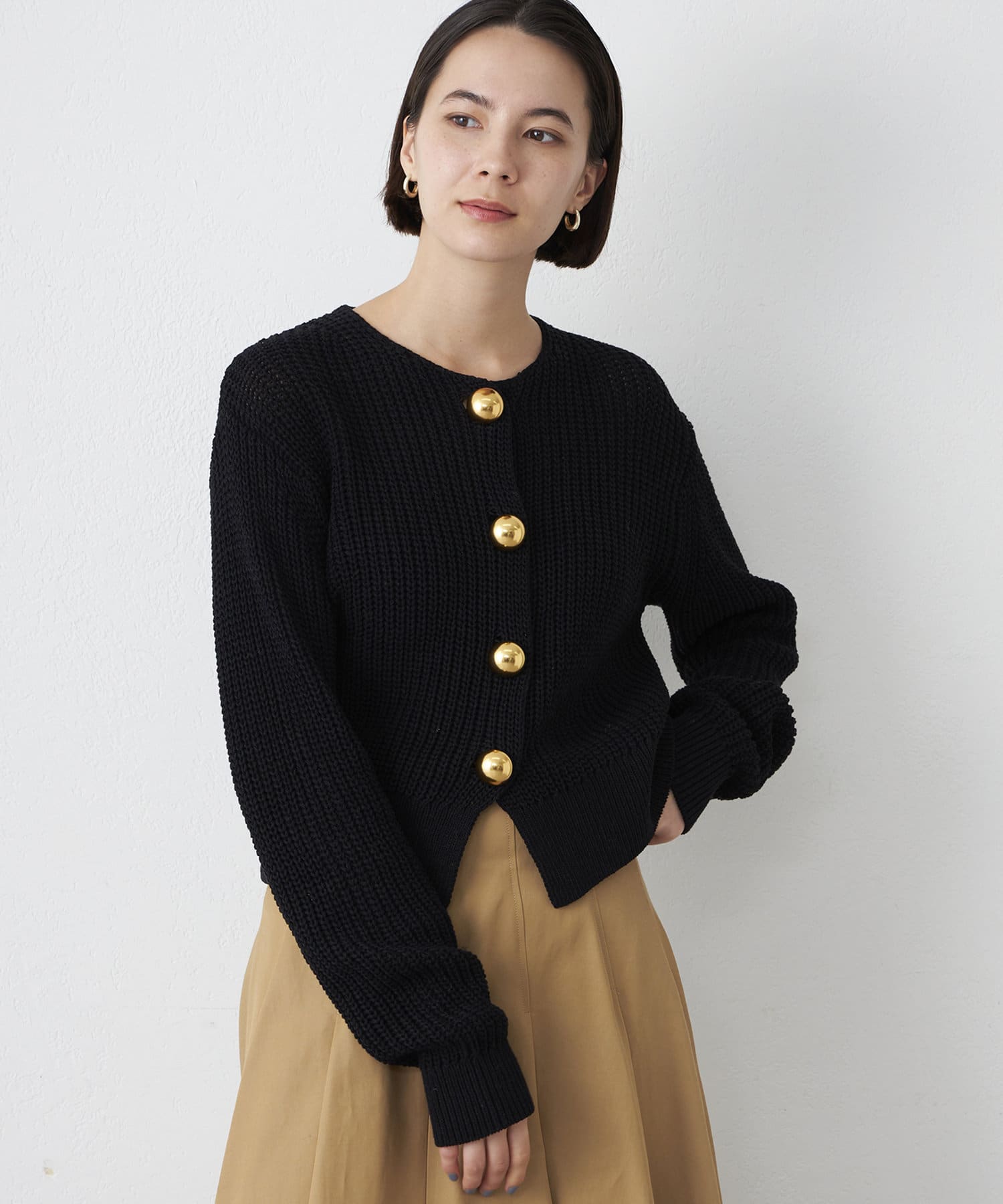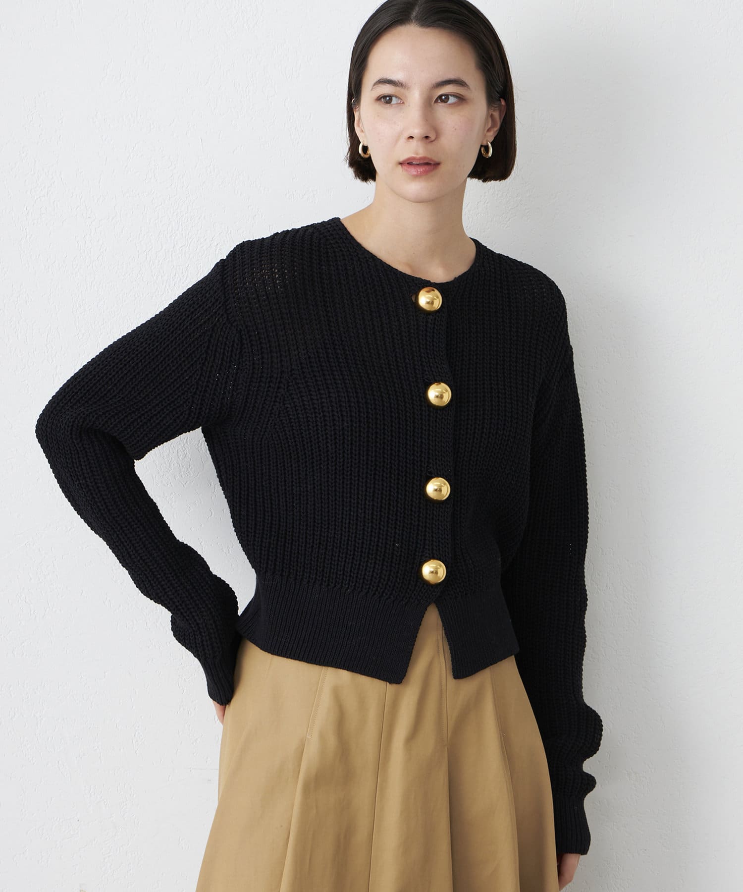 ■大きめの金ボタンがアクセサリー感覚で映えるニットカーディガン。
