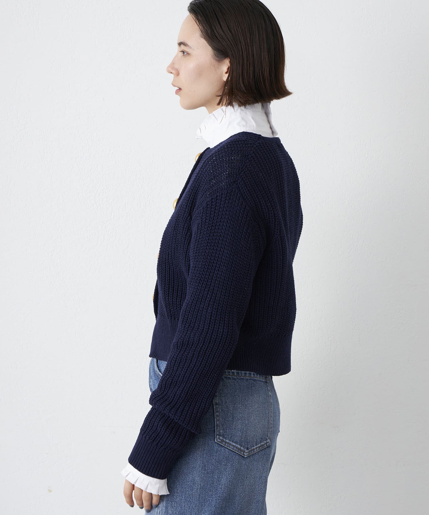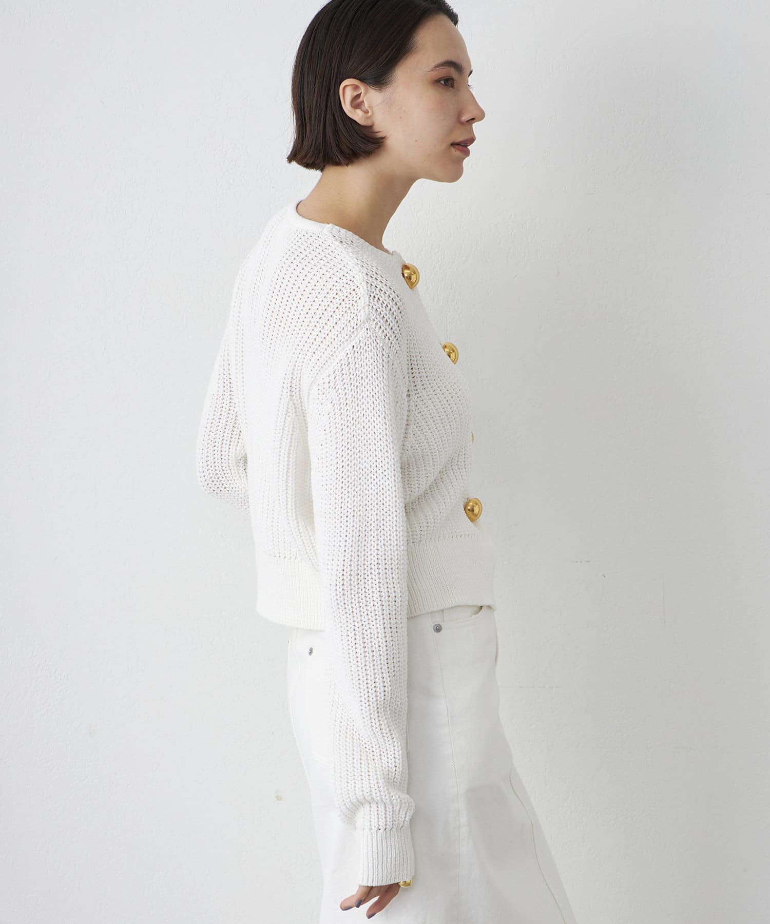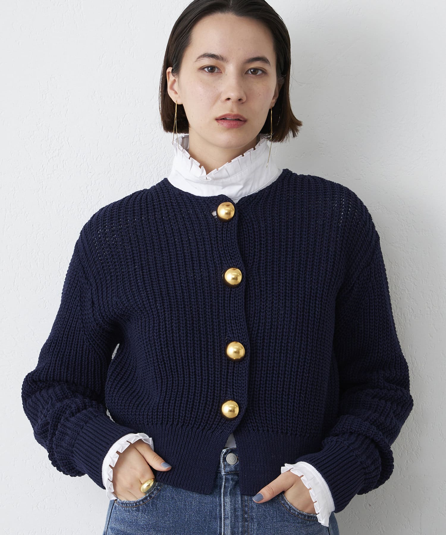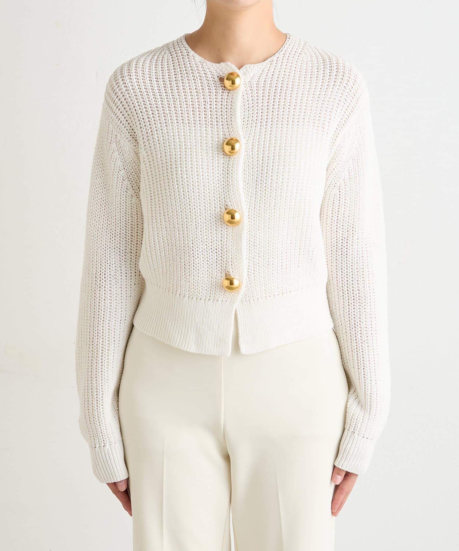 ■大きめの金ボタンがアクセサリー感覚で映えるニットカーディガン。