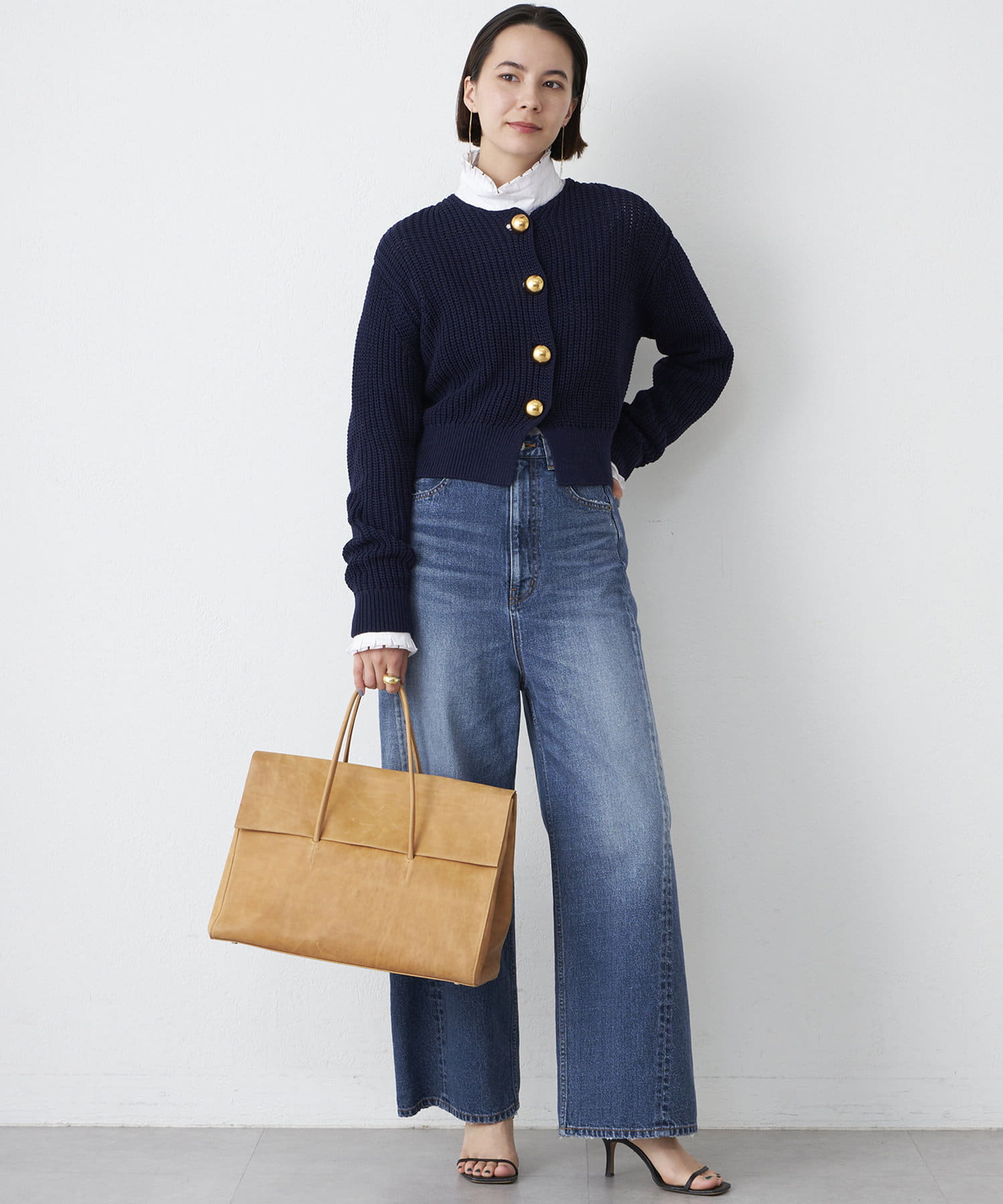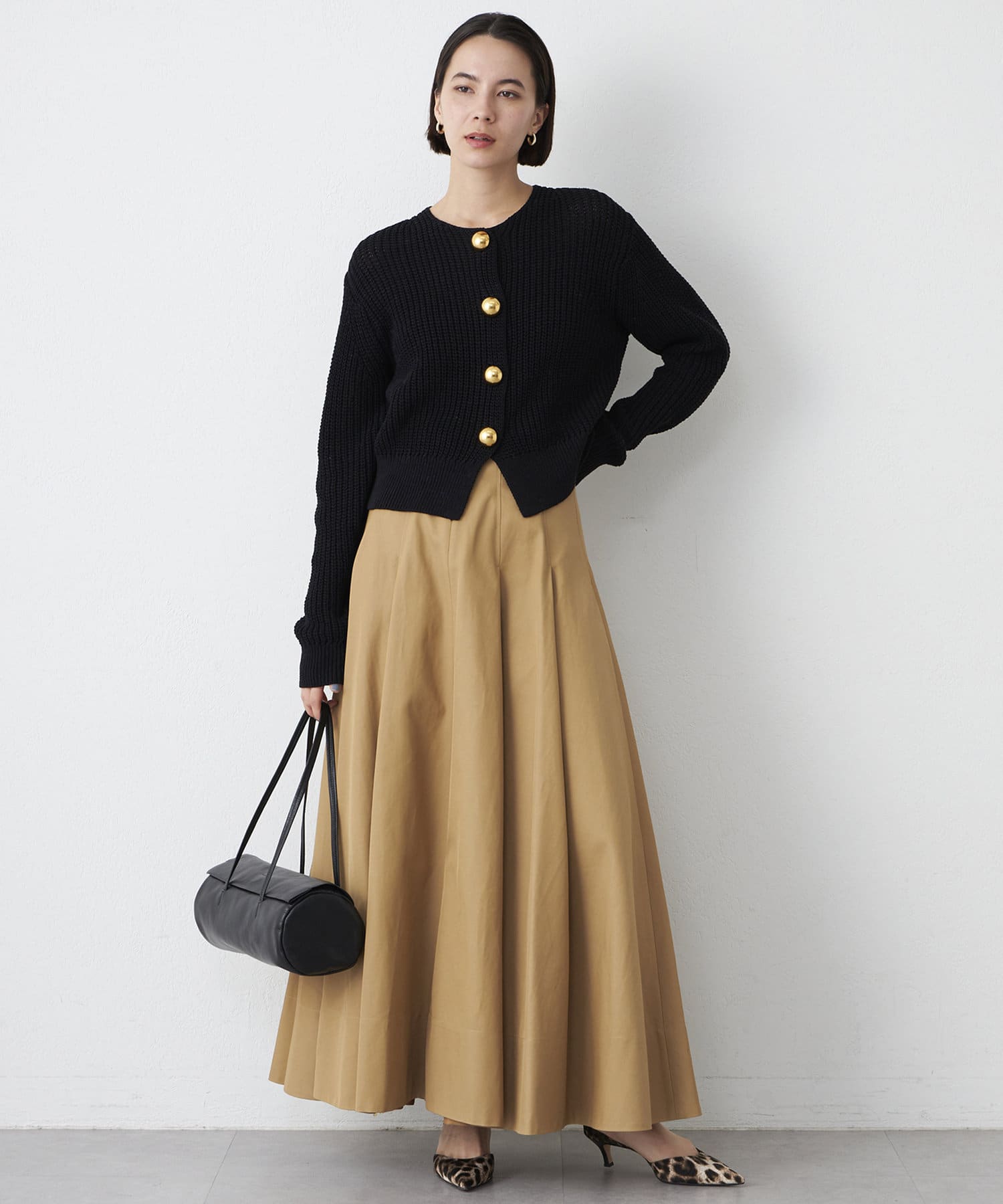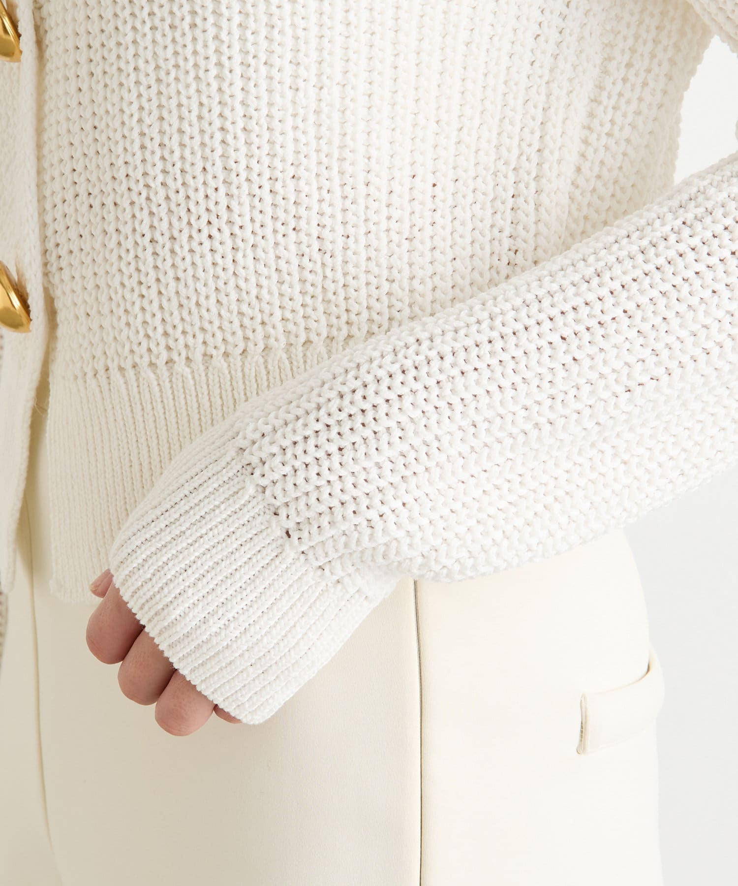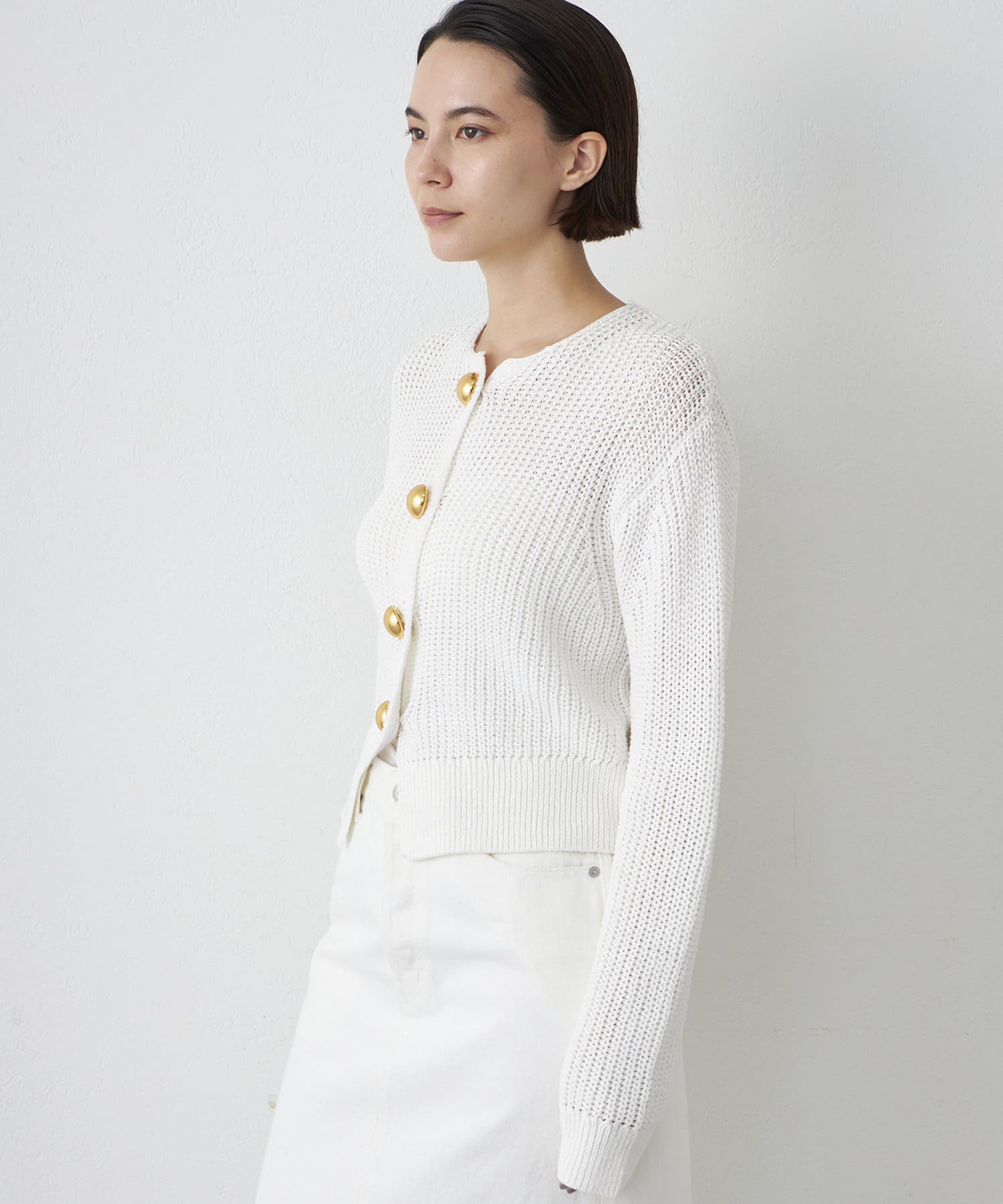 ■大きめの金ボタンがアクセサリー感覚で映えるニットカーディガン。