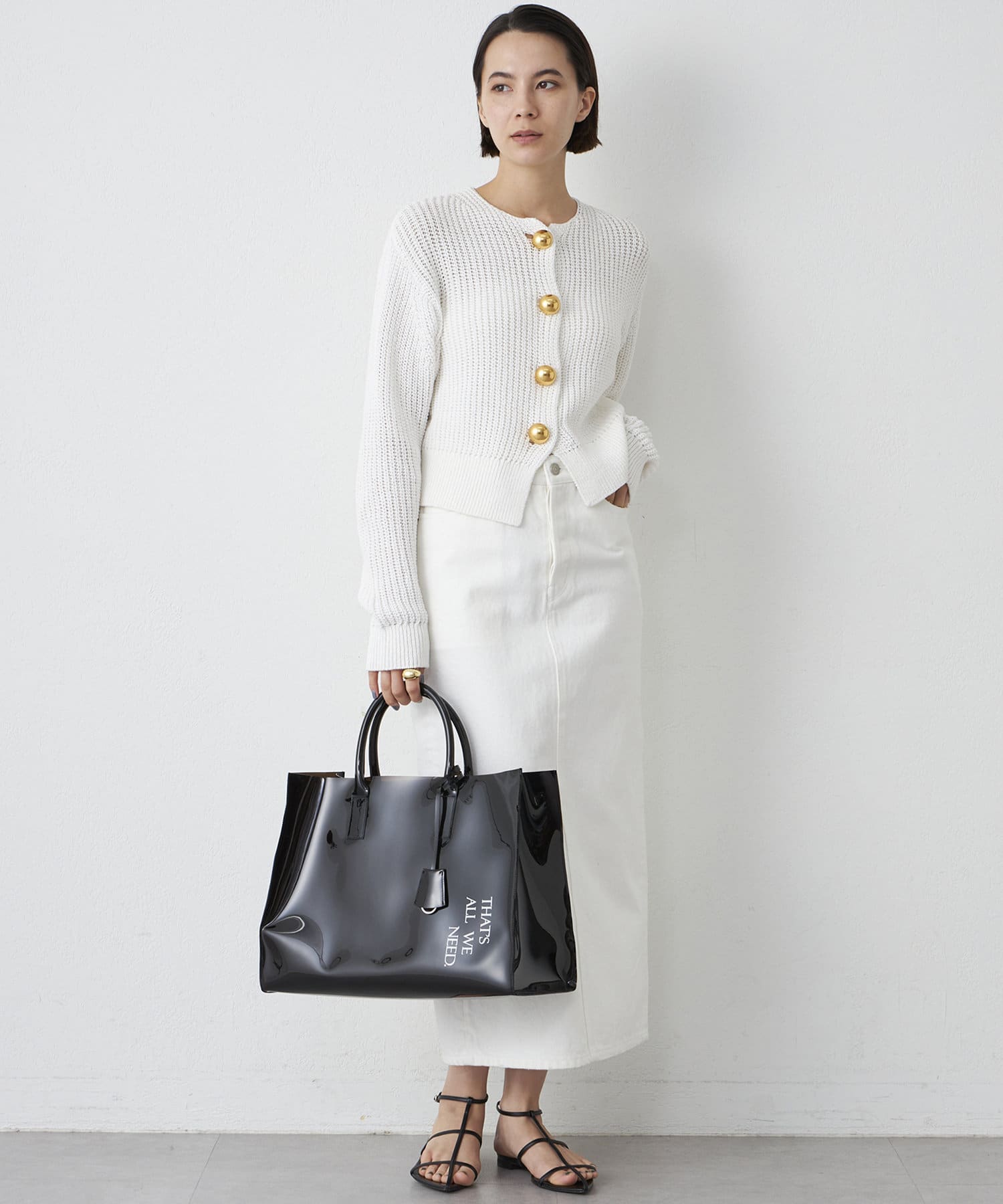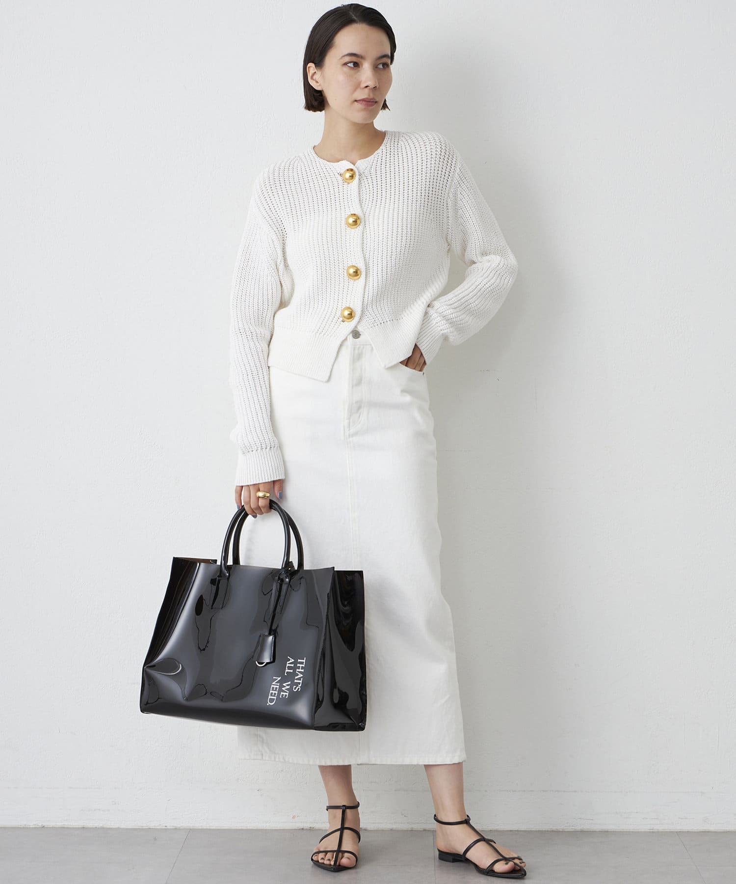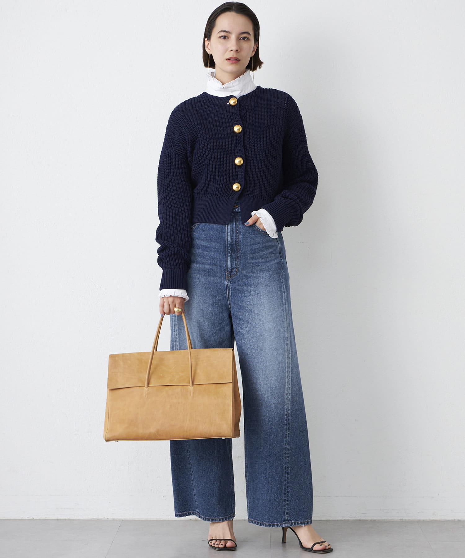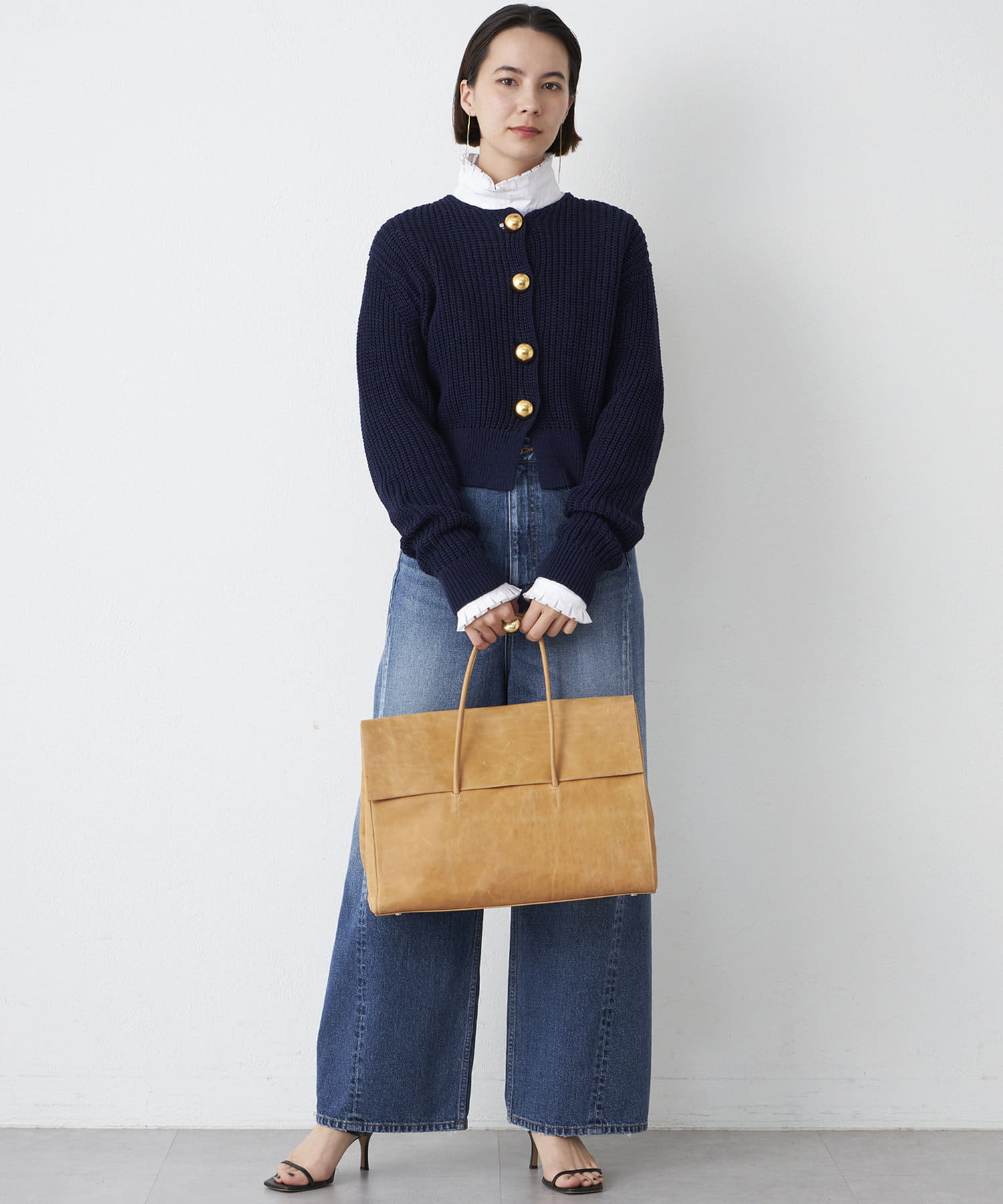 ■大きめの金ボタンがアクセサリー感覚で映えるニットカーディガン。