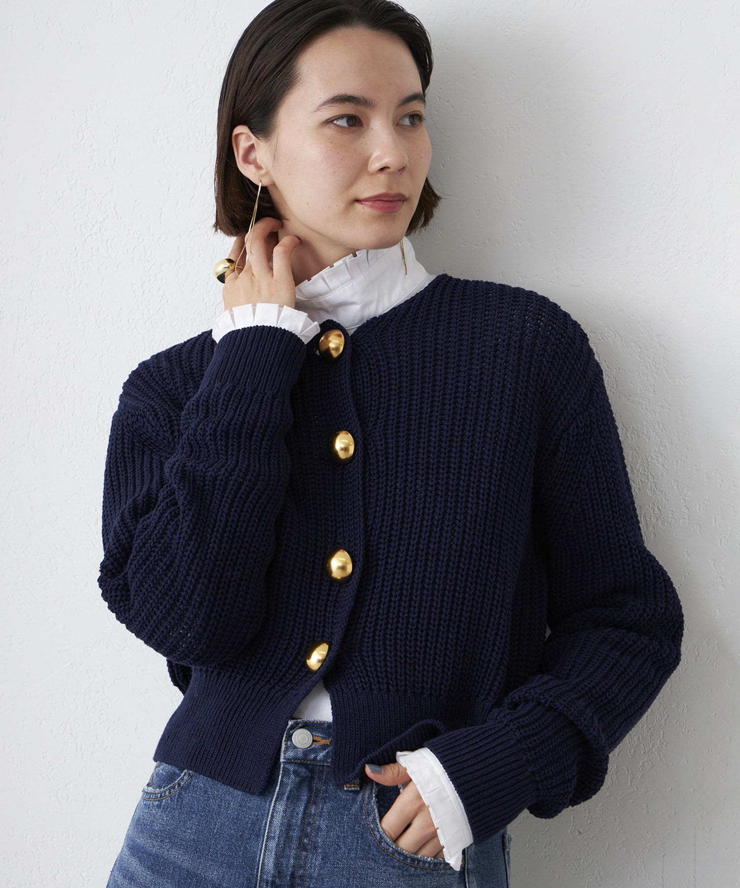 着こなしを印象的に魅せてくれる、金釦付きカーディガン