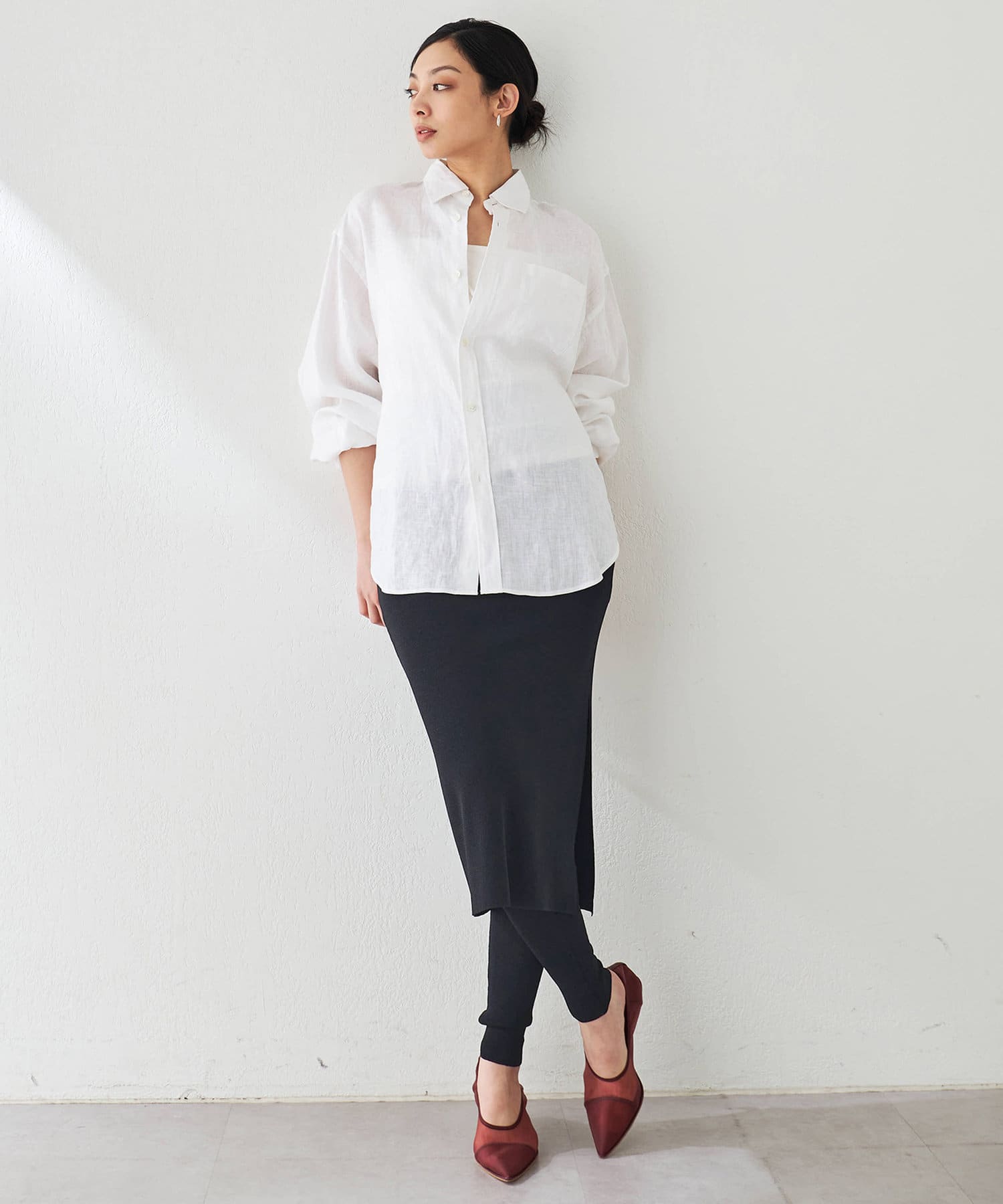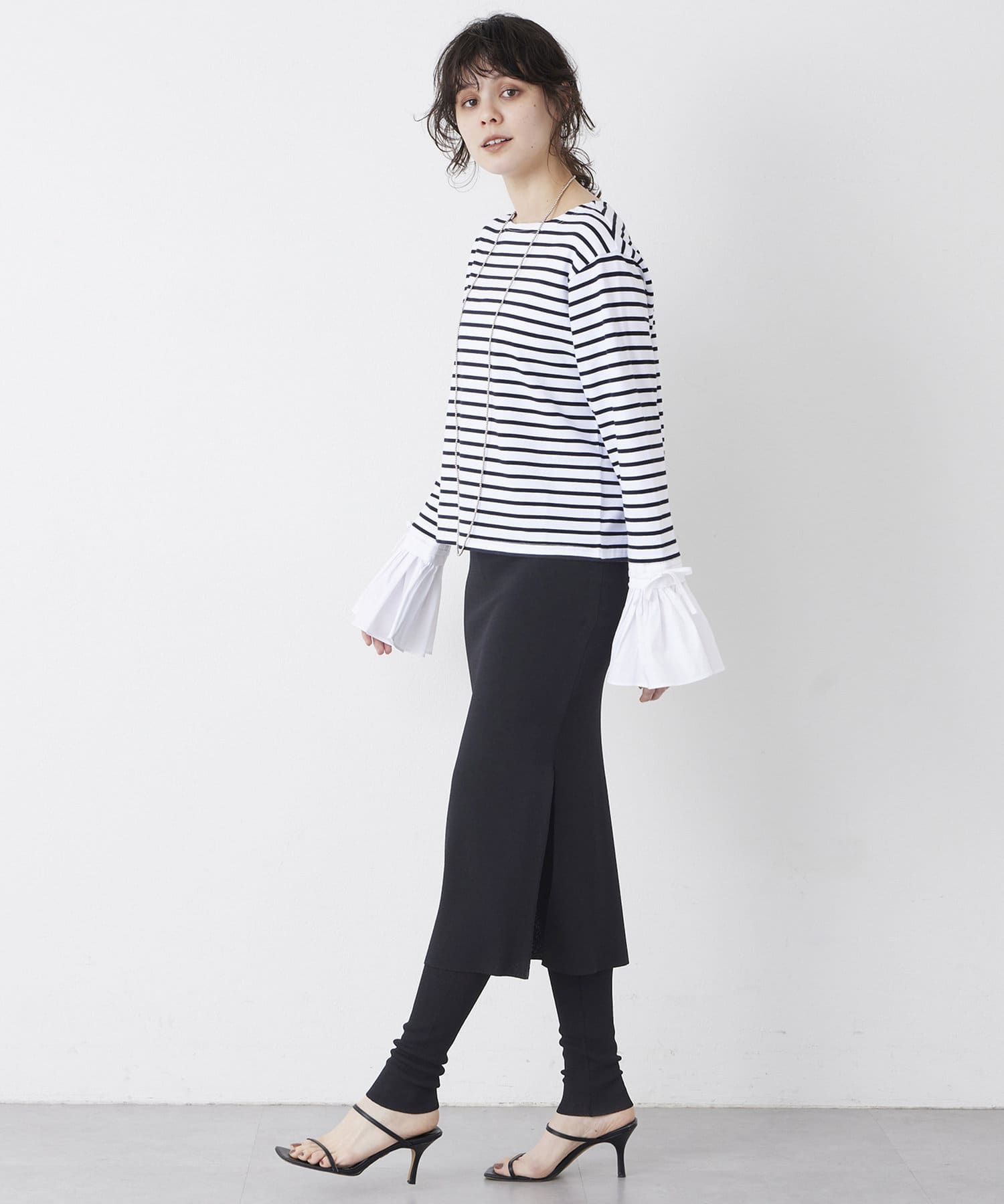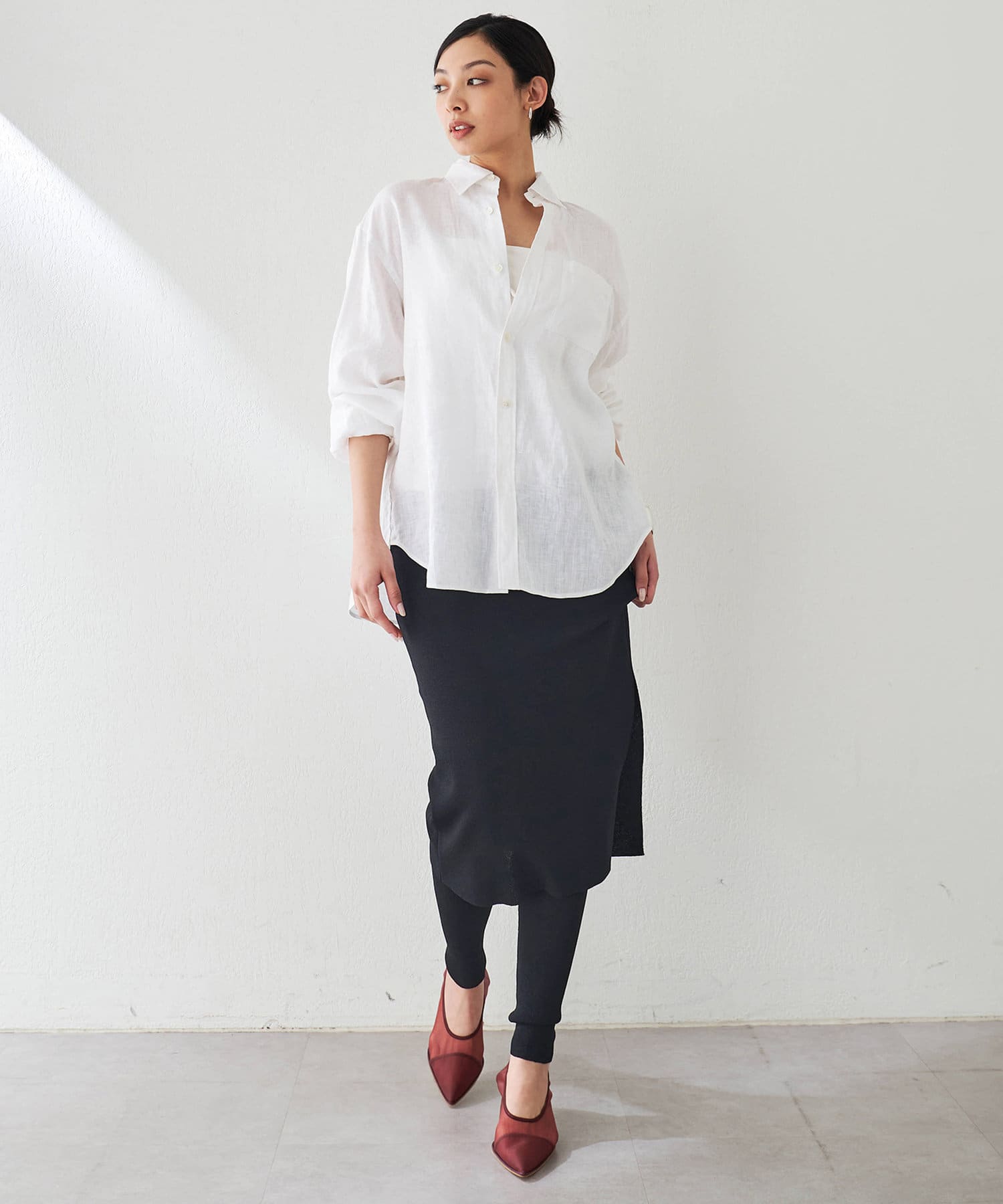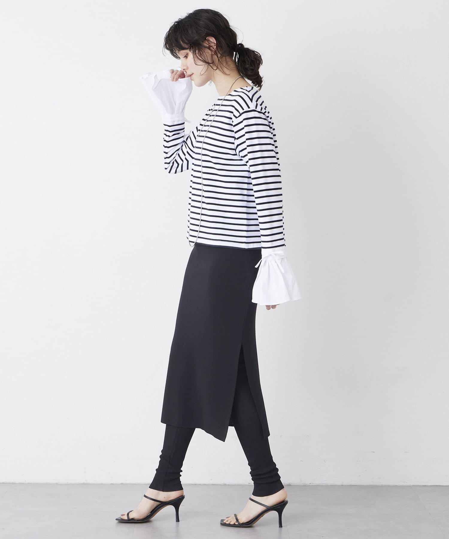■左サイドにはスリットをあしらい、重ね着風でも女性らしく抜け感のあるスタリングに。