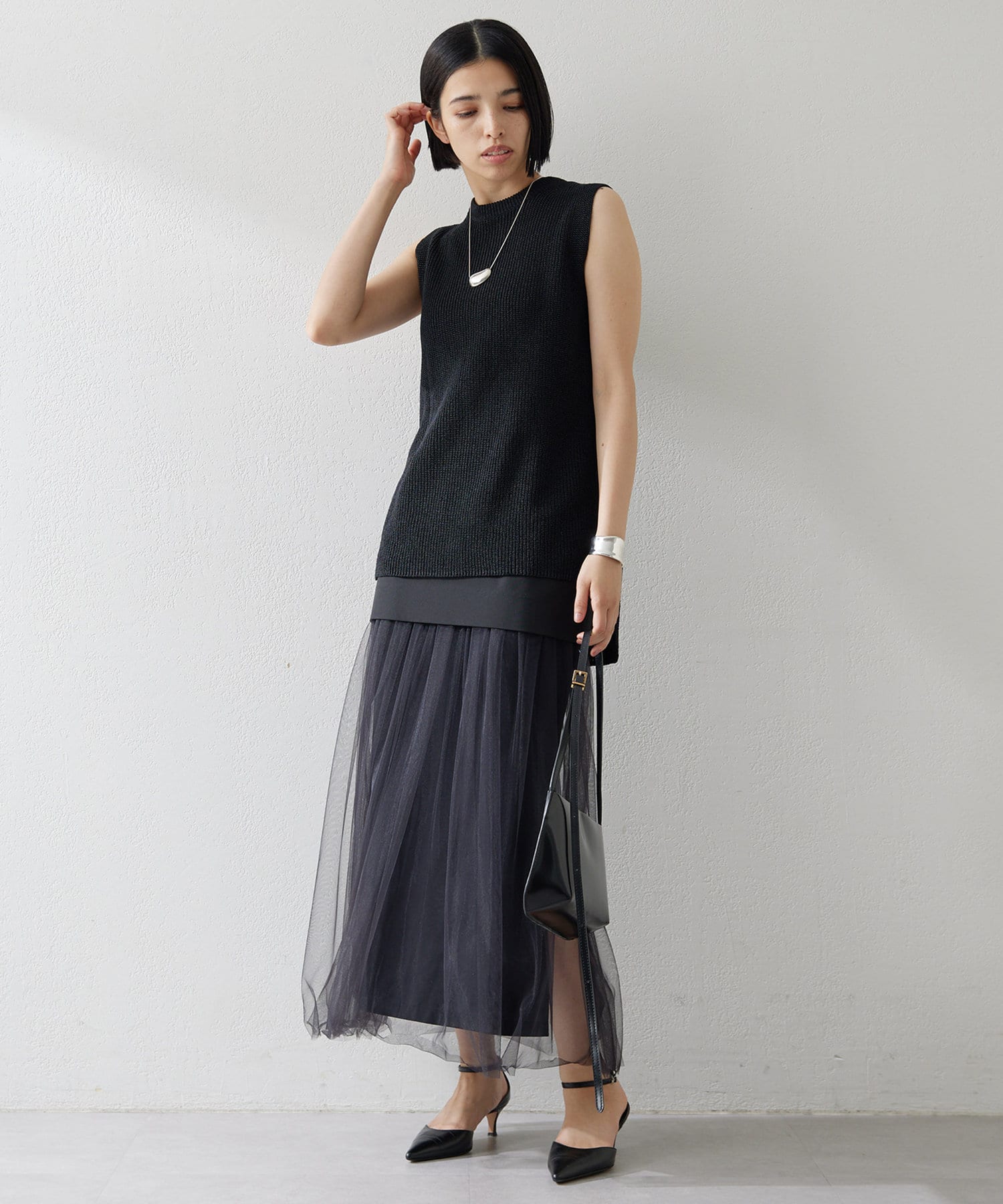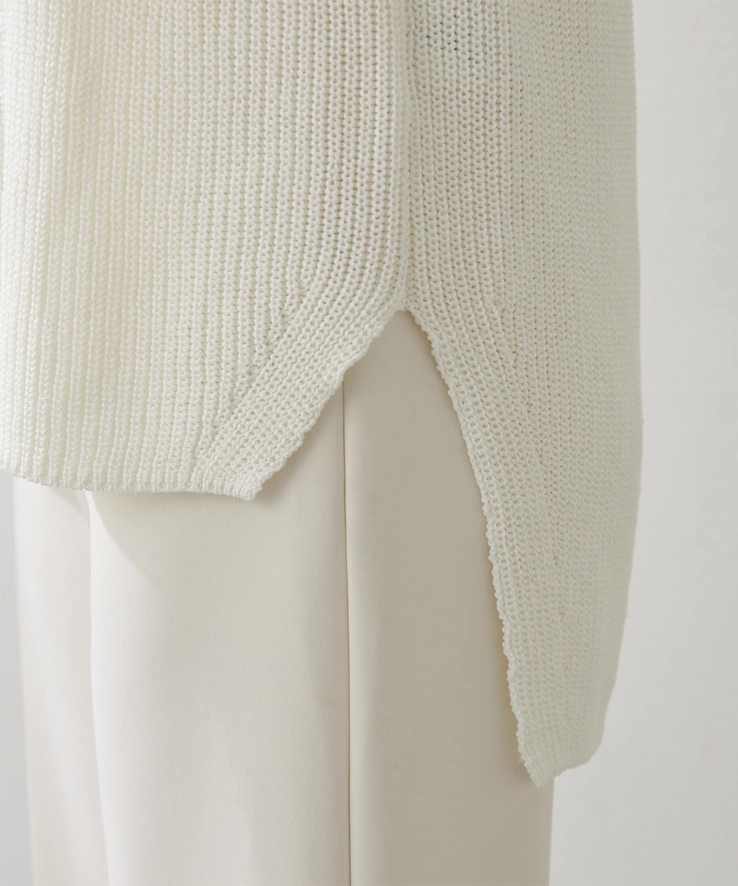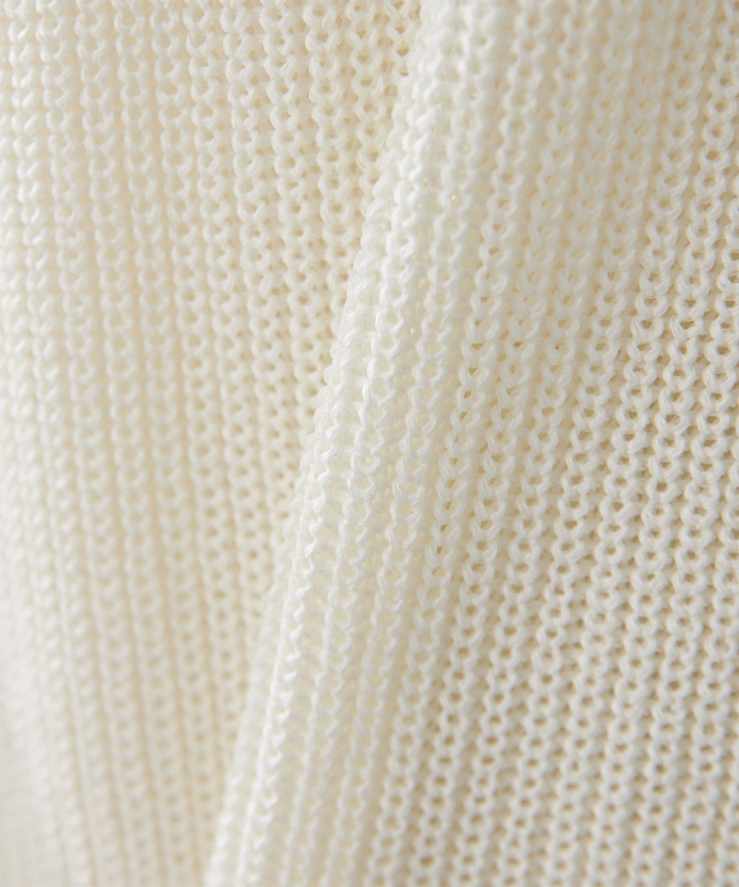 いろんなデザインでいろんなローゲージのものが出ていますが、こちらはそこまで透け感もなく丈もしっかりあって、スタッフの方にスカートとコーディネートしてもらい、右脇だけ入れて左脇はアウトするような着方をアレンジしてもらって、それがとても素敵でした。