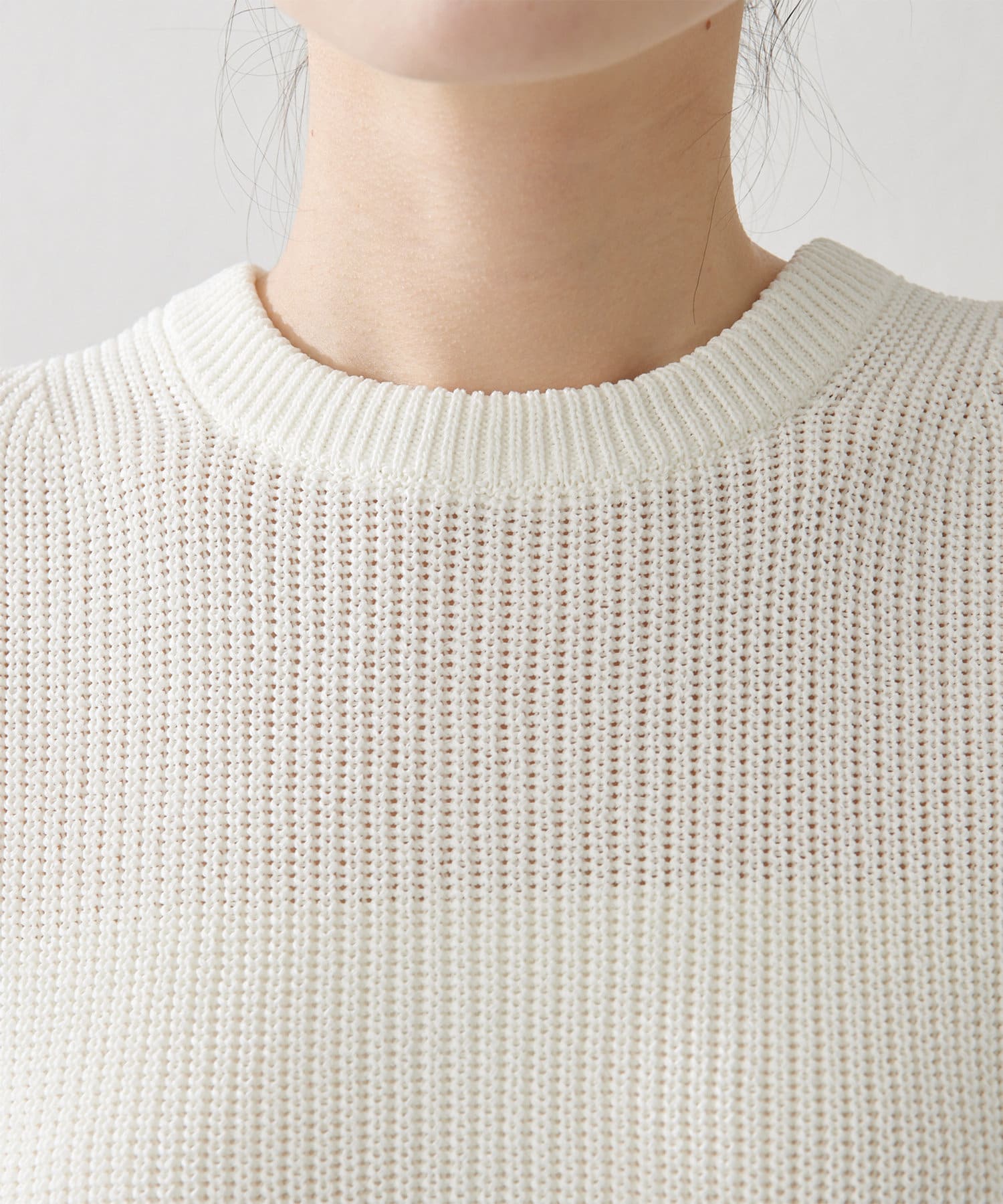 真夏でも抵抗なく着られる軽やかなサマーニット。パンツもスカートも合わせやすいシルエットで使いやすいです。肩周りのライン的には少しブラ紐が見えやすい時があり、気をつけながら着るか、見えても抵抗がないストラップのものを合わせるようにしています。