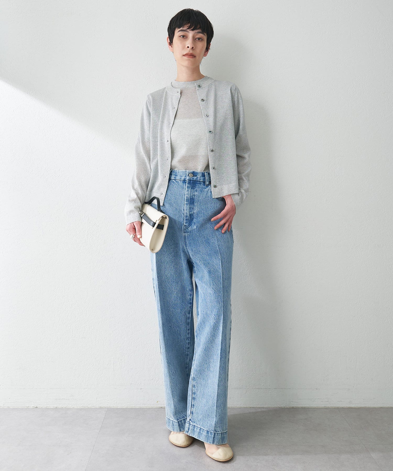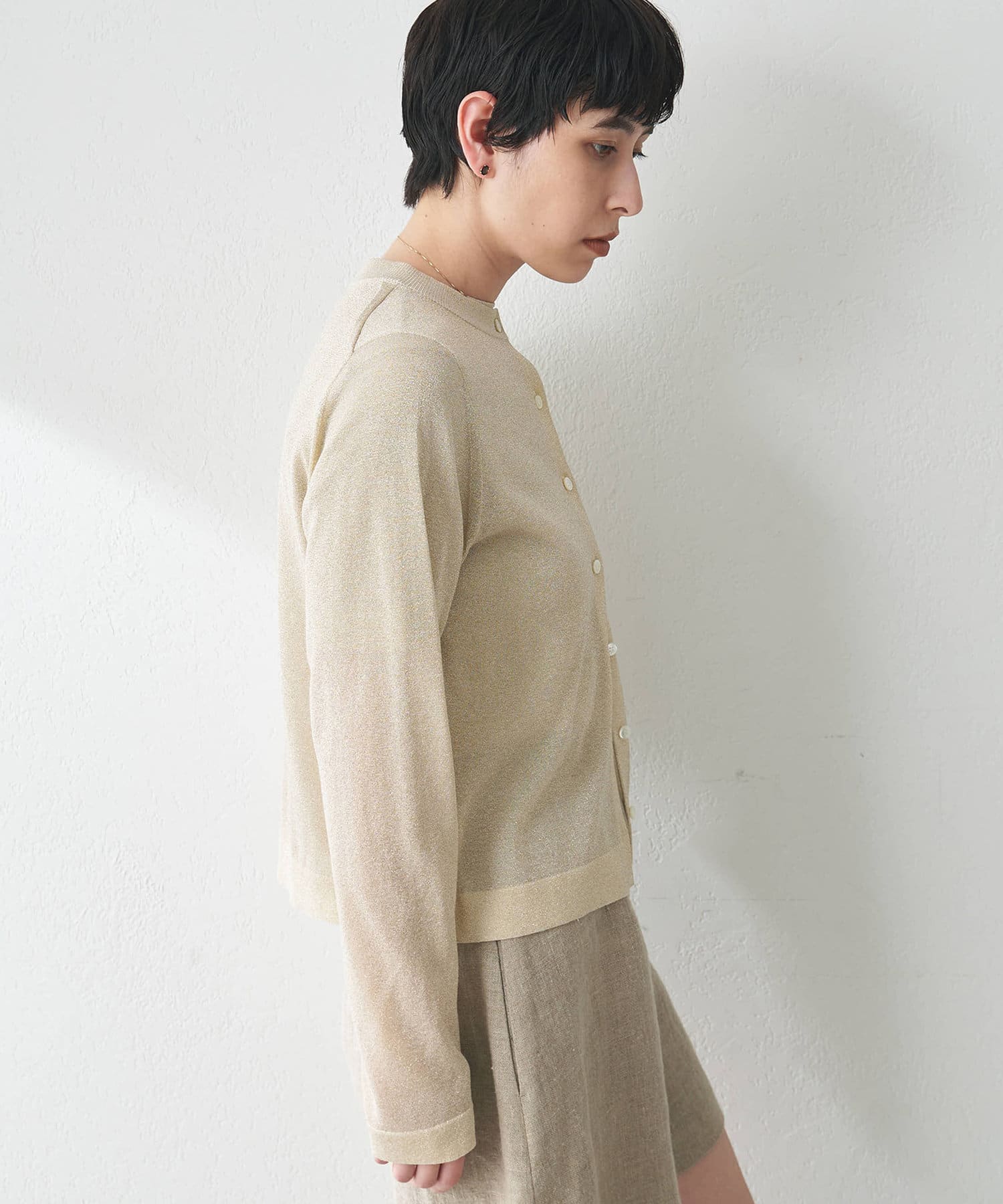 ■上品に煌めくラメの表情が華やかなニットカーディガン。