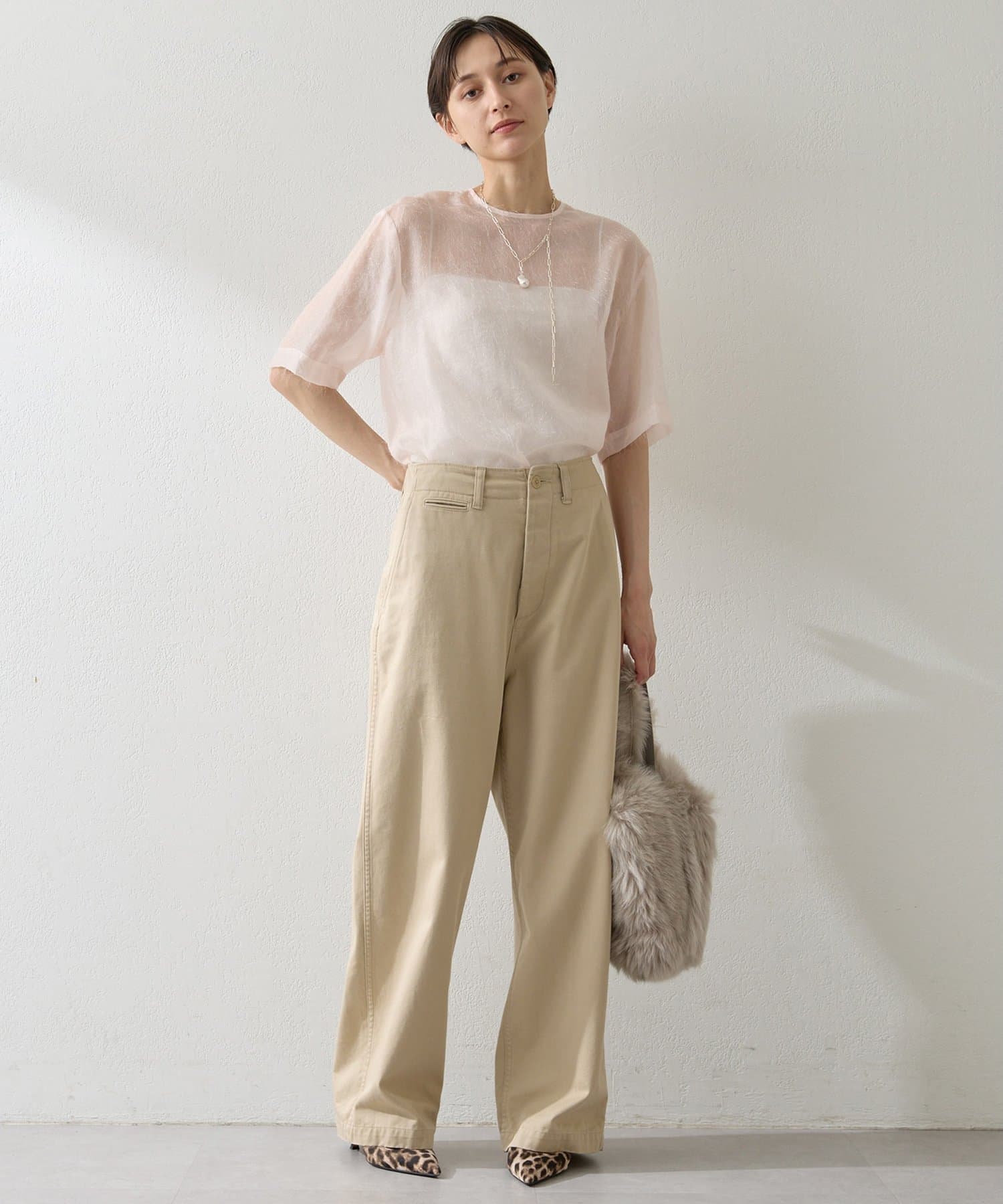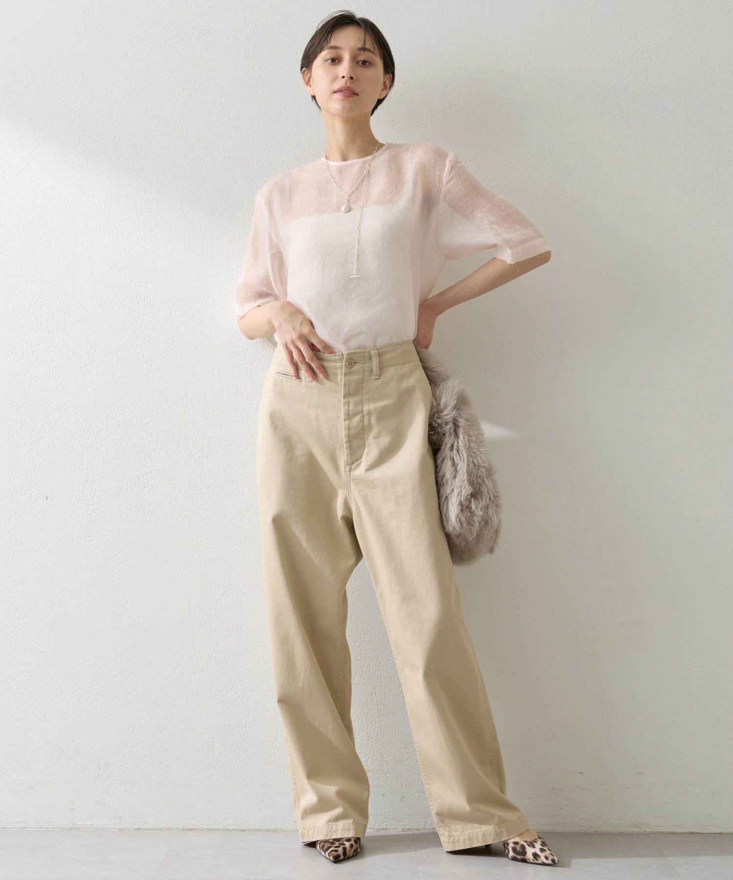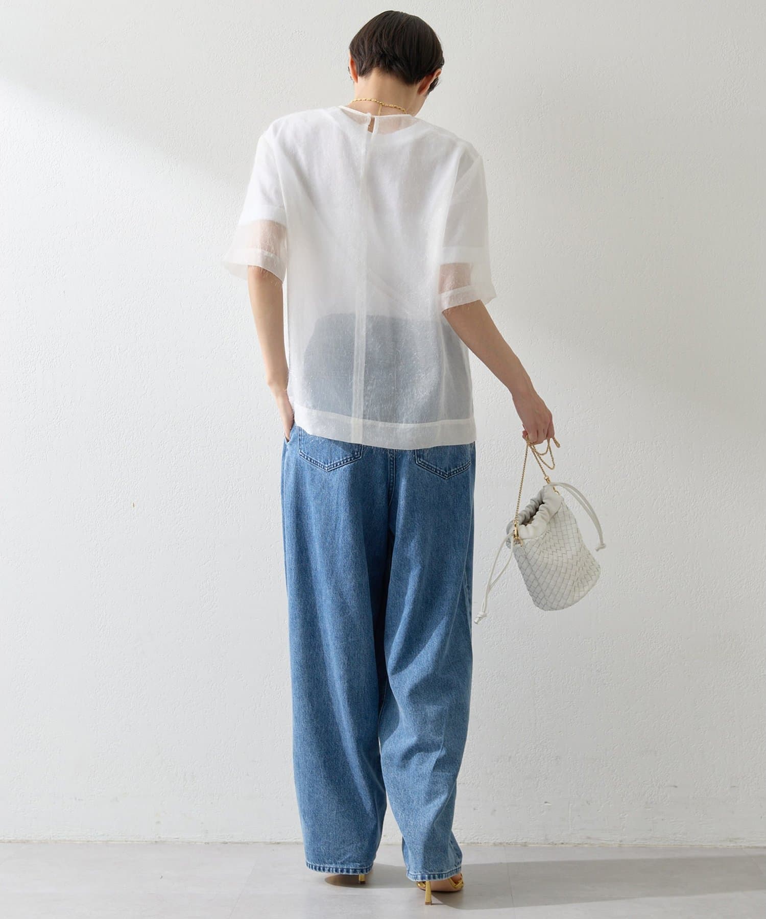 ■シアーな表情を活かして、ベアトップやタンクトップ、ブラトップやロゴTシャツなどインナーアレンジを楽しむのも◎。